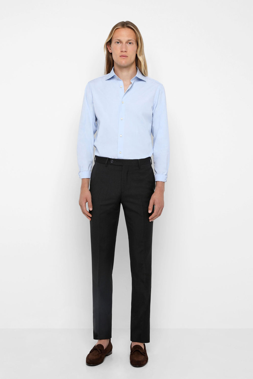 Calças confecionadas em algodão. Corte Slim Fit, fecho com botão visível e zip. Dois bolsos laterais e dois posteriores com botão. Têm presilhas.