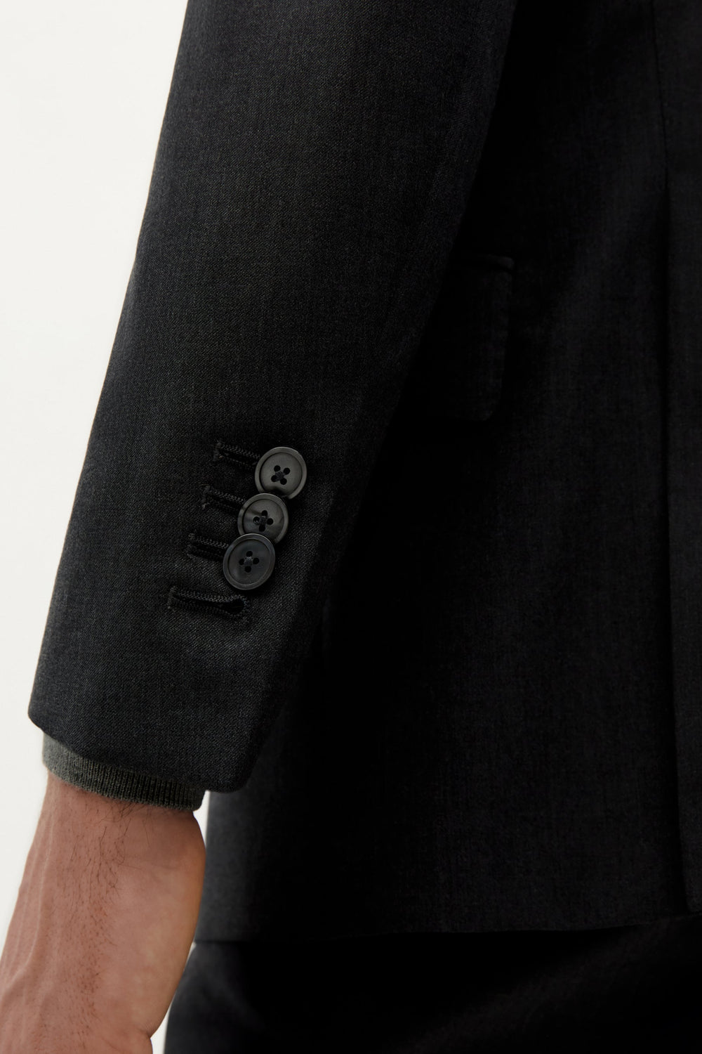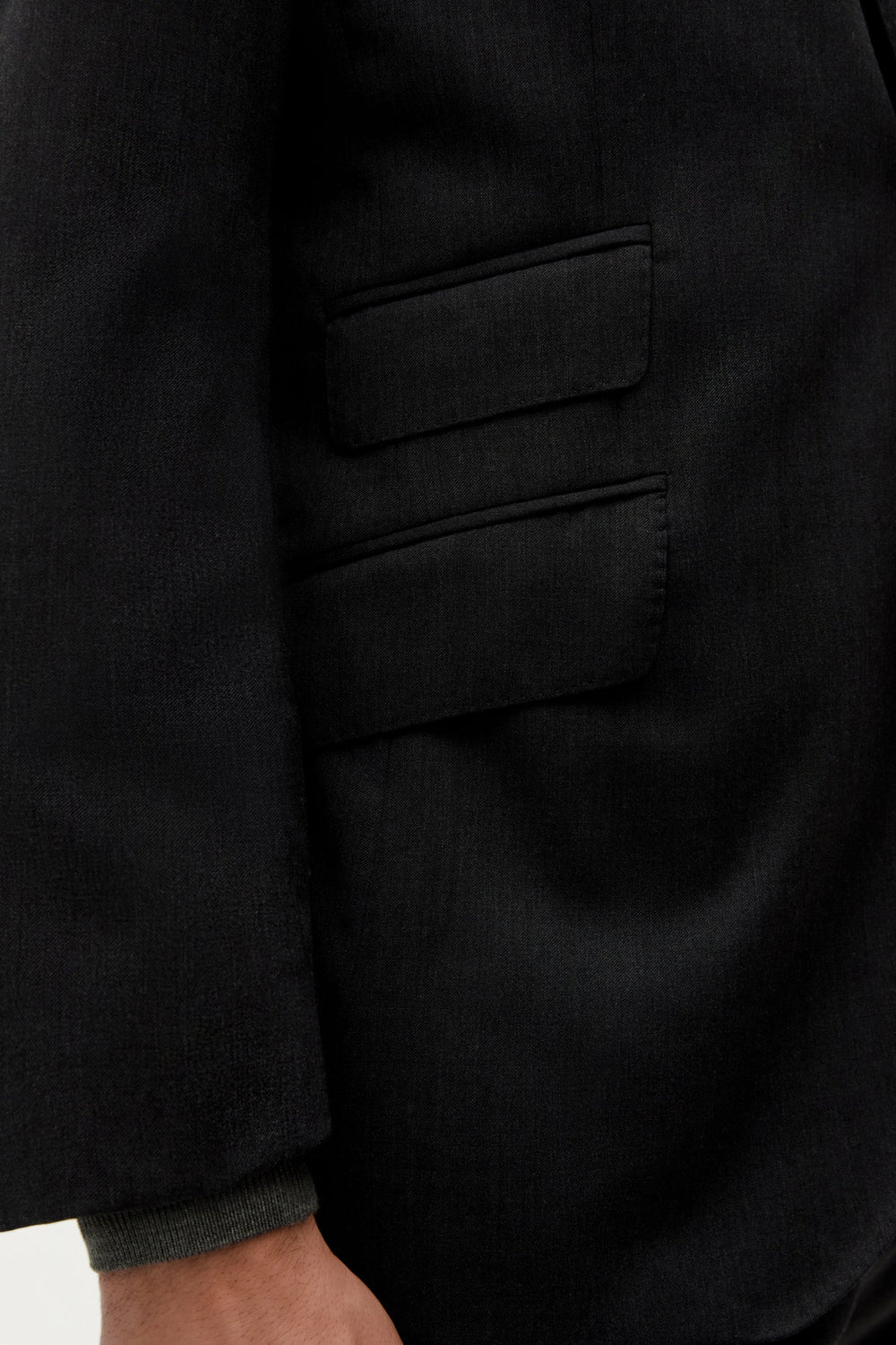 - Americana con solapas de muesca con punta redondeada, cierre con dos botones. Manga con hombrera armada. Bolsillos con solapas.