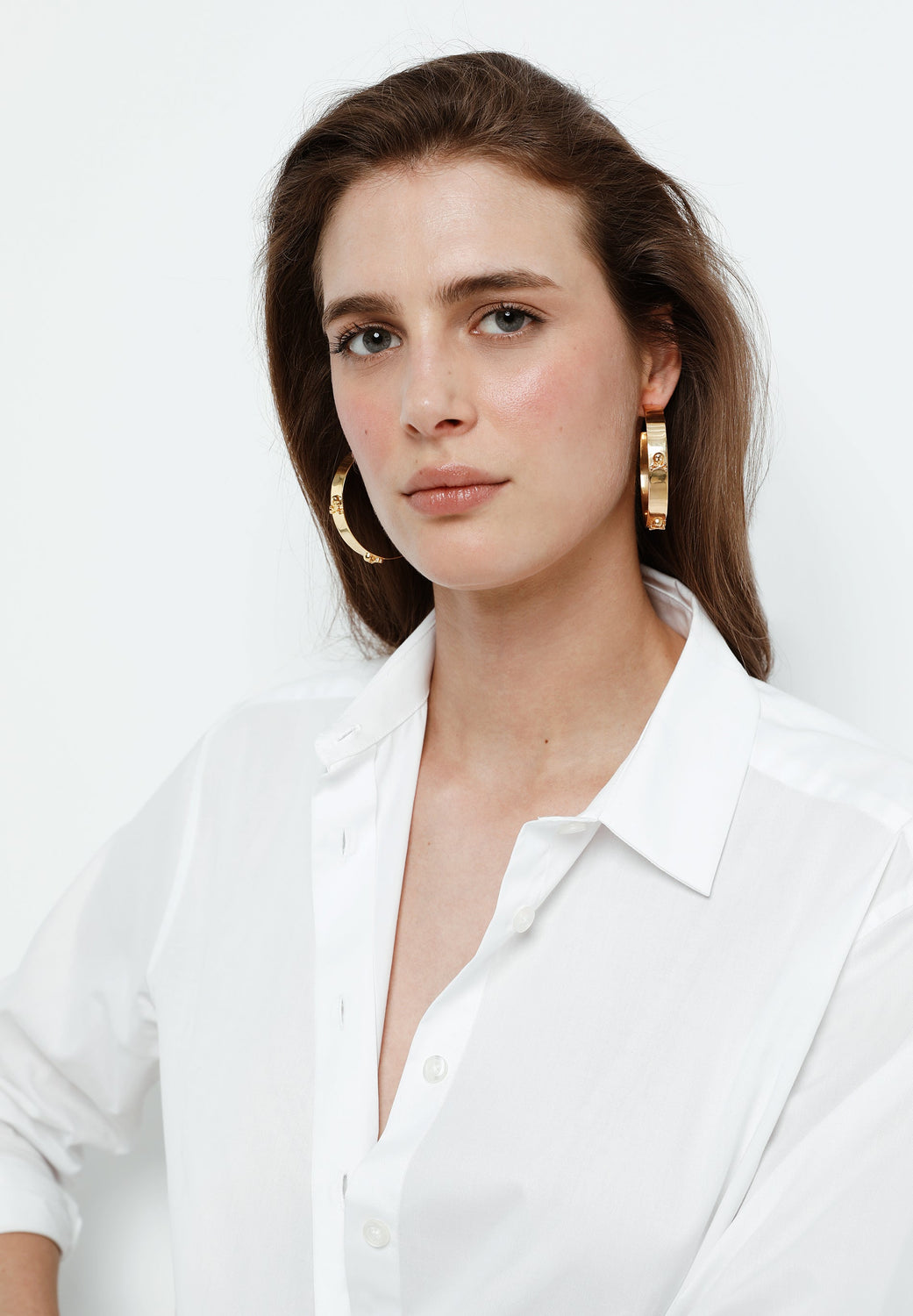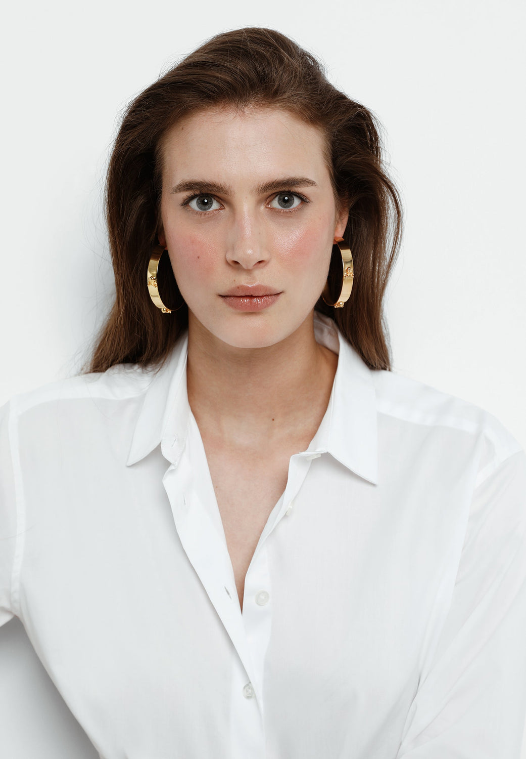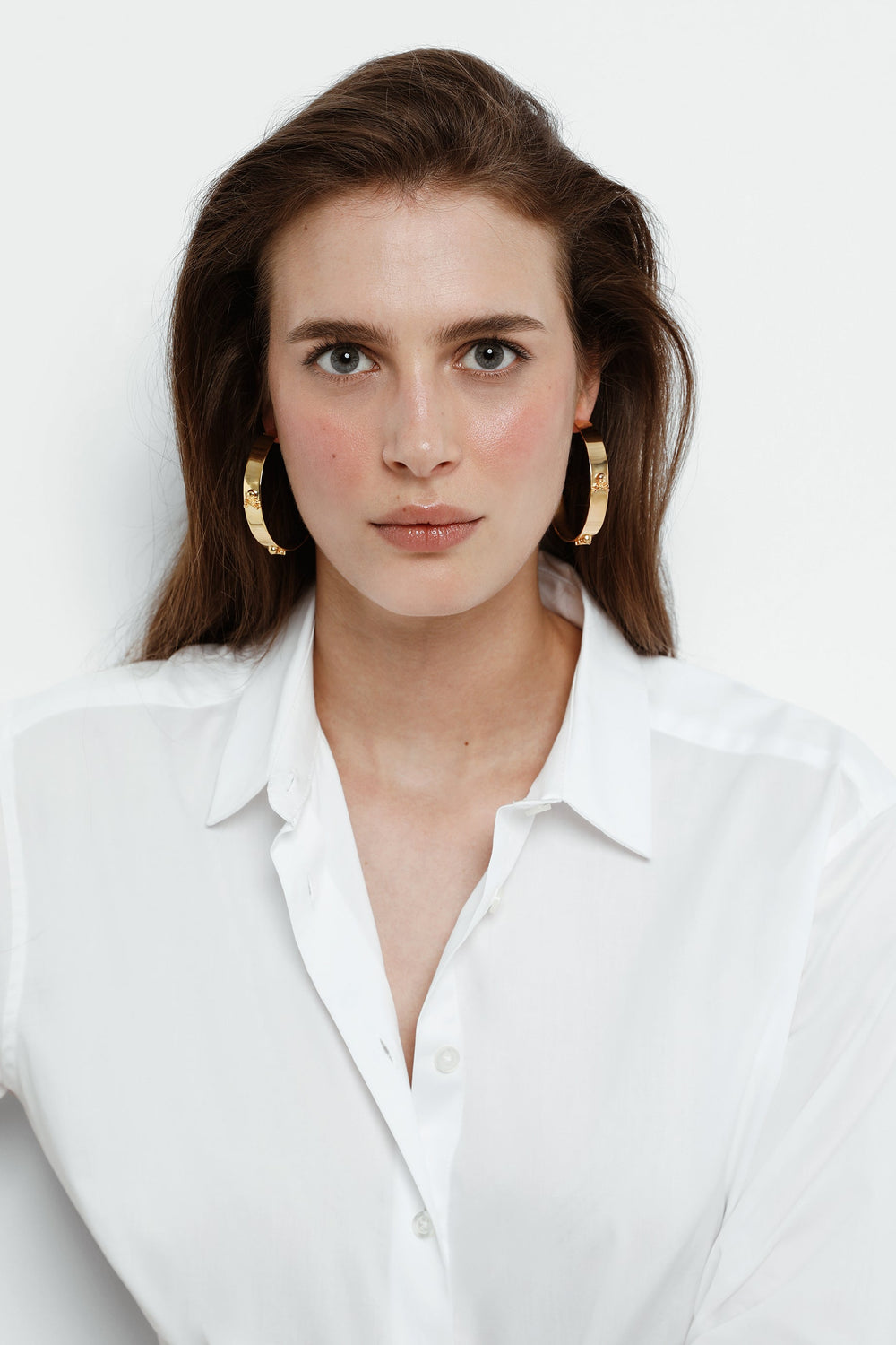 Brincos de argolas de bronze banhado a ouro de 18 K. Fecho de pressão e pormenor de logótipo.