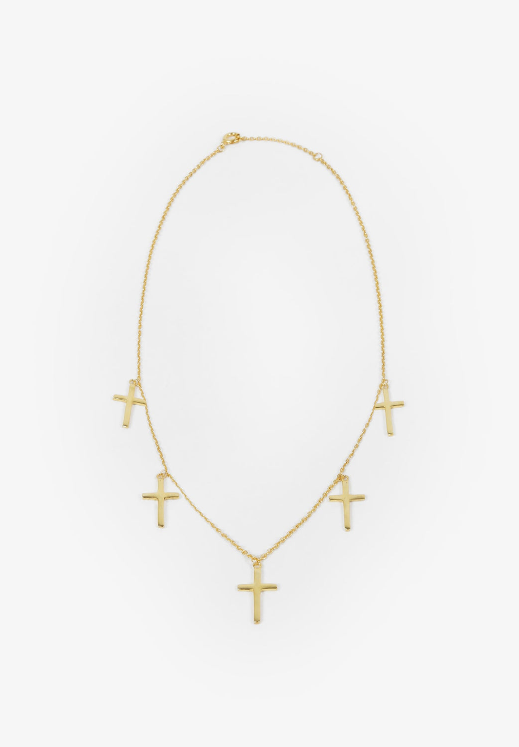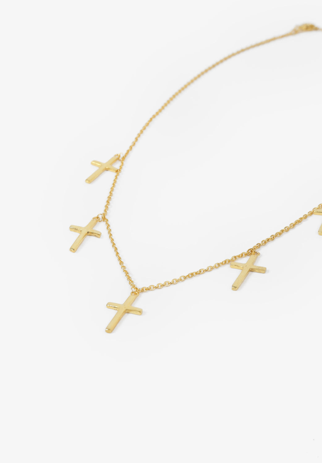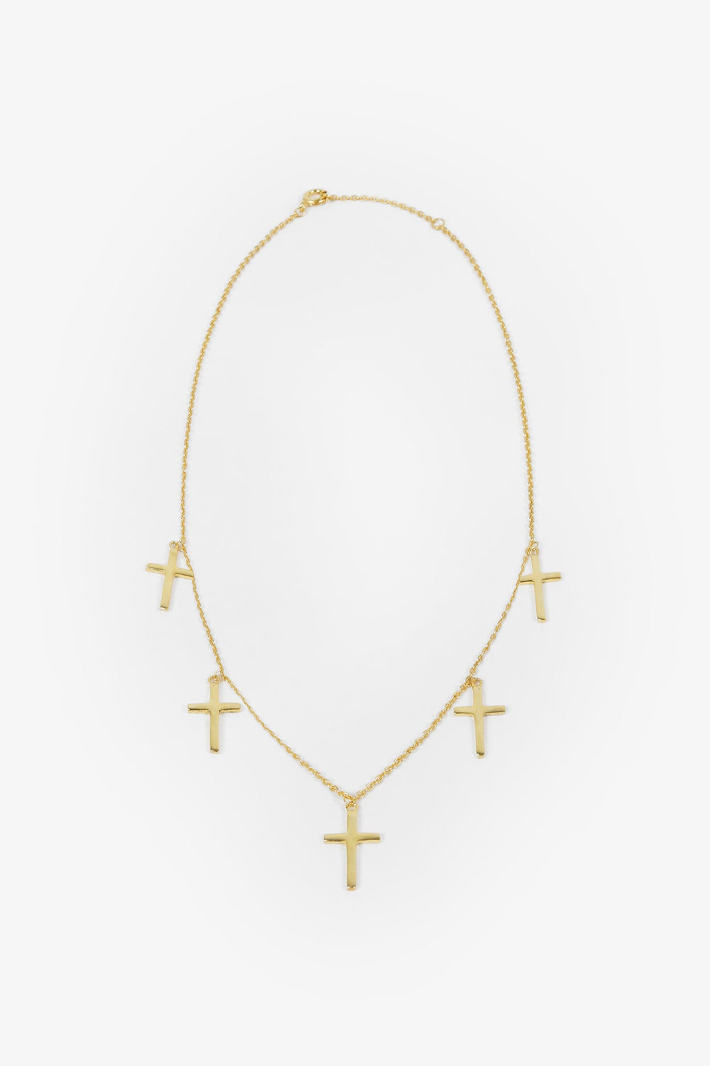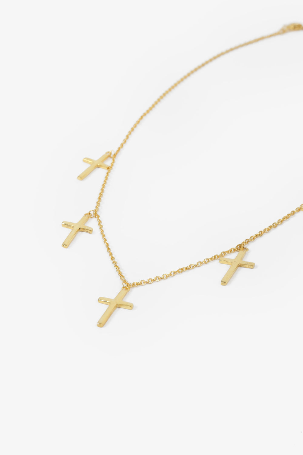 Colar de corrente de bronze banhada a ouro de 18 K. Fecho com mosquetão e cruzes.