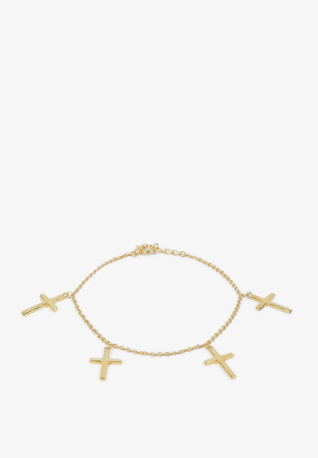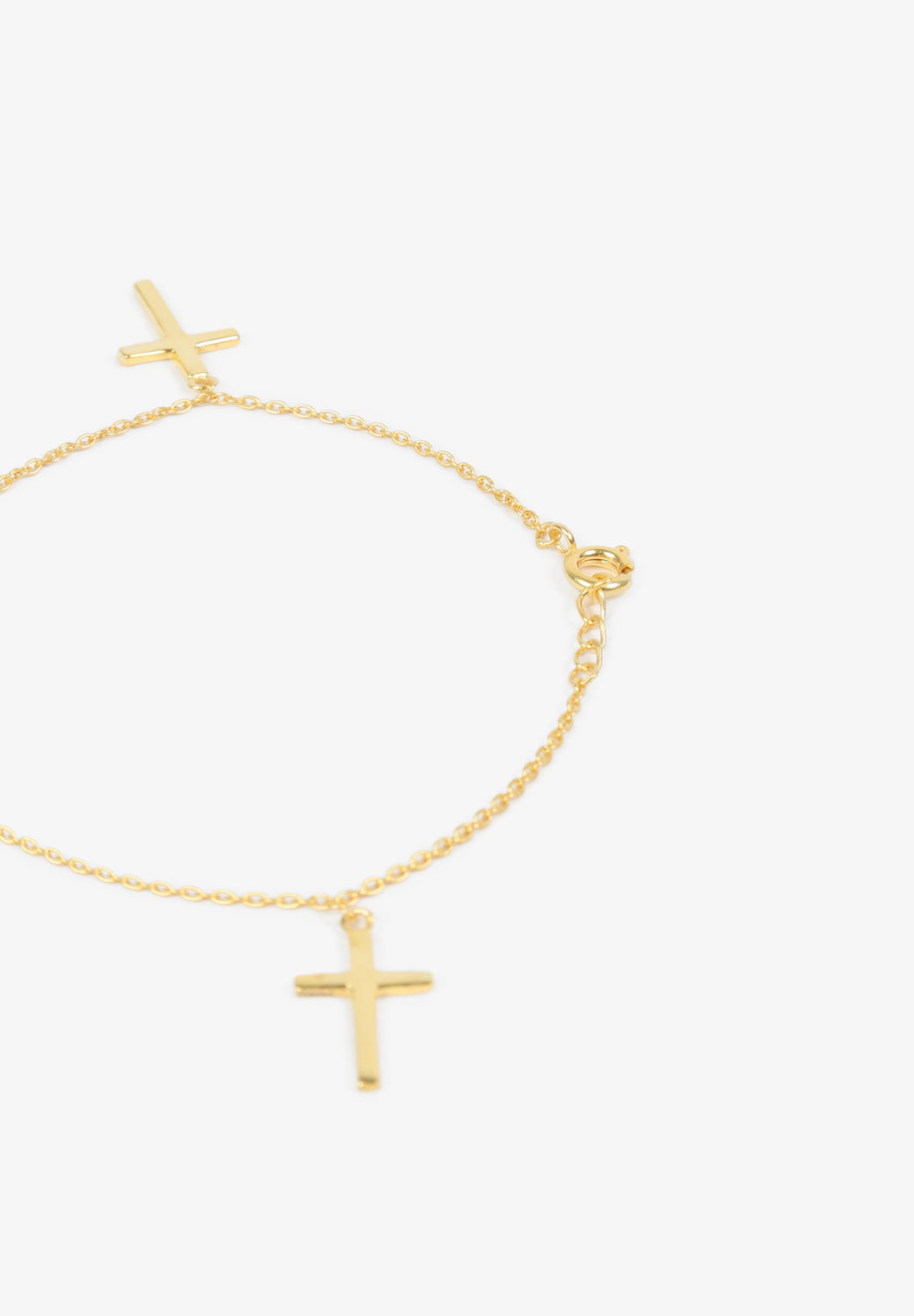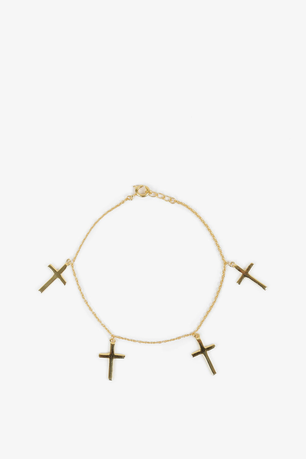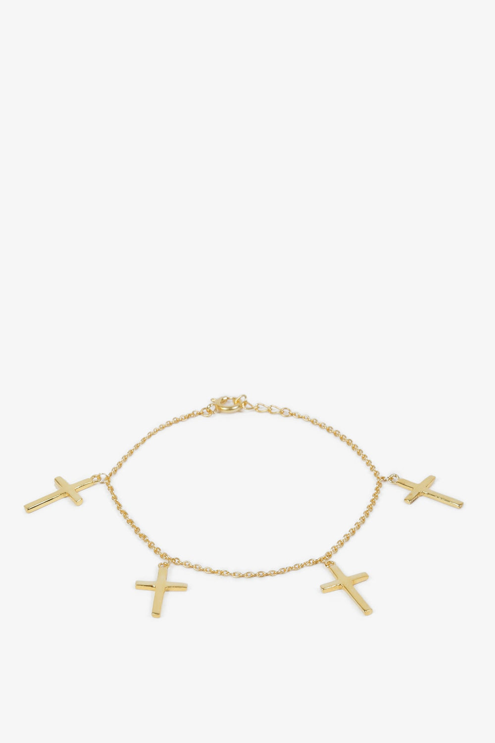 Pulseira de corrente de bronze banhada a ouro de 18 K. Fecho com mosquetão e cruzes.