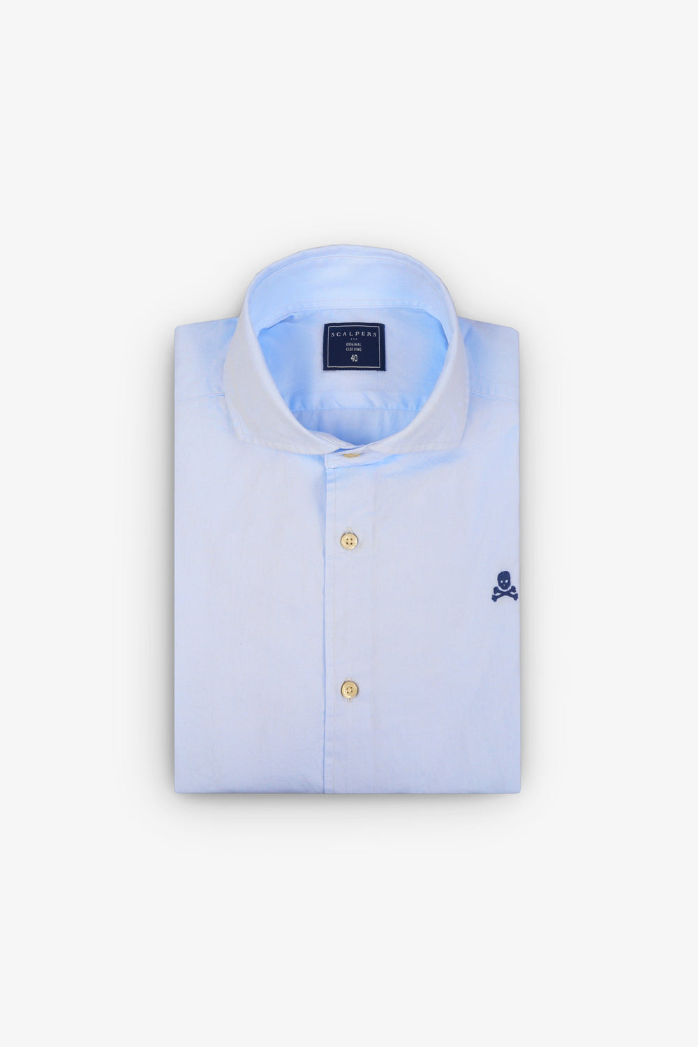 Camisa clássica lisa. Confecionada em tecido 100% algodão. Corte Regular Fit. Gola cutaway. Fecho com botões. Manga comprida terminada em punho simples. Pormenor de skull bordada no peito.