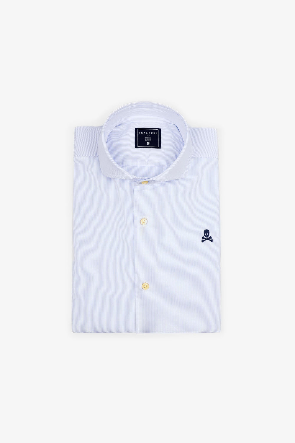 Camisa de vestir lisa. Confeccionada en tejido 100% algodón. Corte Regular Fit. Cuello cutaway. Cierre con botones. Manga larga terminada en puño simple. Detalle de calavera bordada en el pecho.