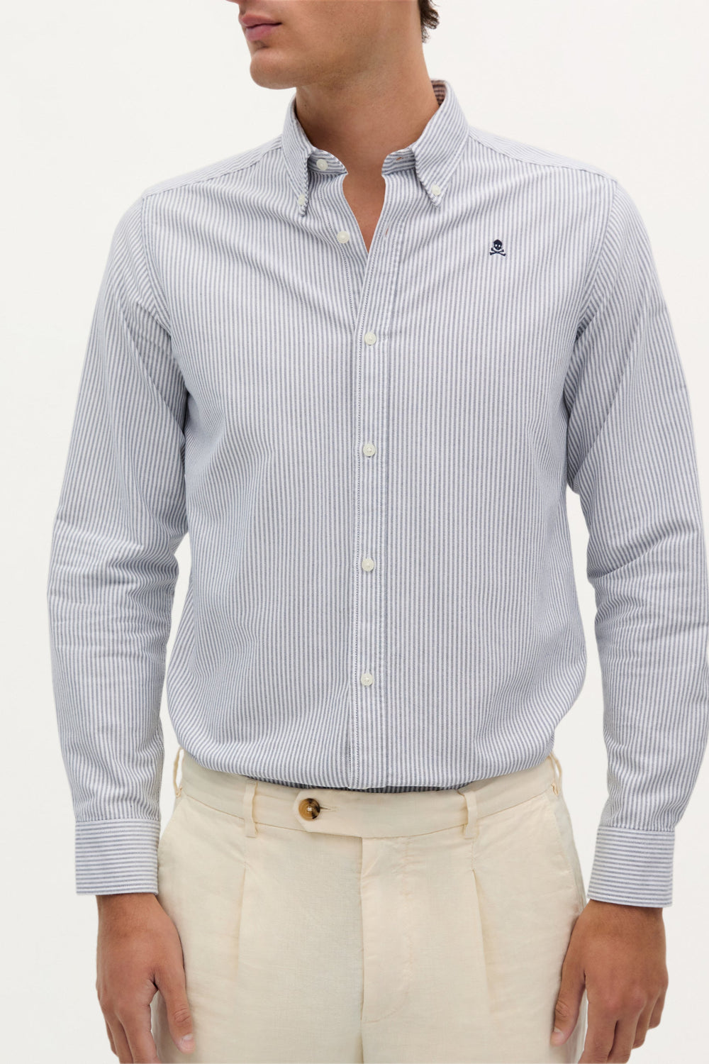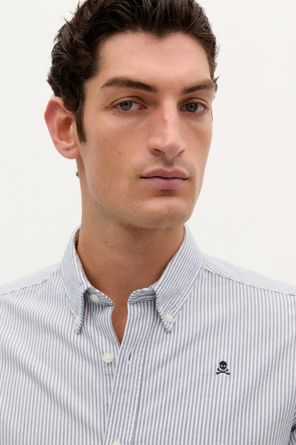 Camisa Oxford às riscas com caveira em contraste. Confeccionada em 100% algodão. Corte Regular Fit. Gola com botões. Fecho com botões. Manga comprida terminada em punho simples.