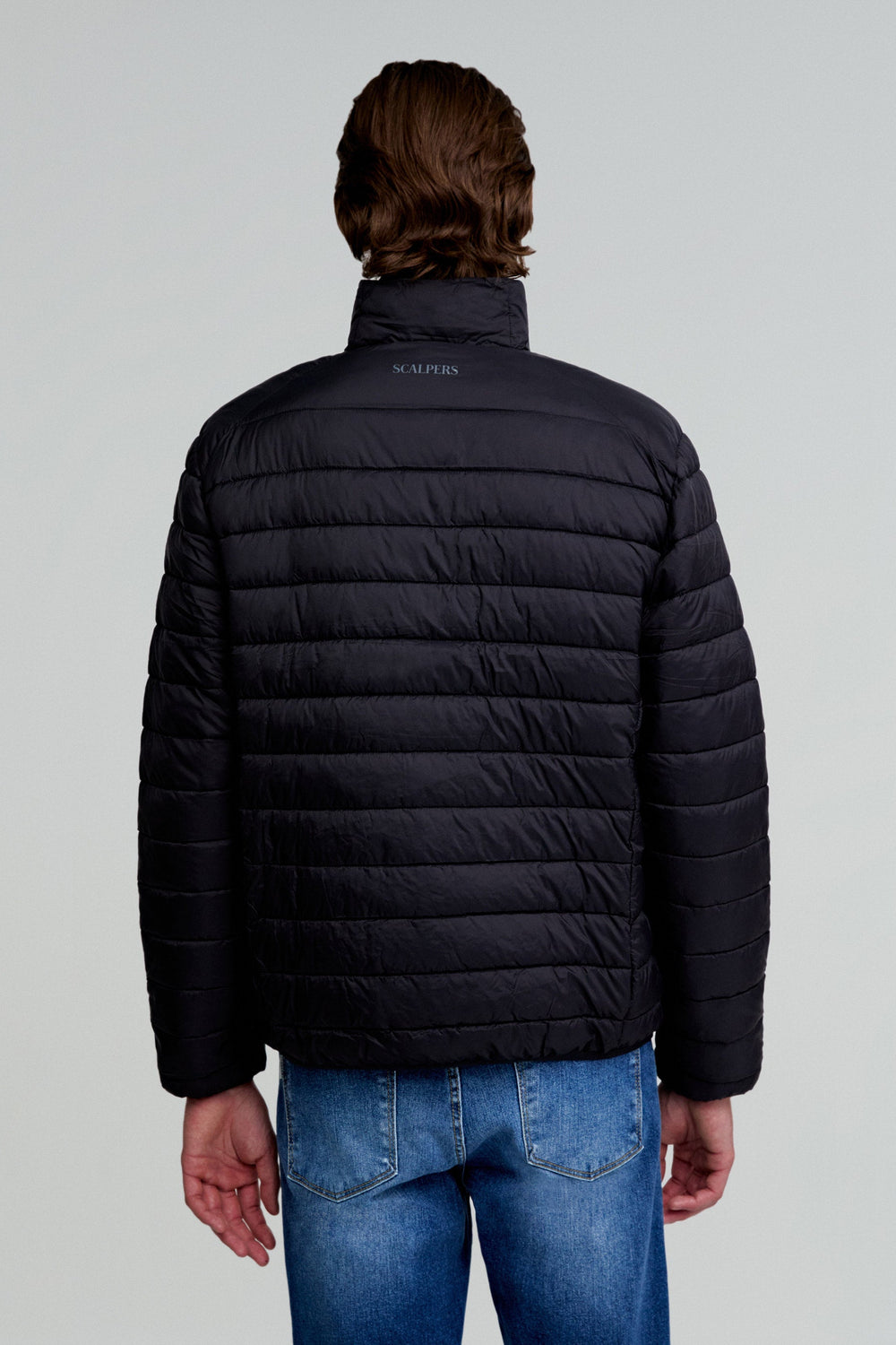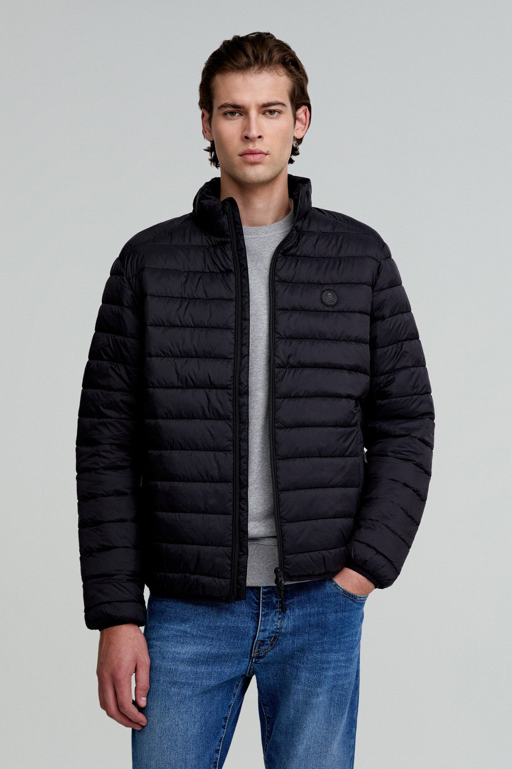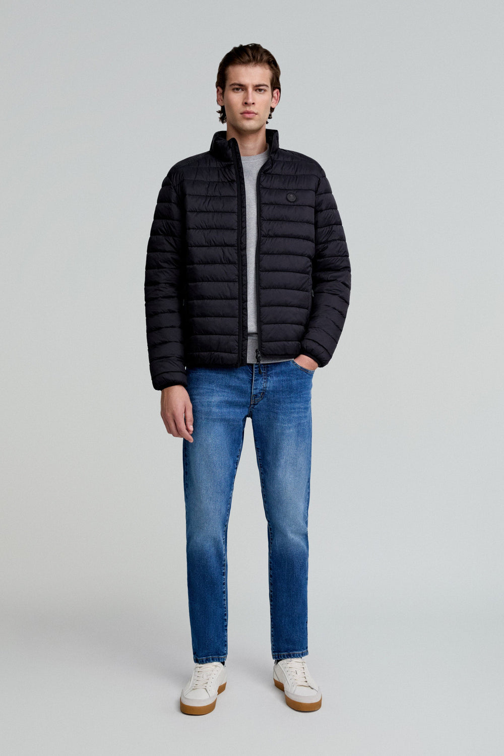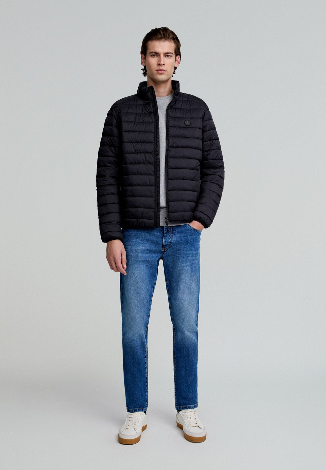 Casaco acolchoado confeccionado em tecido de nylon e poliéster reciclado water repellent. Corte Slim Fit, gola subida e fecho com fecho de correr de duplo cursor. Manga comprida. Bolsos com fecho de correr e bolso interior. Detalhe de emblema de borracha no peito. Inclui bolsa para o guardar e usar como almofada de pescoço.