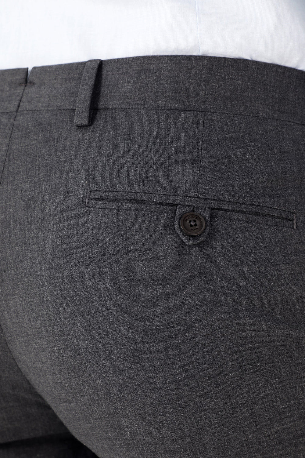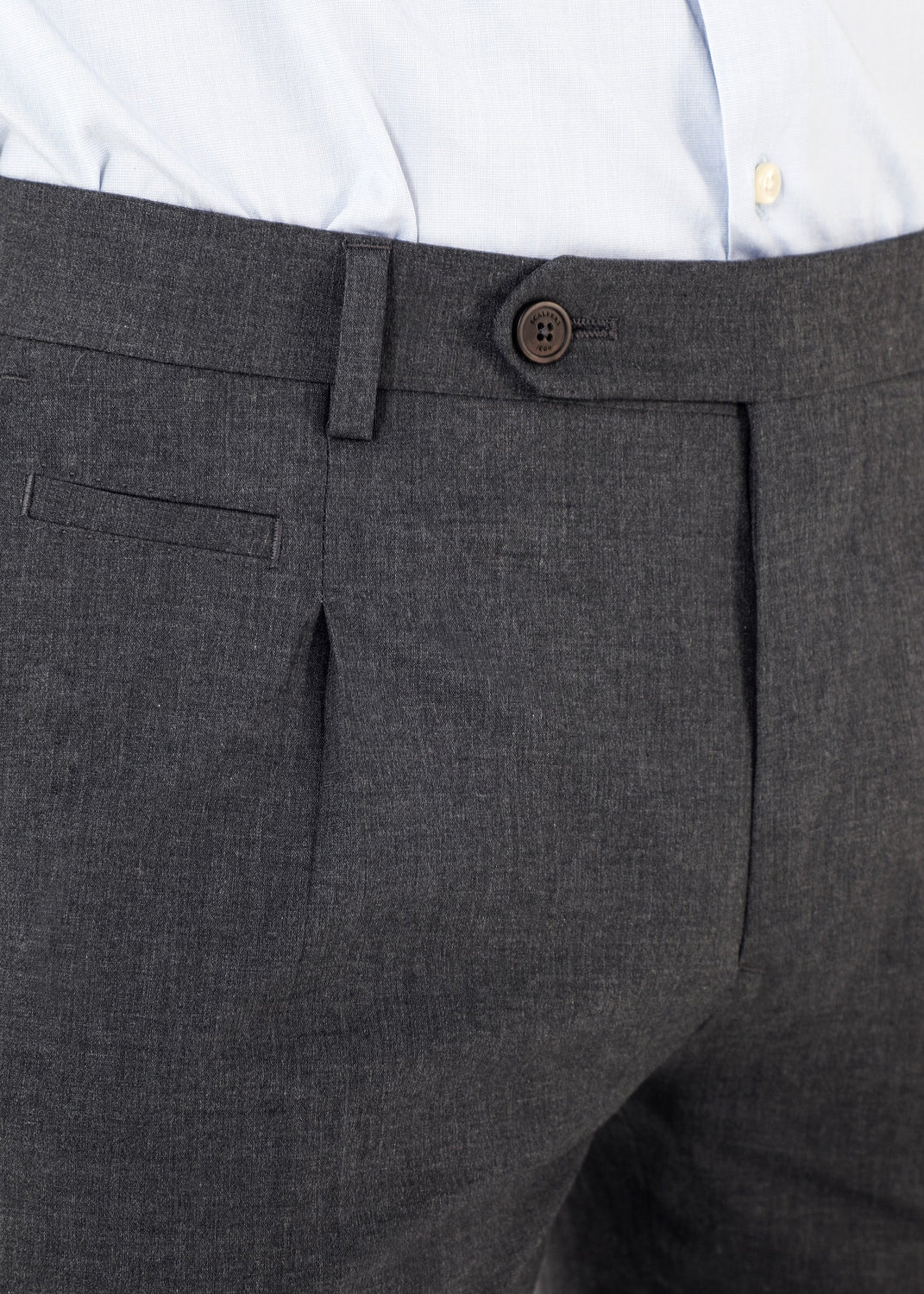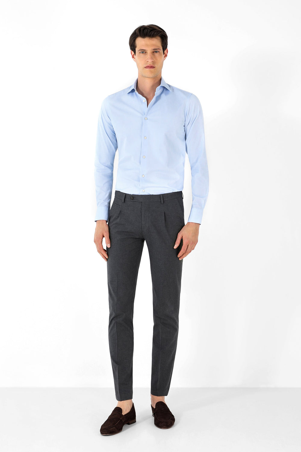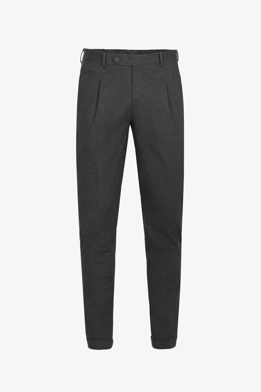 Calças formais confecionadas em tecido de algodão ligeiramente elástico. Corte Regular Fit com pinças, fecho com botão e zip e bolsos laterais. Têm presilhas.