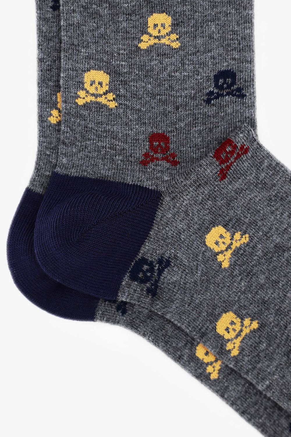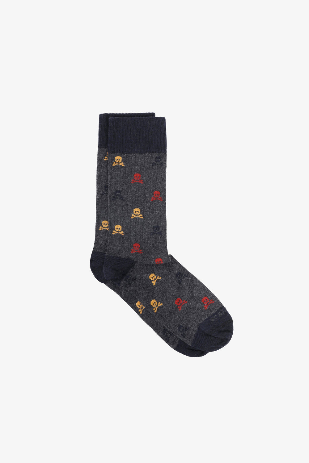 Meias com estampado de caveiras em padrão all over, confeccionadas em tecido de algodão elástico.