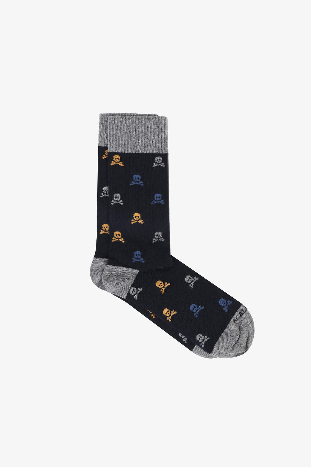 Meias com estampado de caveiras em padrão all over, confeccionadas em tecido de algodão elástico.