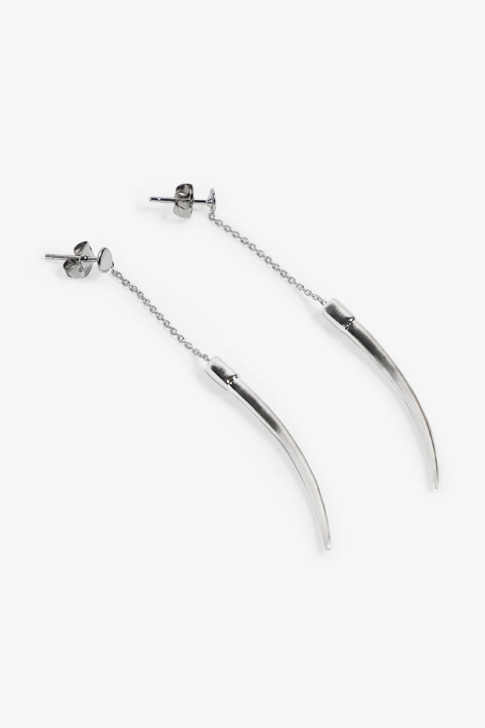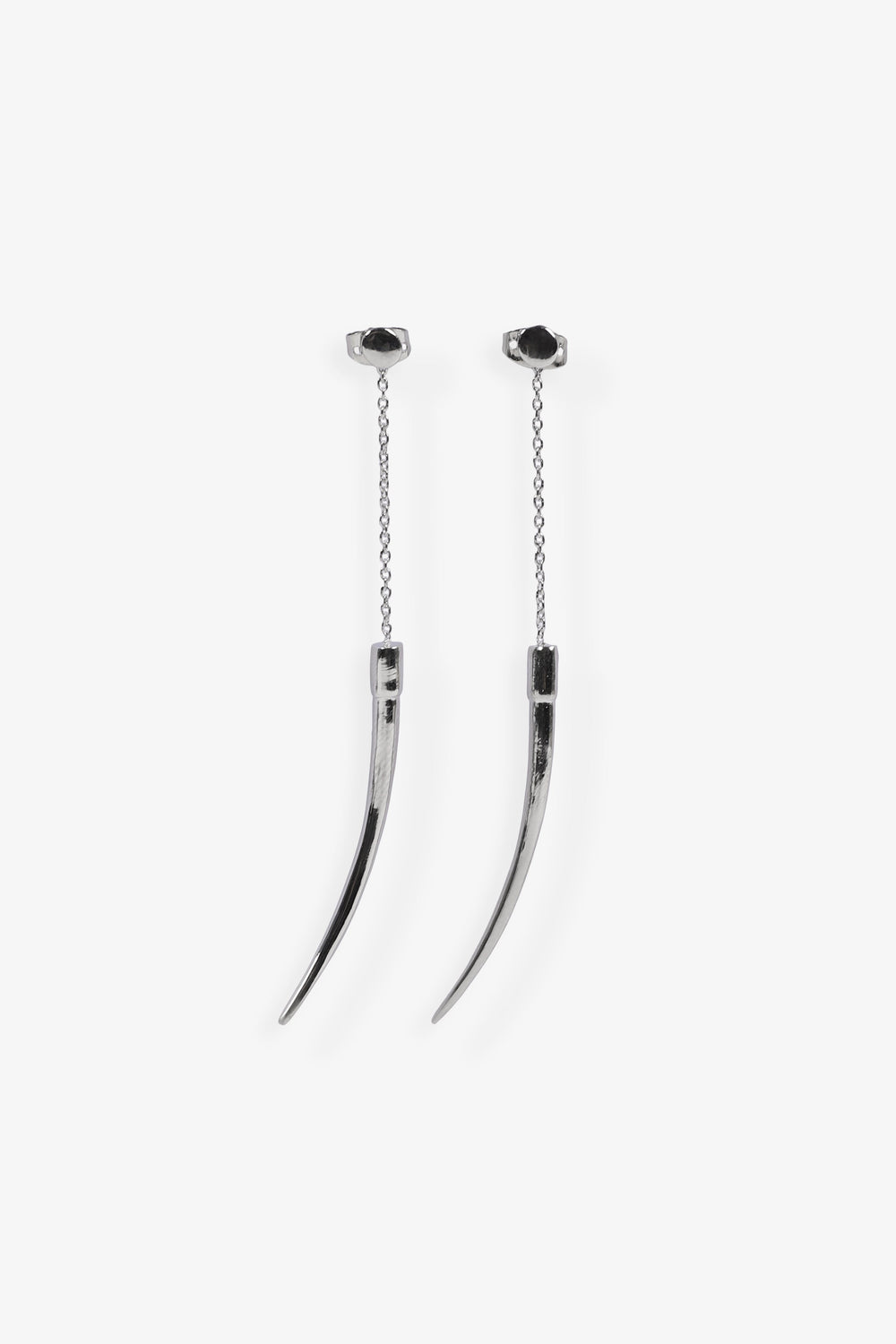 Brincos compridos com corrente terminada em forma de corno de bronze banhado a prata de lei. Fecho com porca. O tamanho é de 7 cm.