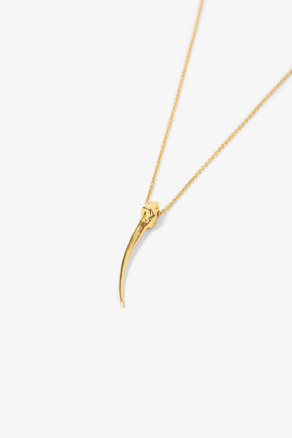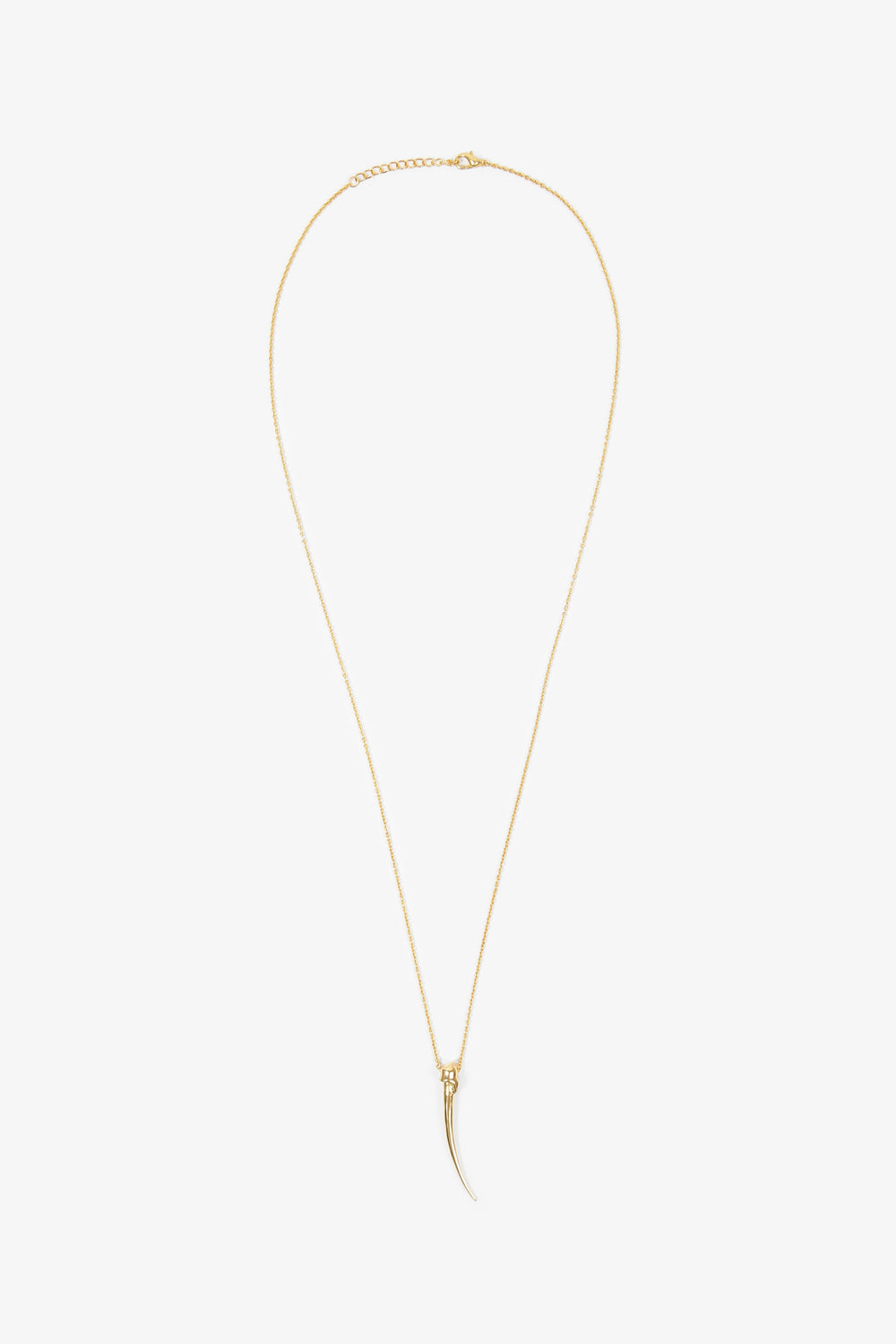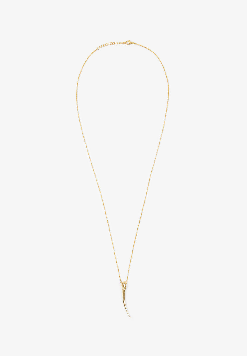 Fio comprido com pendente em forma de corno de bronze banhado a ouro de 18 K. Pendente e corrente com fecho de mosquetão. A corrente mede 60 cm + 5 cm ajustáveis.