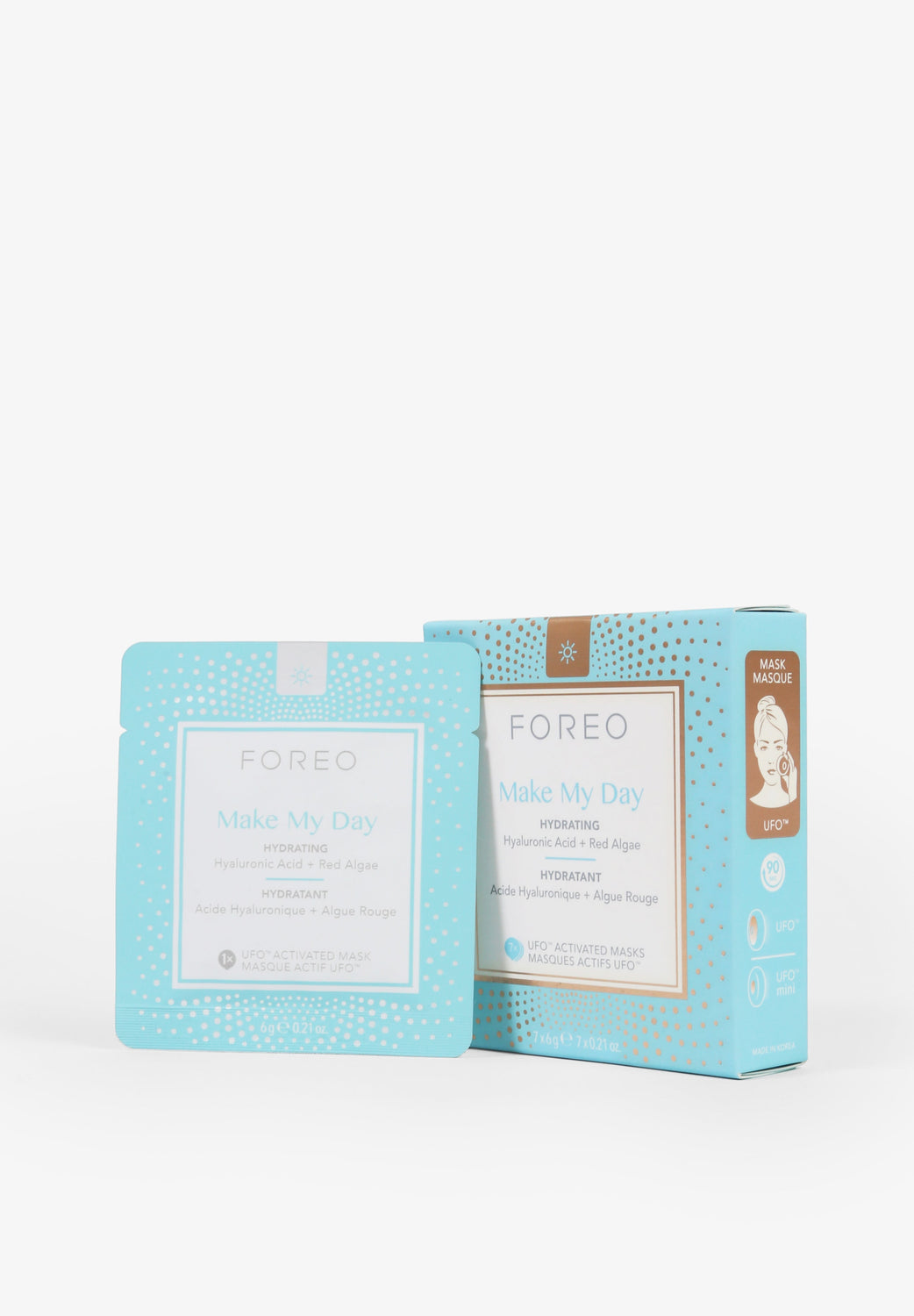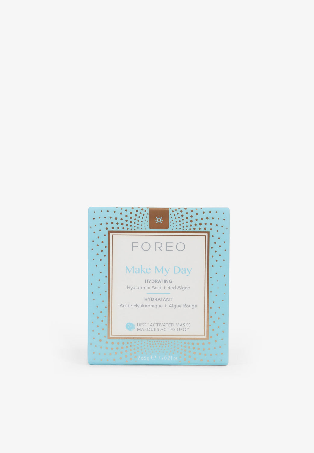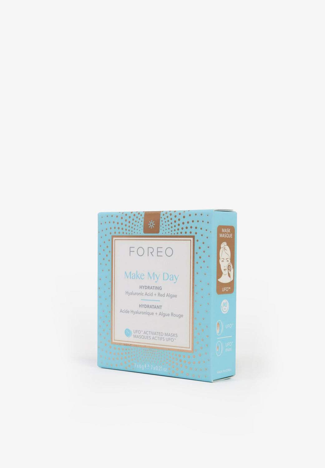 Máscara hidratante e anticontaminação para UFO da FOREO. A máscara facial Make My Day é a melhor solução para peles secas e desidratadas, já que restaura a sua luminosidade natural. Repleta de ácido hialurónico e algas vermelhas, os seus ingredientes naturais hidratam e revitalizam a barreira natural da pele num tratamento de apenas 90 segundos. É compatível com todos os dispositivos da gama UFO.