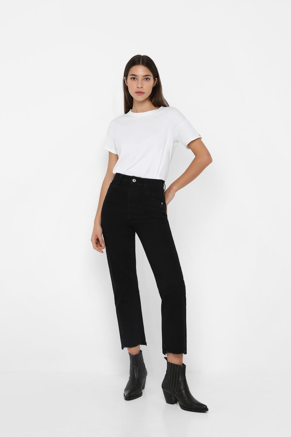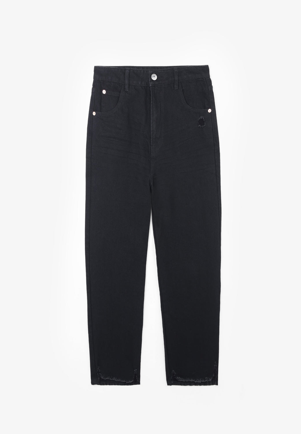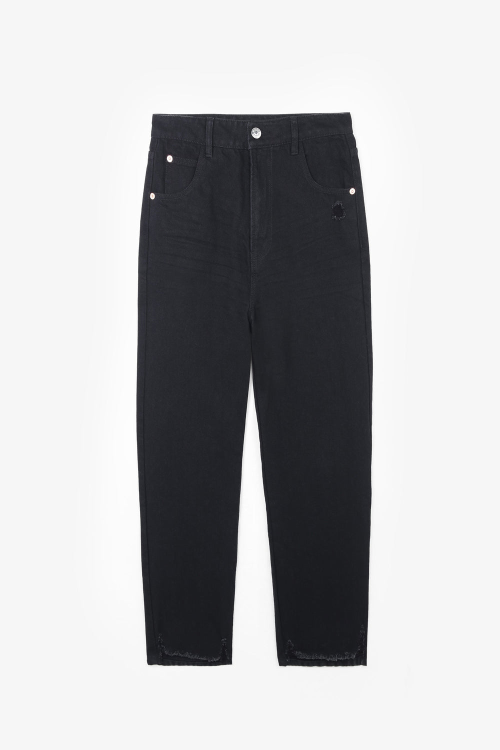 Jeans desbotados direitos confecionados em mistura de algodão ligeiramente elástico. Corte Regular Fit com cintura subida. Fecho com botão e zip. Bolsos à frente e atrás. Presilhas na cintura. Bainha desfiada.