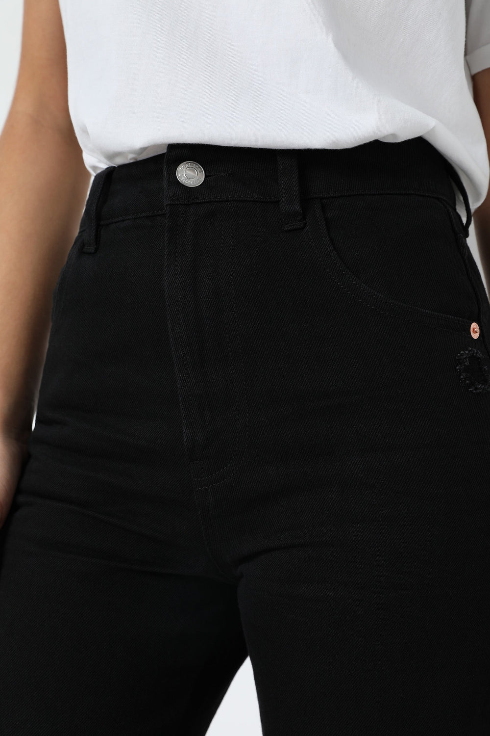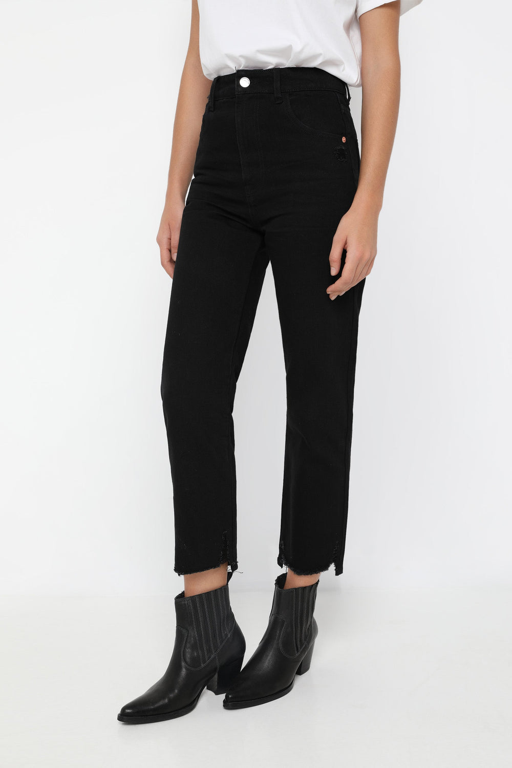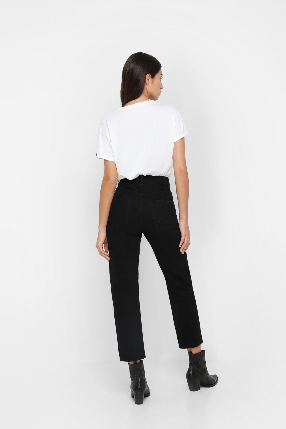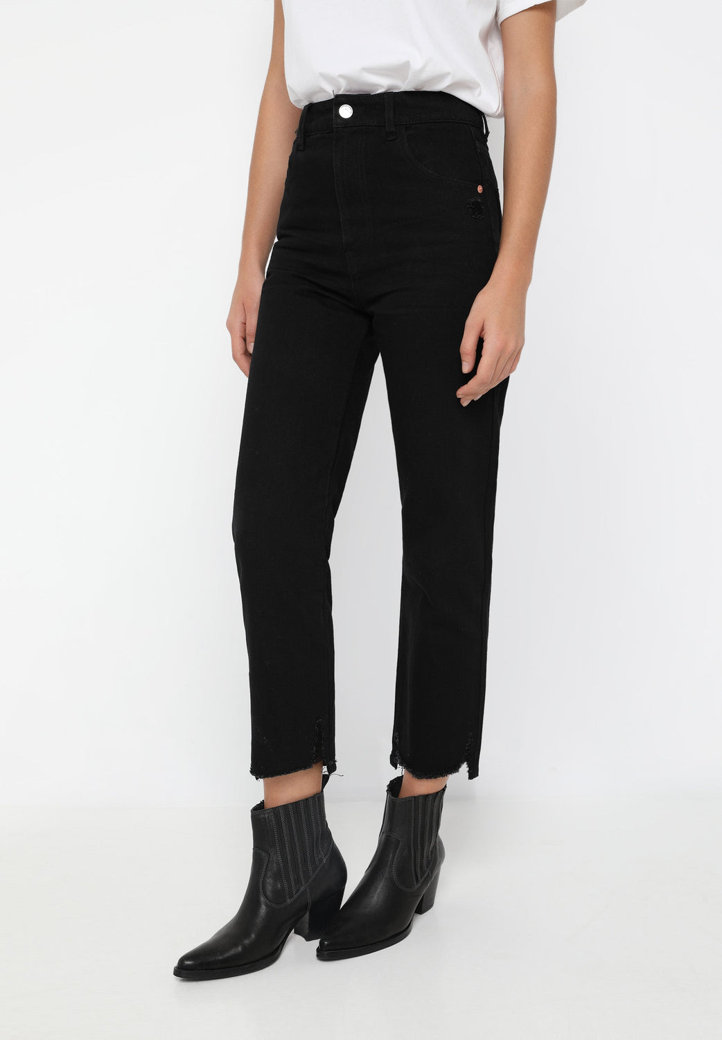 Jeans desbotados direitos confecionados em mistura de algodão ligeiramente elástico. Corte Regular Fit com cintura subida. Fecho com botão e zip. Bolsos à frente e atrás. Presilhas na cintura. Bainha desfiada.