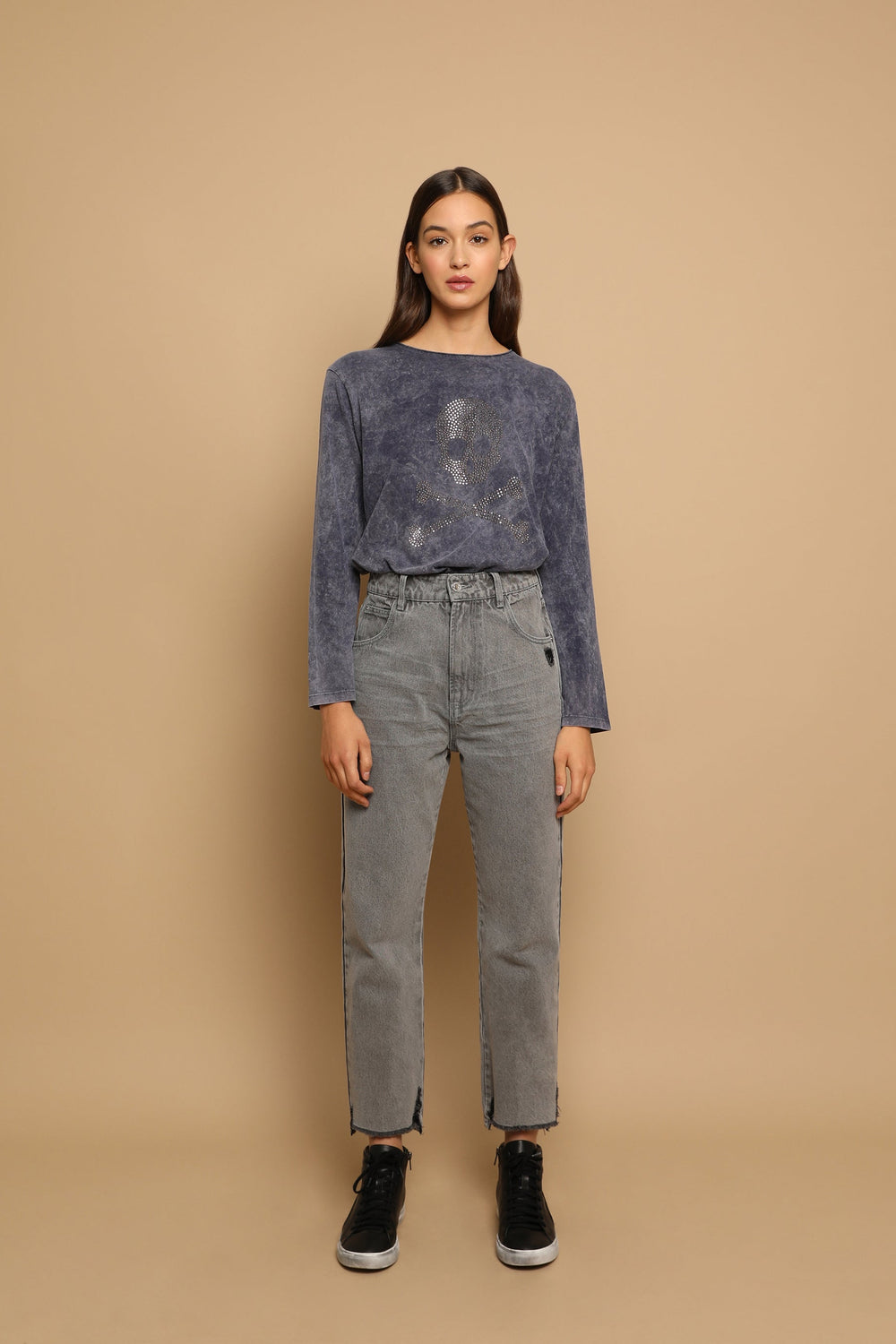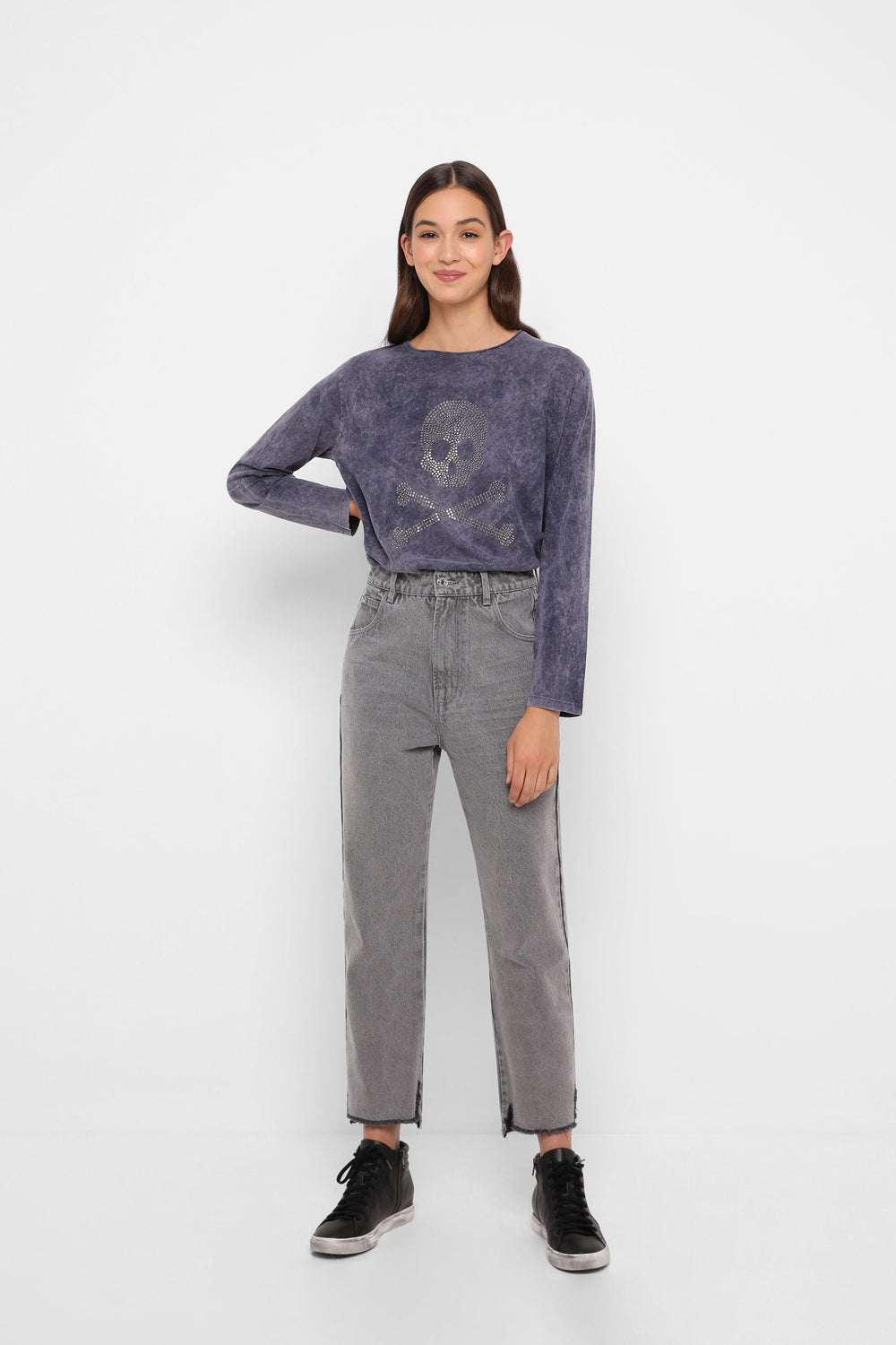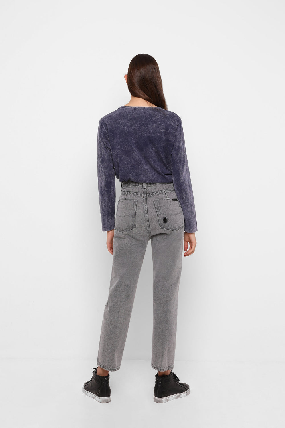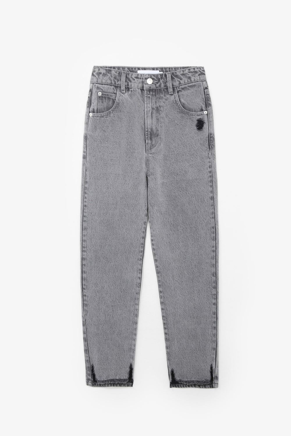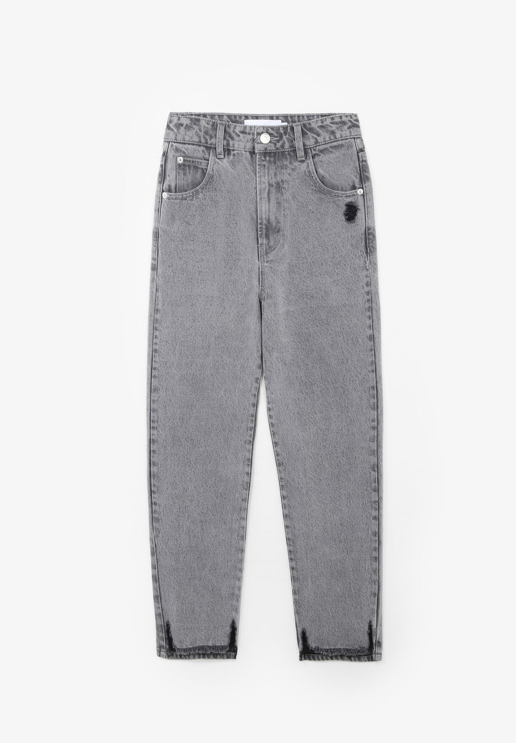 Jeans desbotados direitos confecionados em mistura de algodão ligeiramente elástico. Corte Regular Fit com cintura subida. Fecho com botão e zip. Bolsos à frente e atrás. Presilhas na cintura. Bainha desfiada.