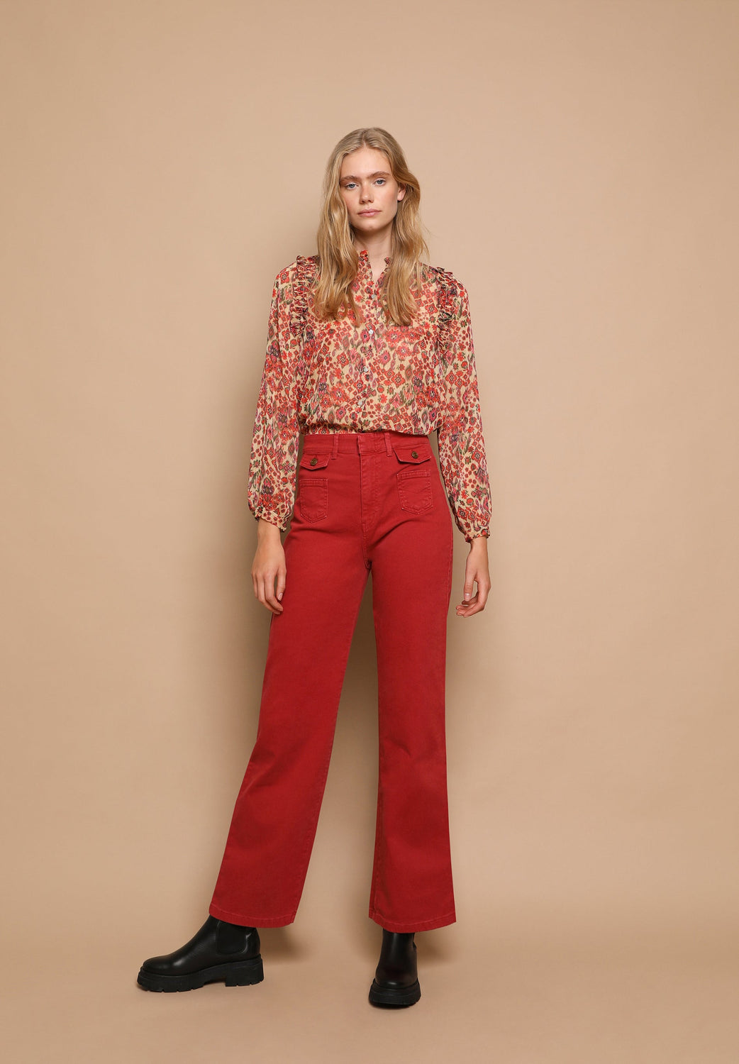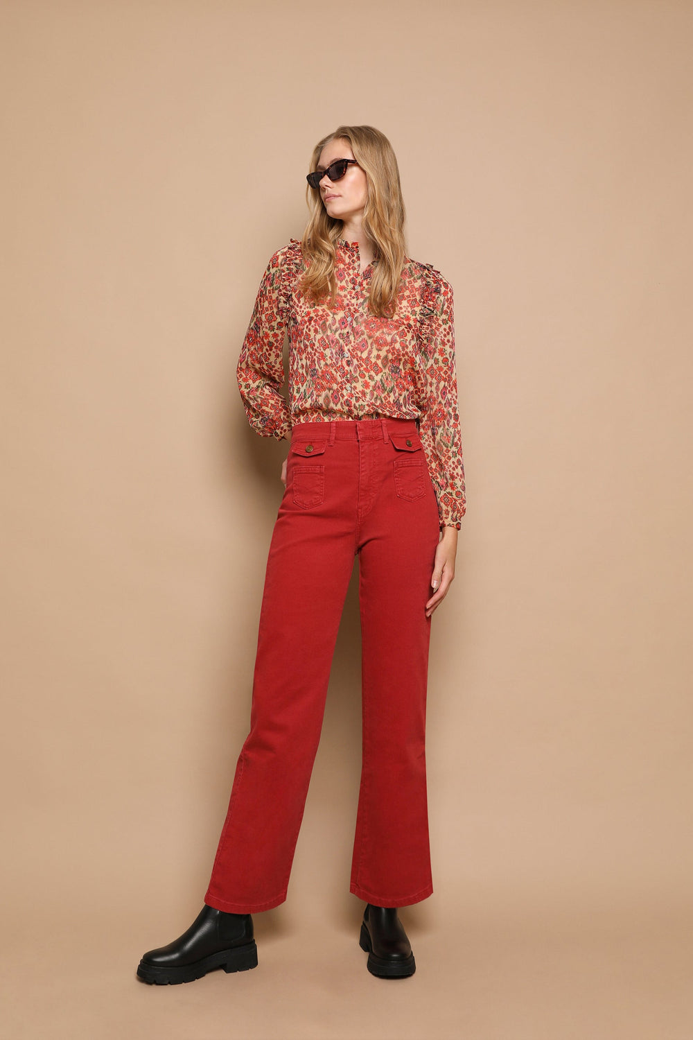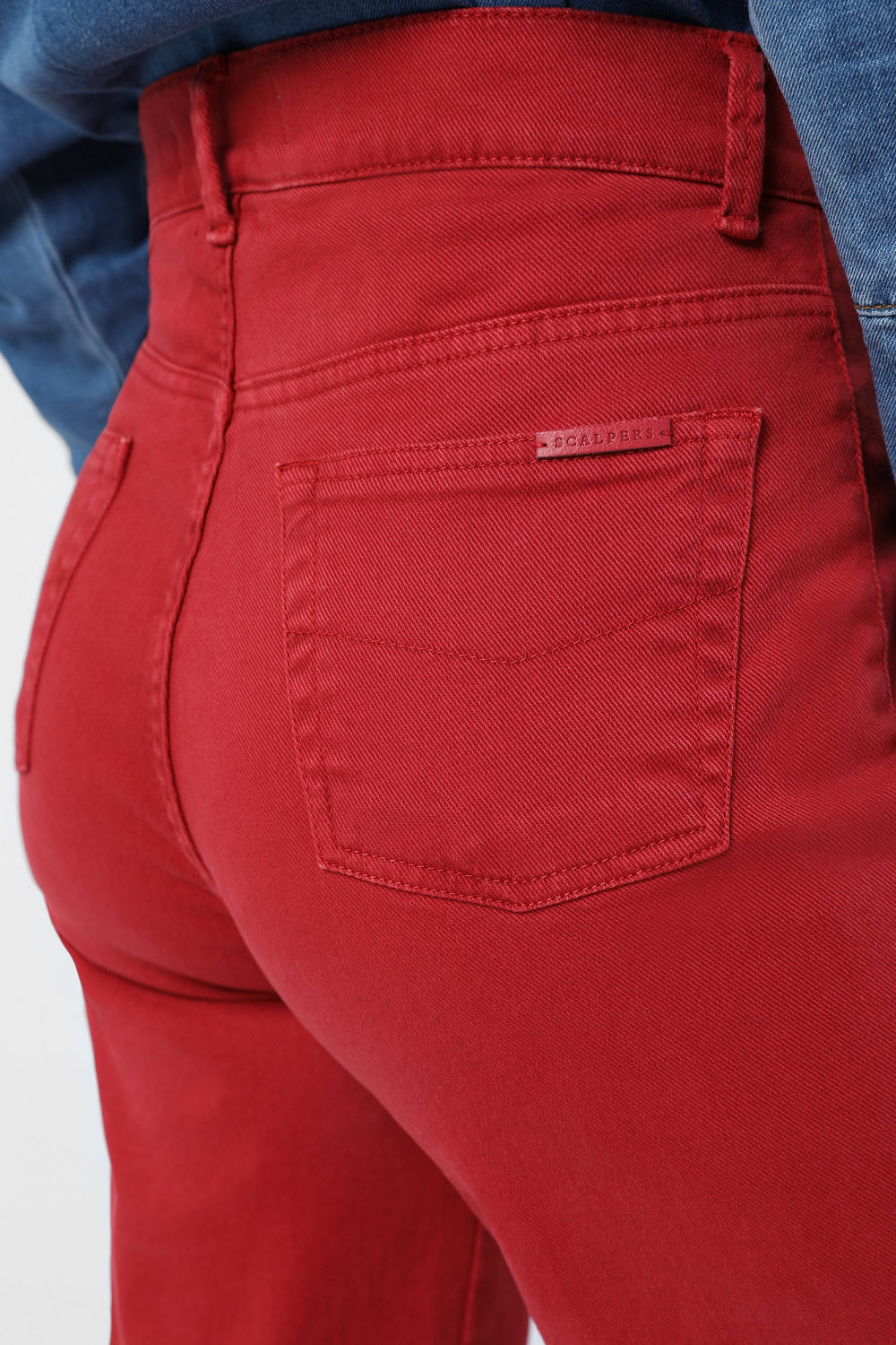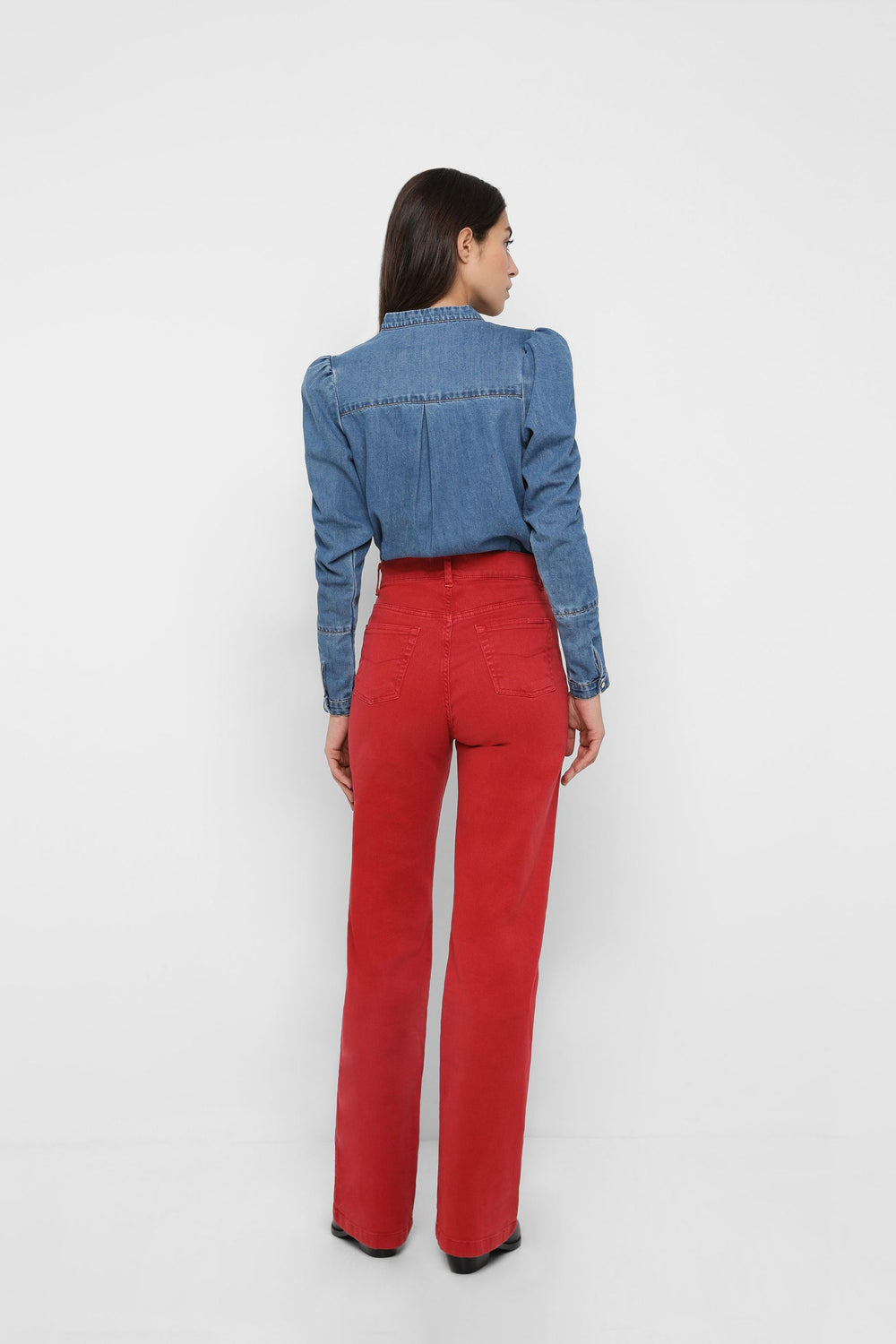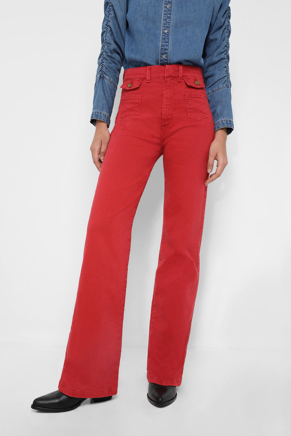 Jeans confecionados em tecido denim ligeiramente elástico. Corte boca de sino cintura subida, fecho com botão e zip e bolsos com botão. Têm presilhas.