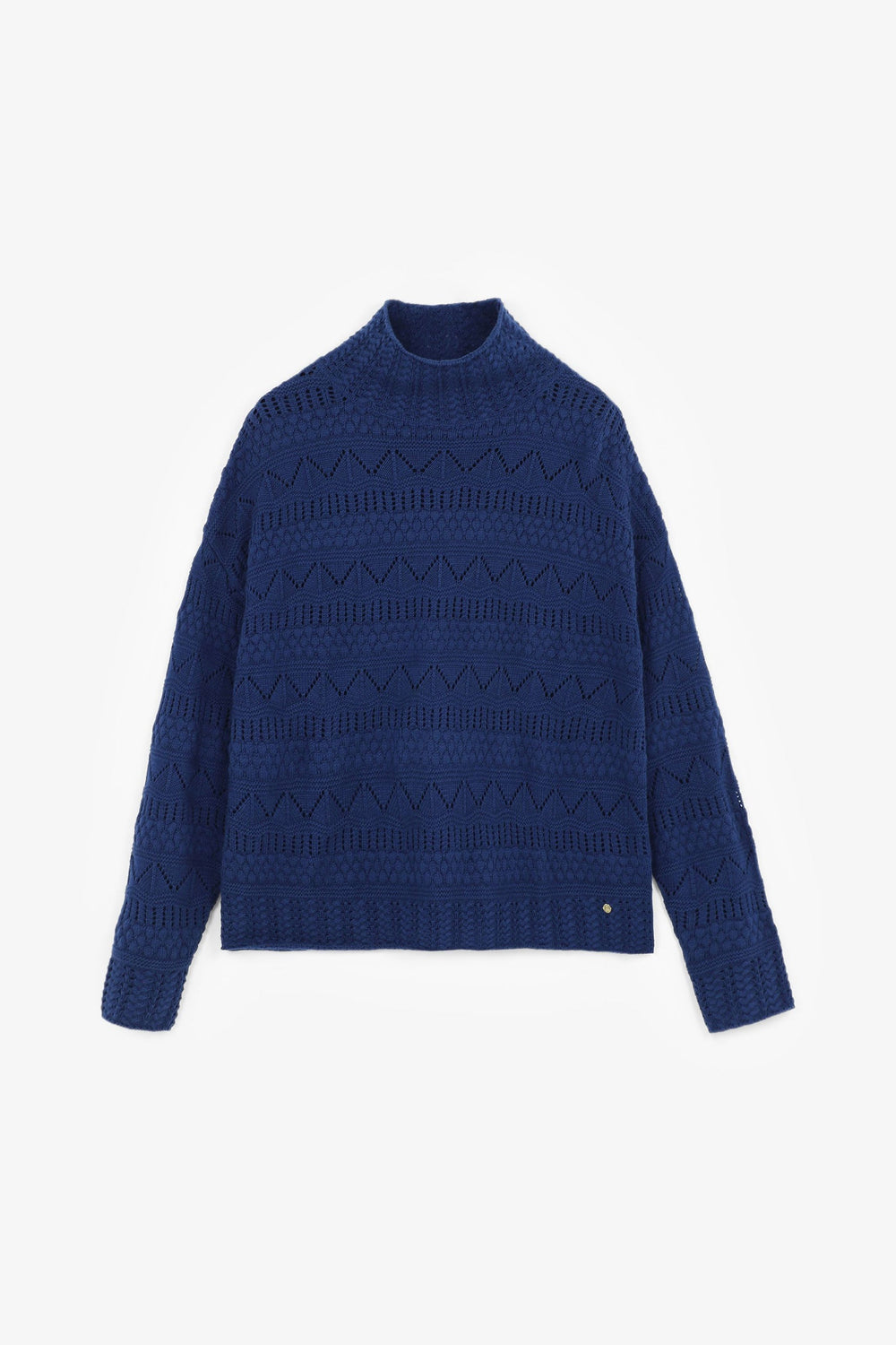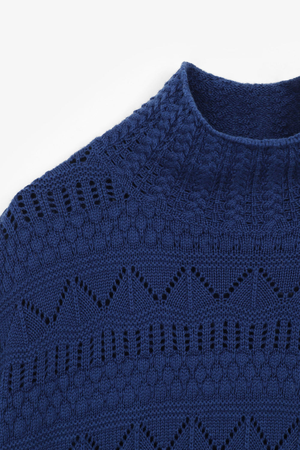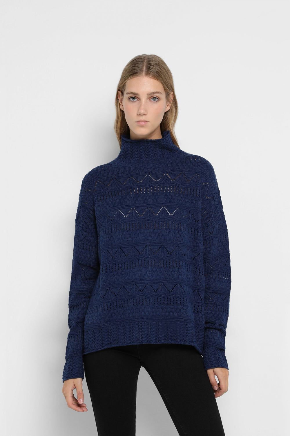 Sweater com pormenor de rendilhado confecionada em mistura de algodão e lã. Corte ligeiramente oversize, gola alta e manga comprida.