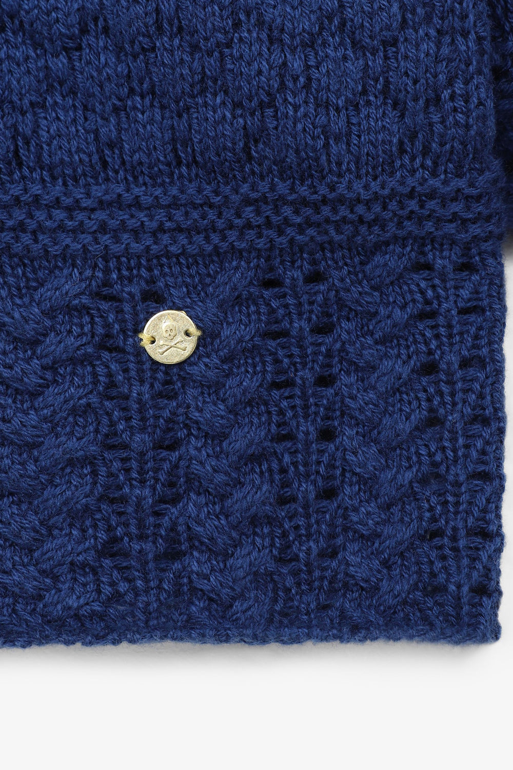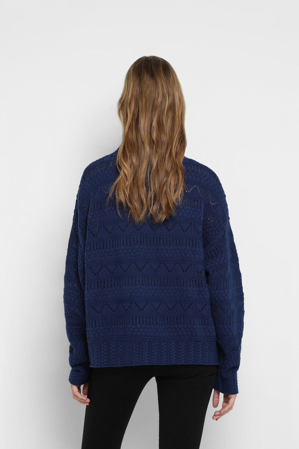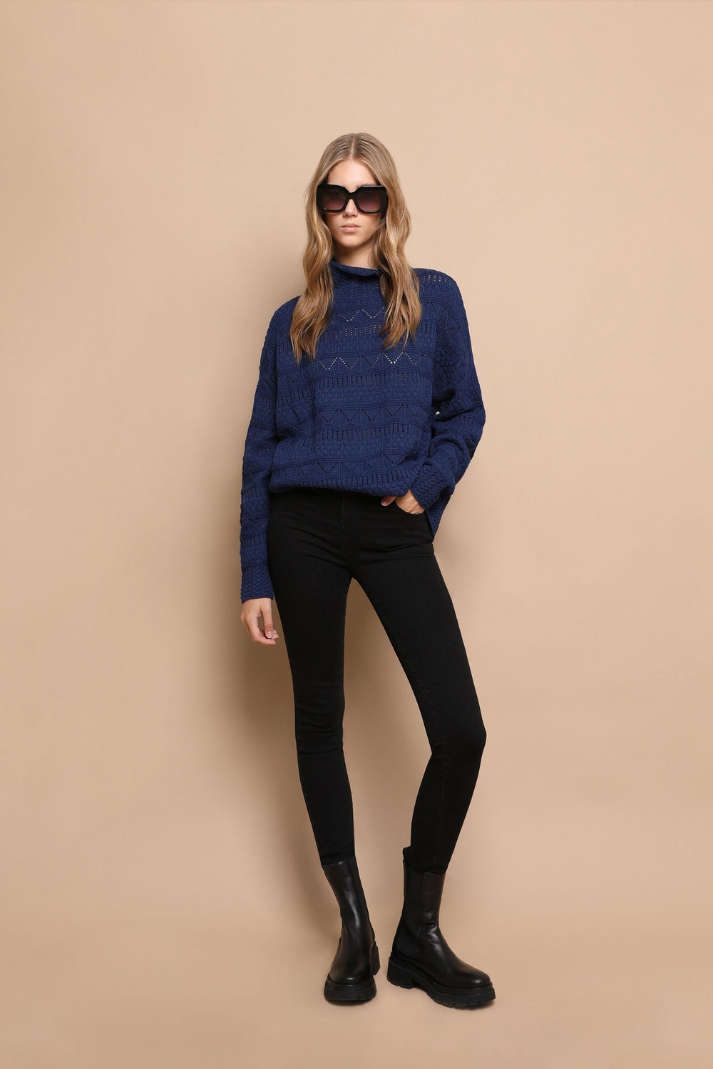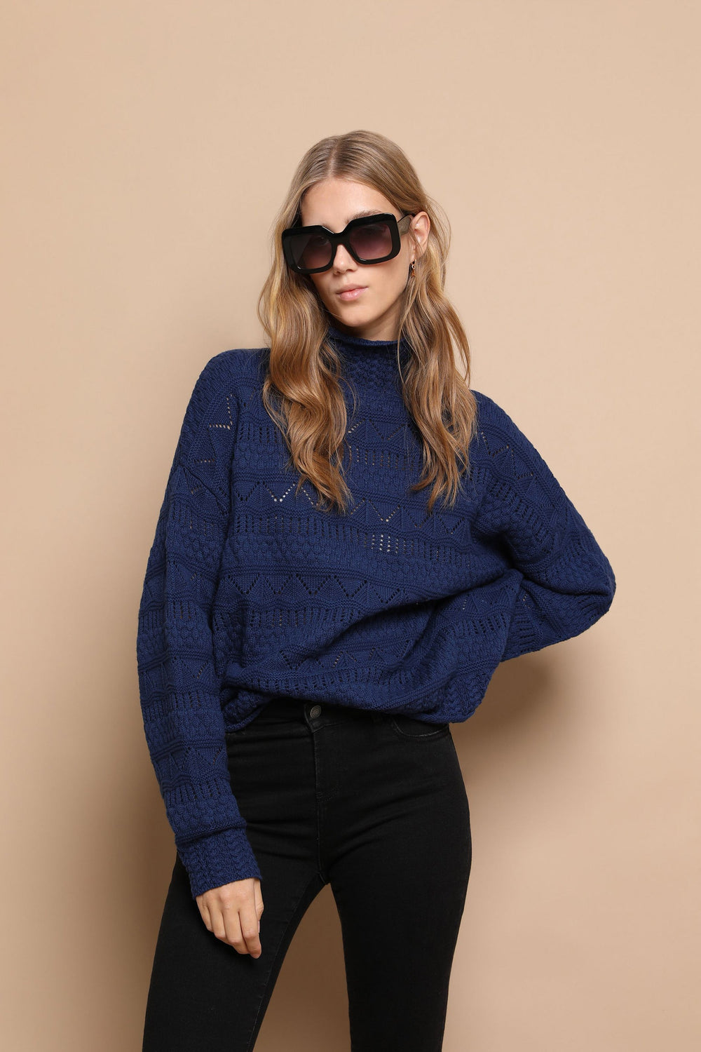 Sweater com pormenor de rendilhado confecionada em mistura de algodão e lã. Corte ligeiramente oversize, gola alta e manga comprida.
