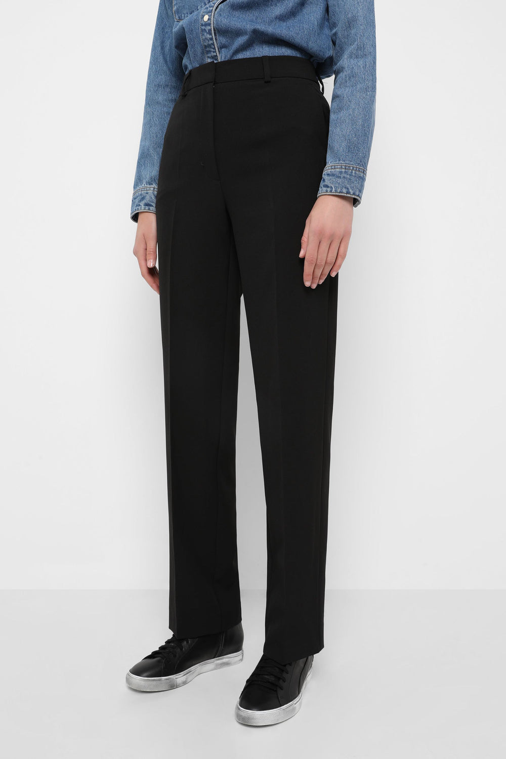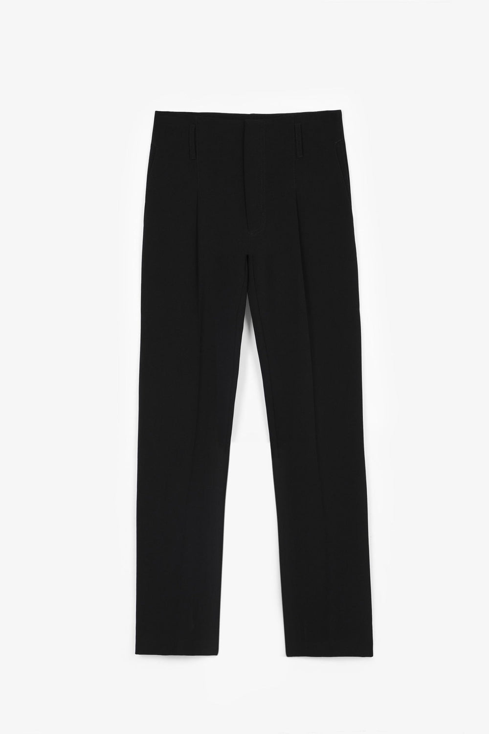 Calças direitas com cintura subida. Fecho com zip e colchete.