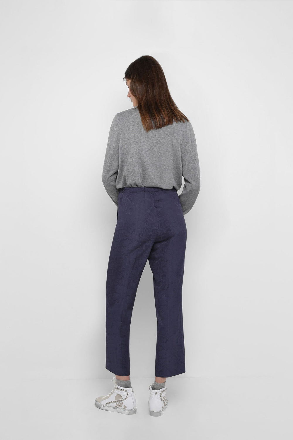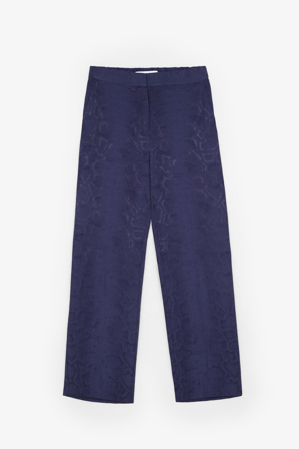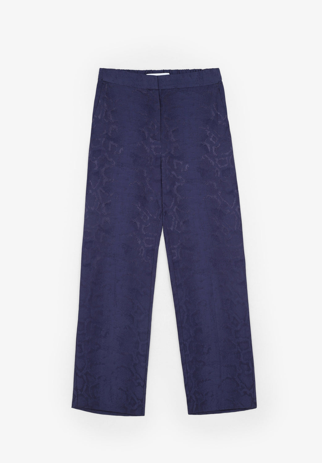 Calças fluidas confecionadas em tecido de jacquard. Corte Regular Fit, fecho com zip e colchete e bolsos laterais.