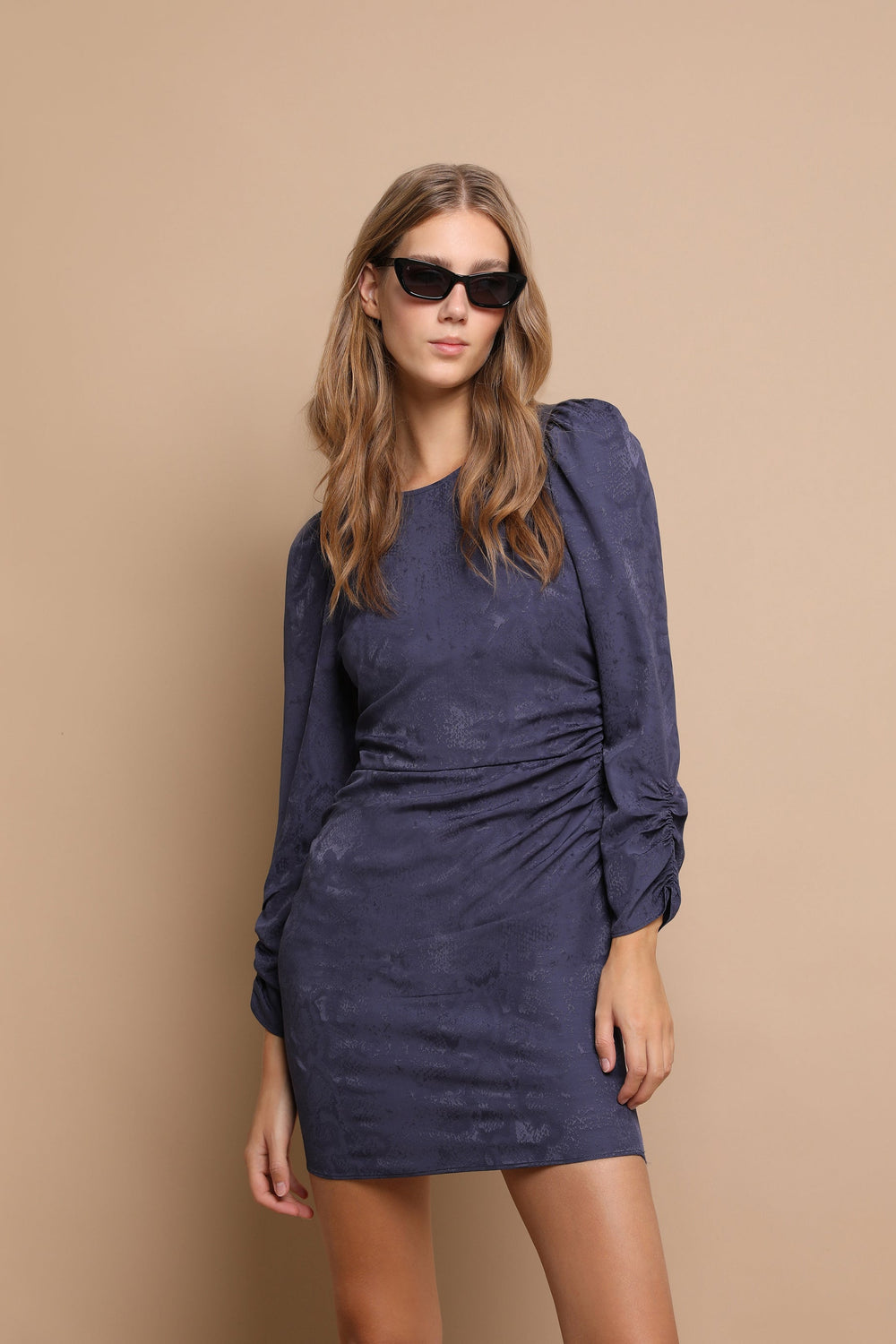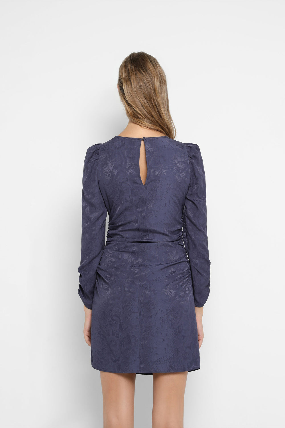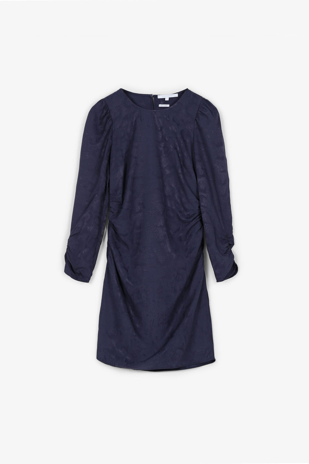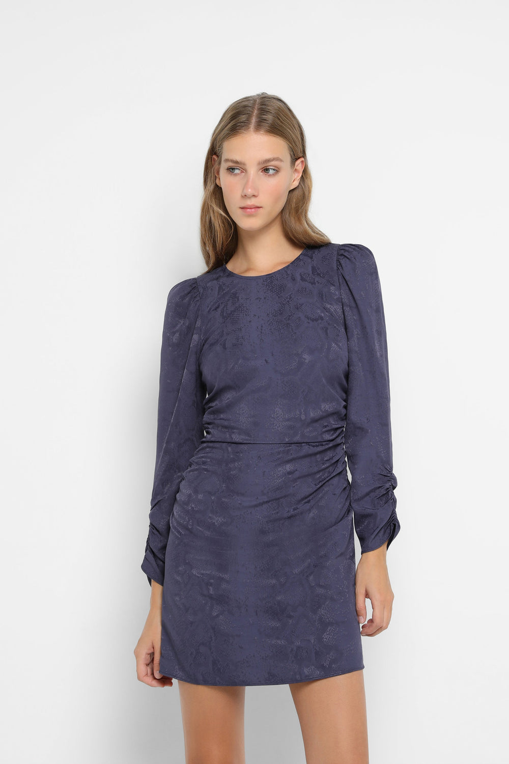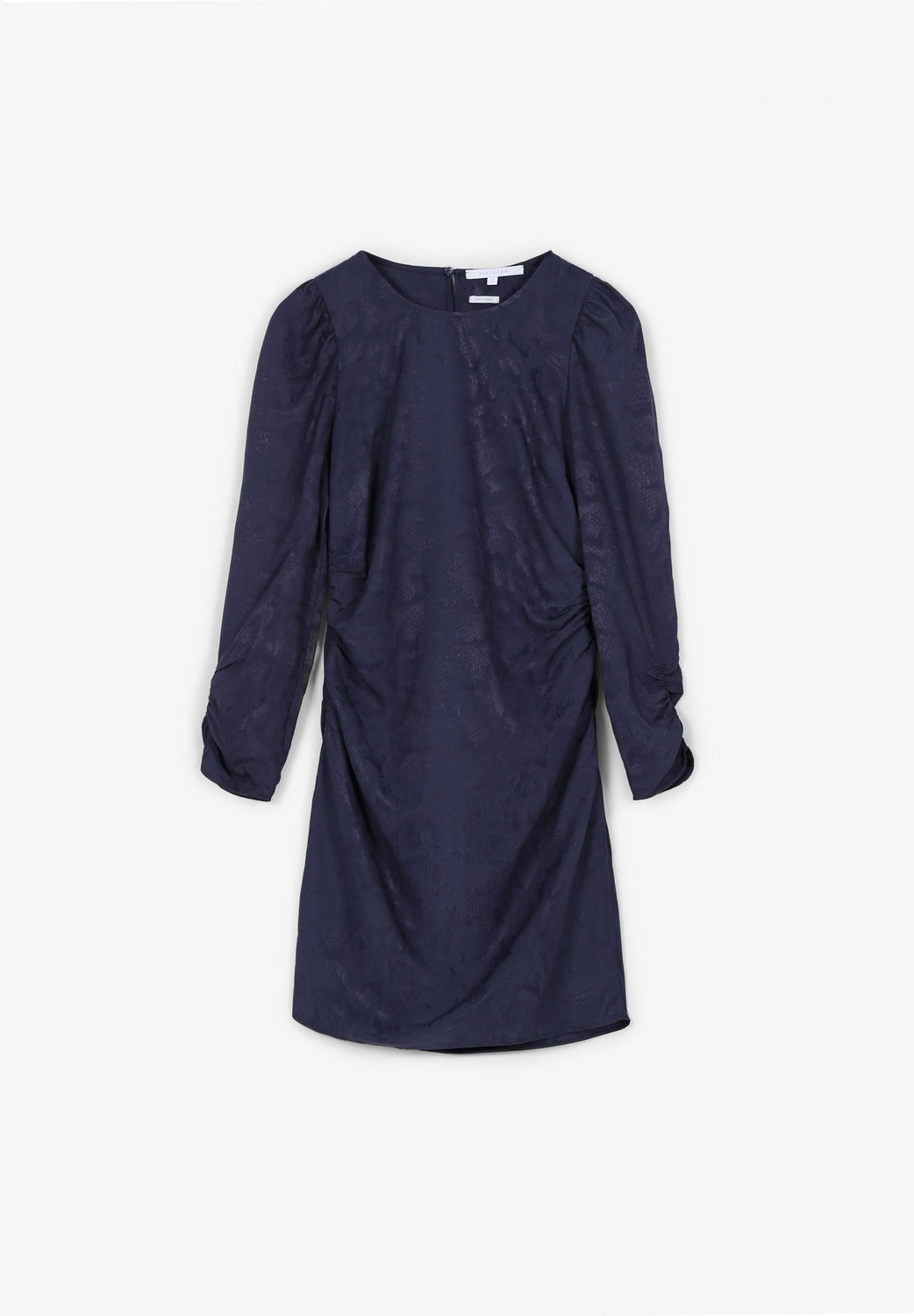 Minivestido confecionado em jacquard. Corte Slim Fit, decote redondo e fecho com zip. Manga francesa franzida e drapeados laterais.