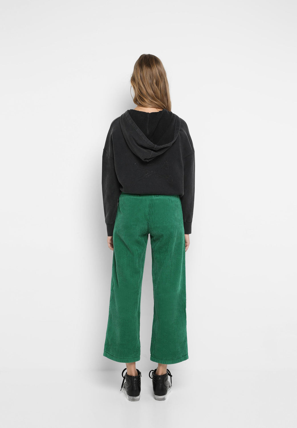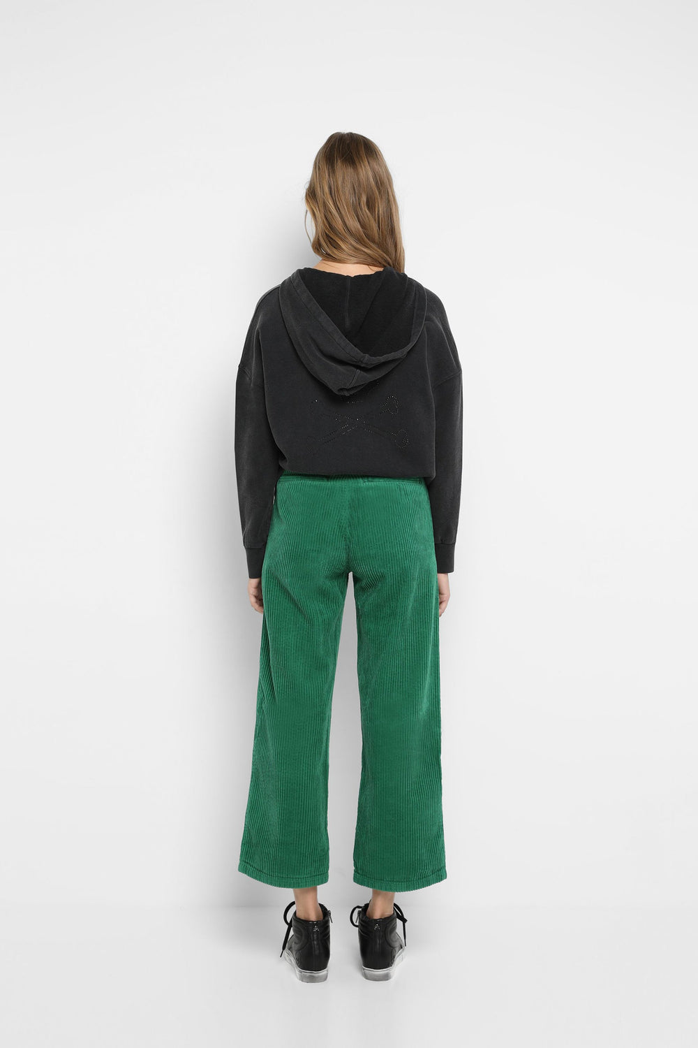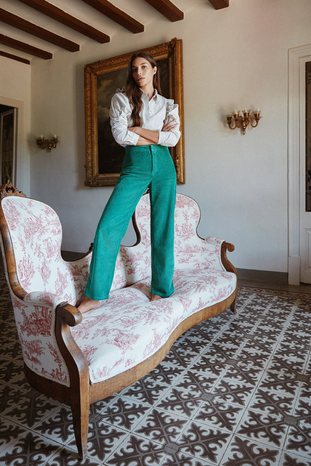 Calças de bombazina confecionadas em 100% algodão. Corte boca de sino com cintura subida, fecho com zip e colchete.
