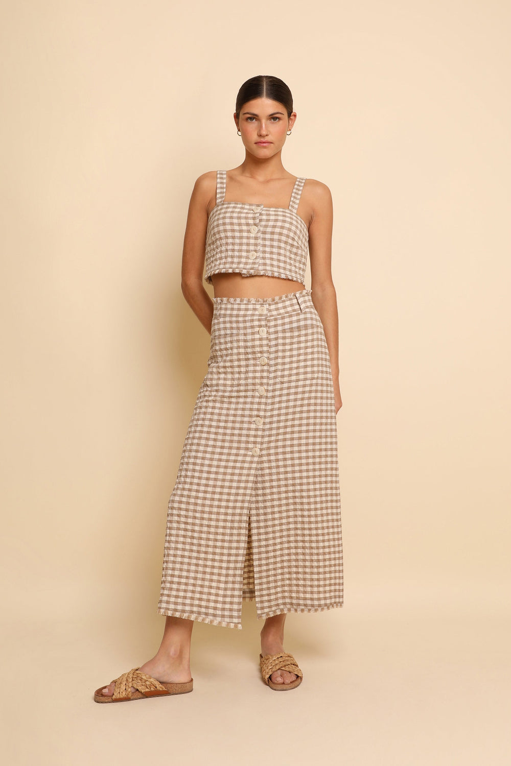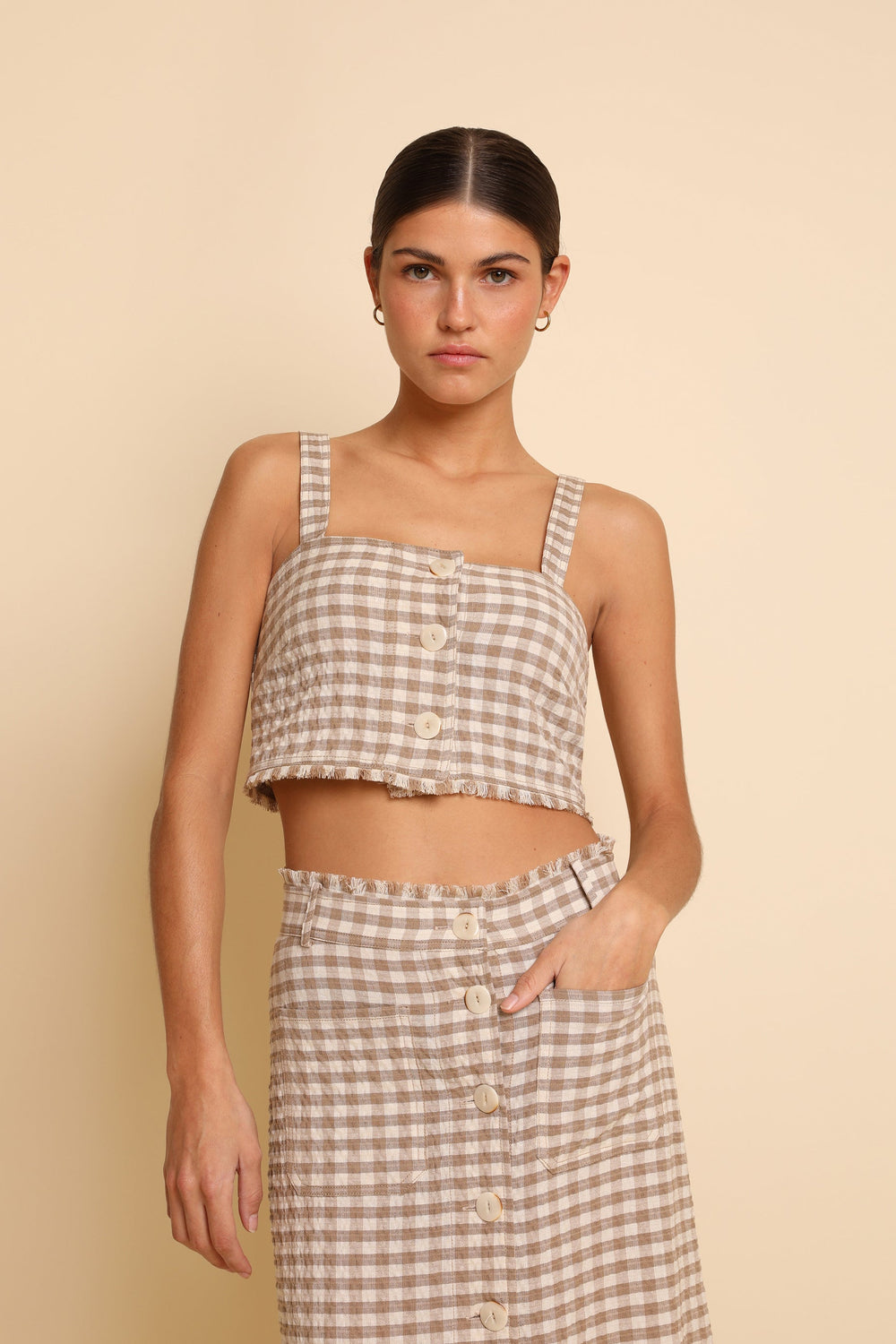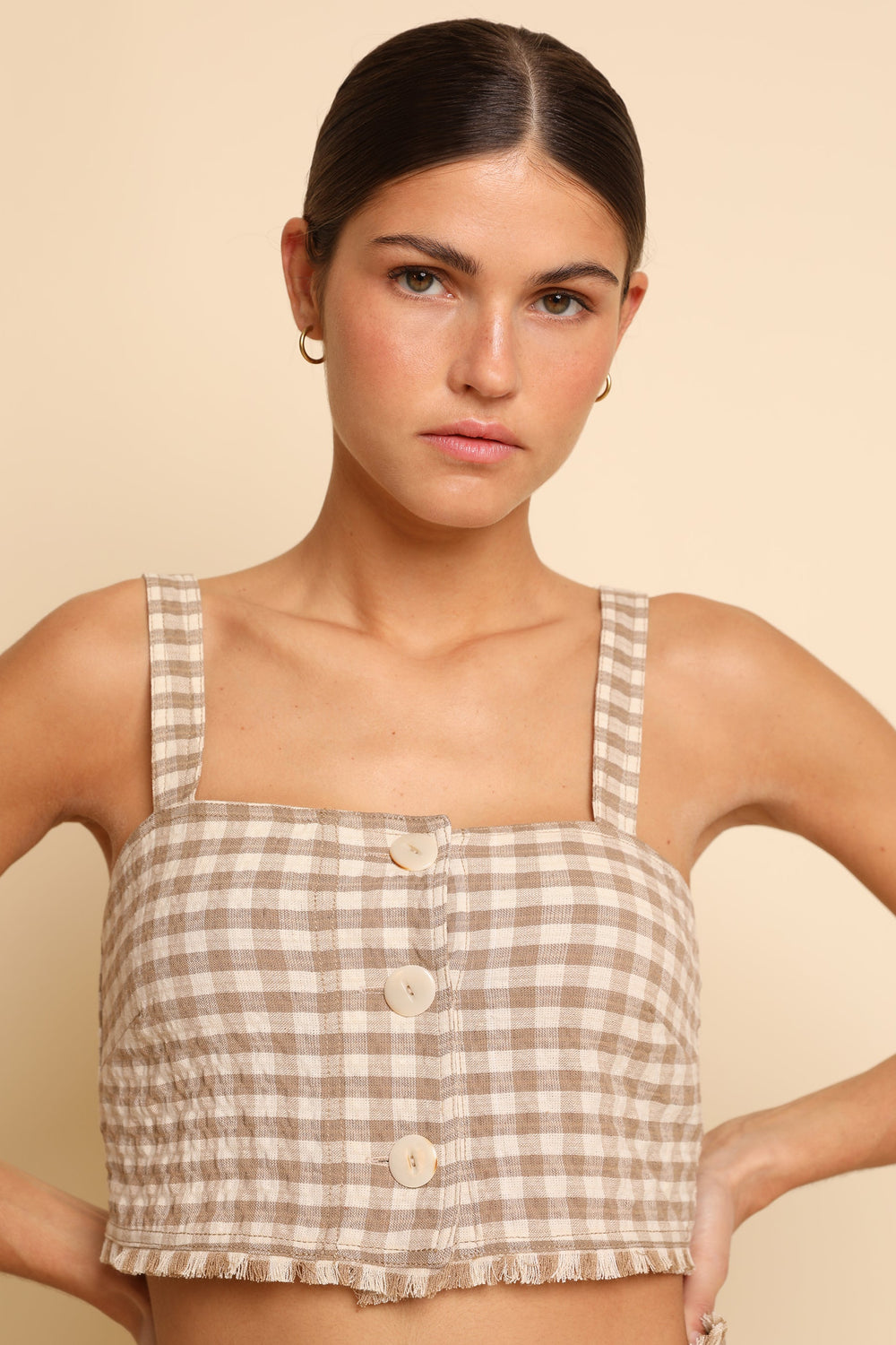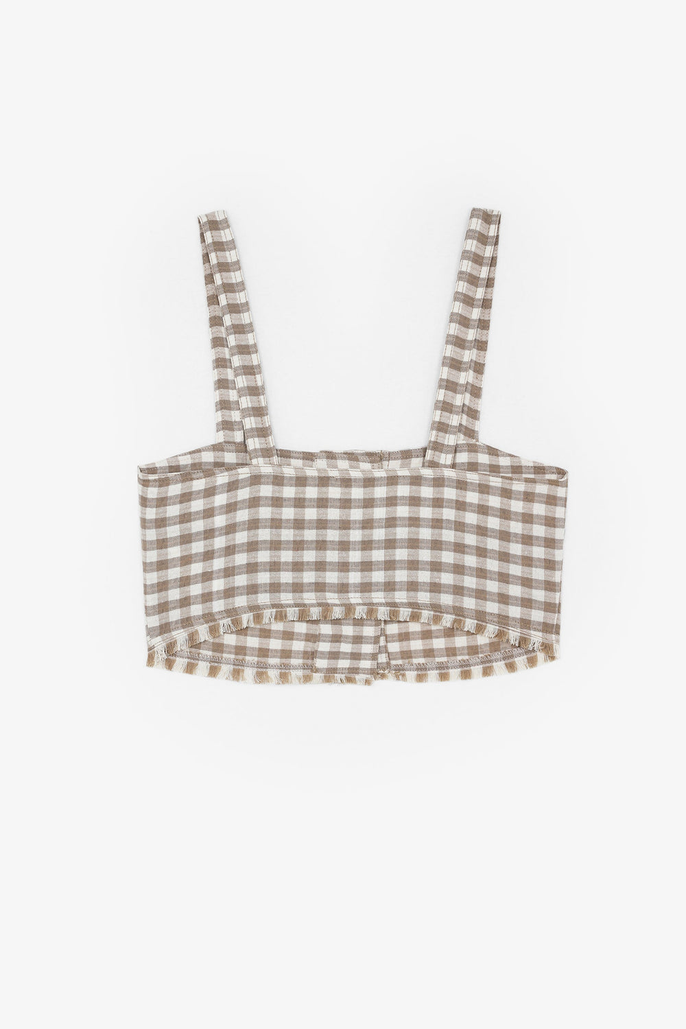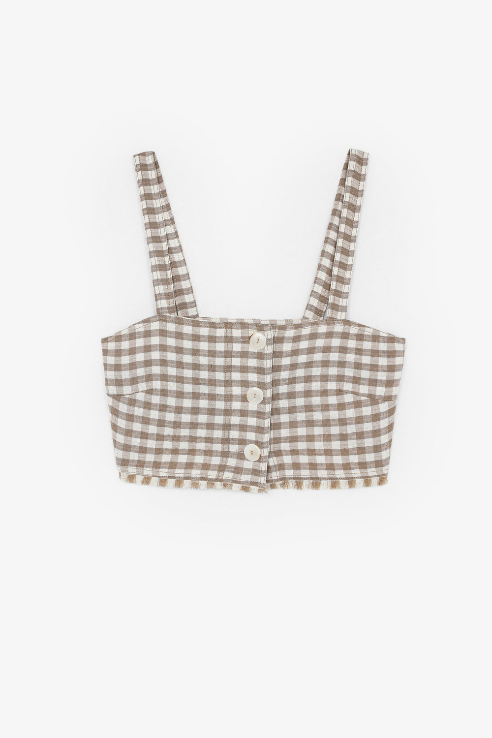 Top curto de quadrados vichy confecionado em algodão ligeiramente elástico. Corte Slim Fit, fecho com botões e alças. Pormenor de franjas na bainha.