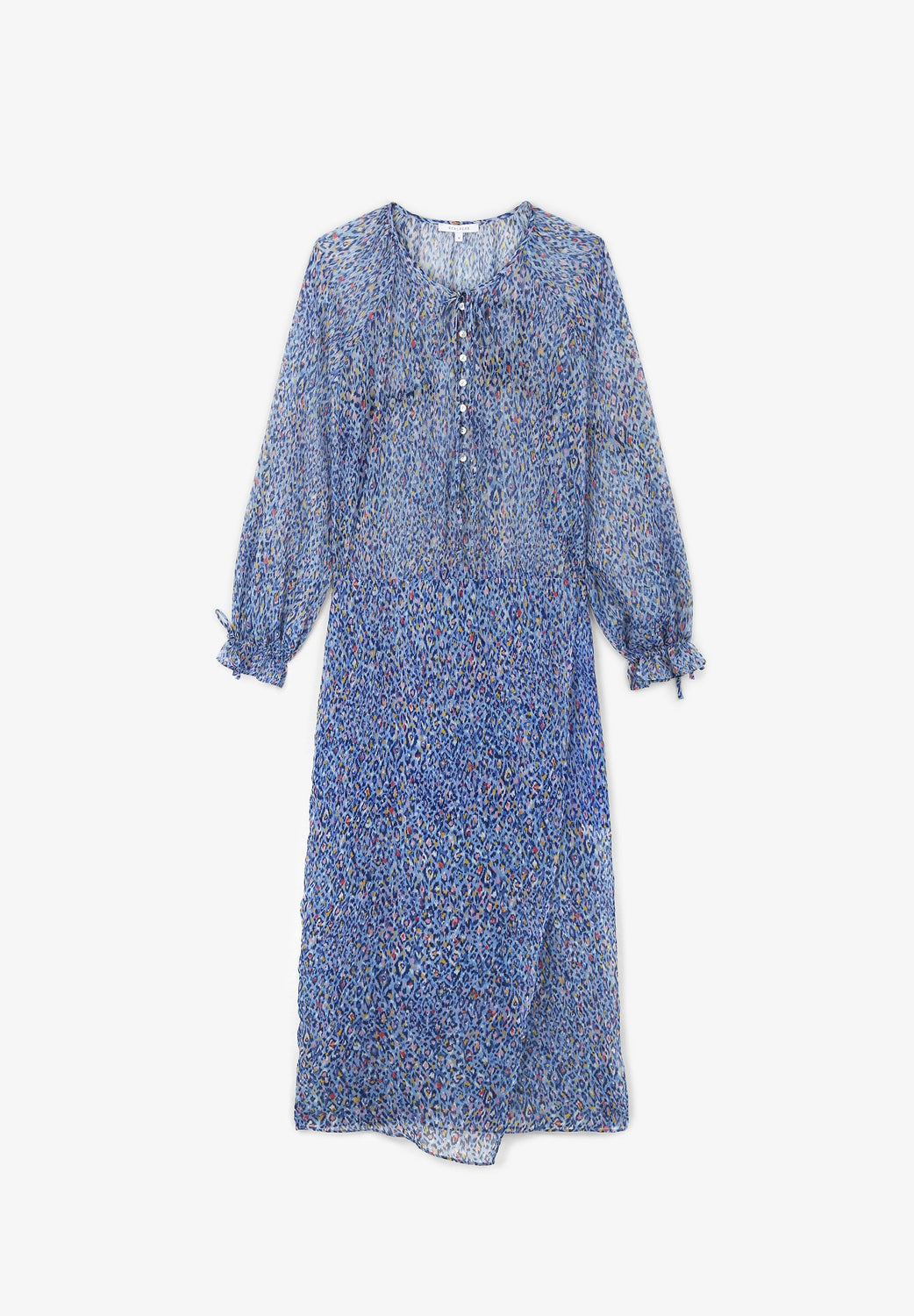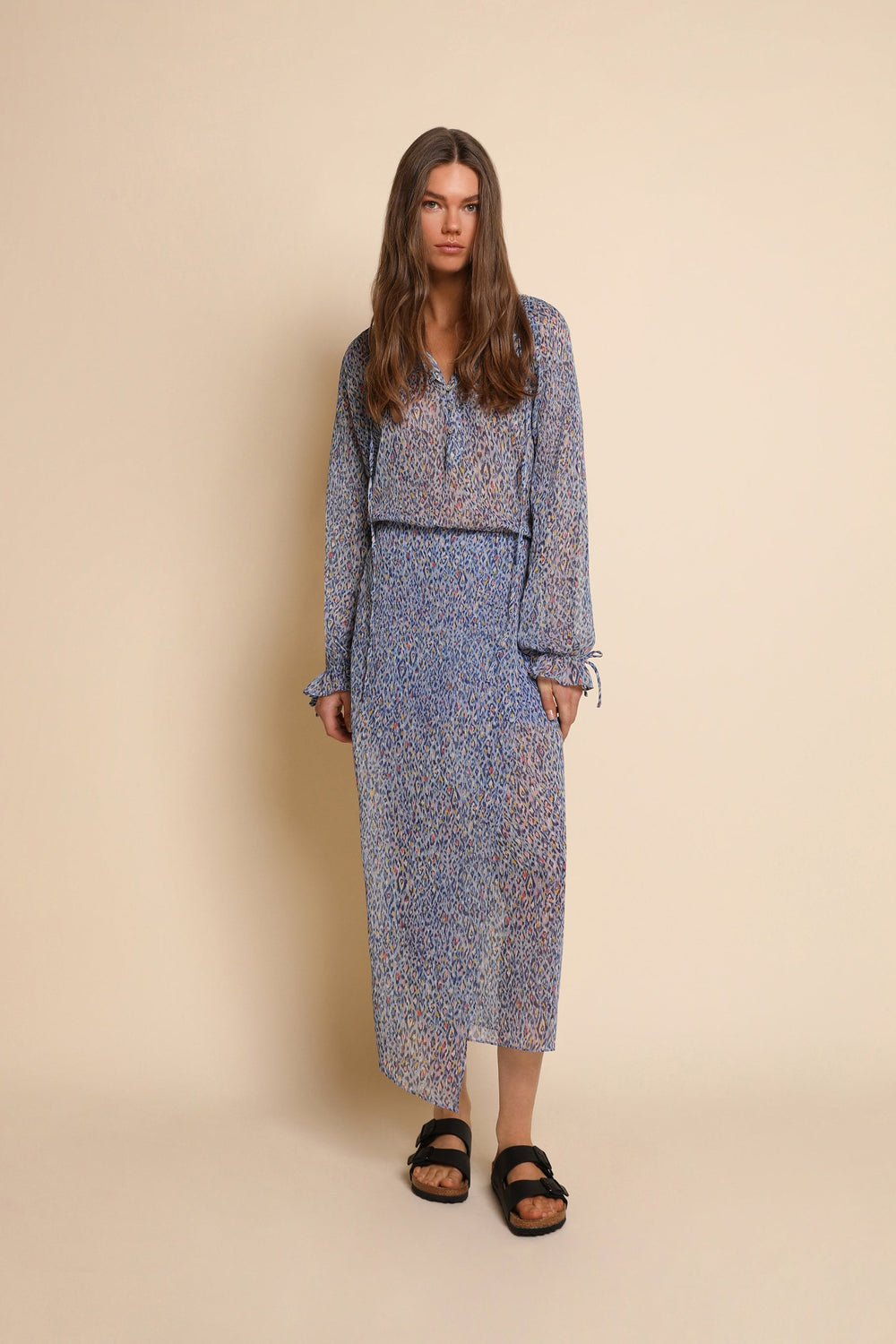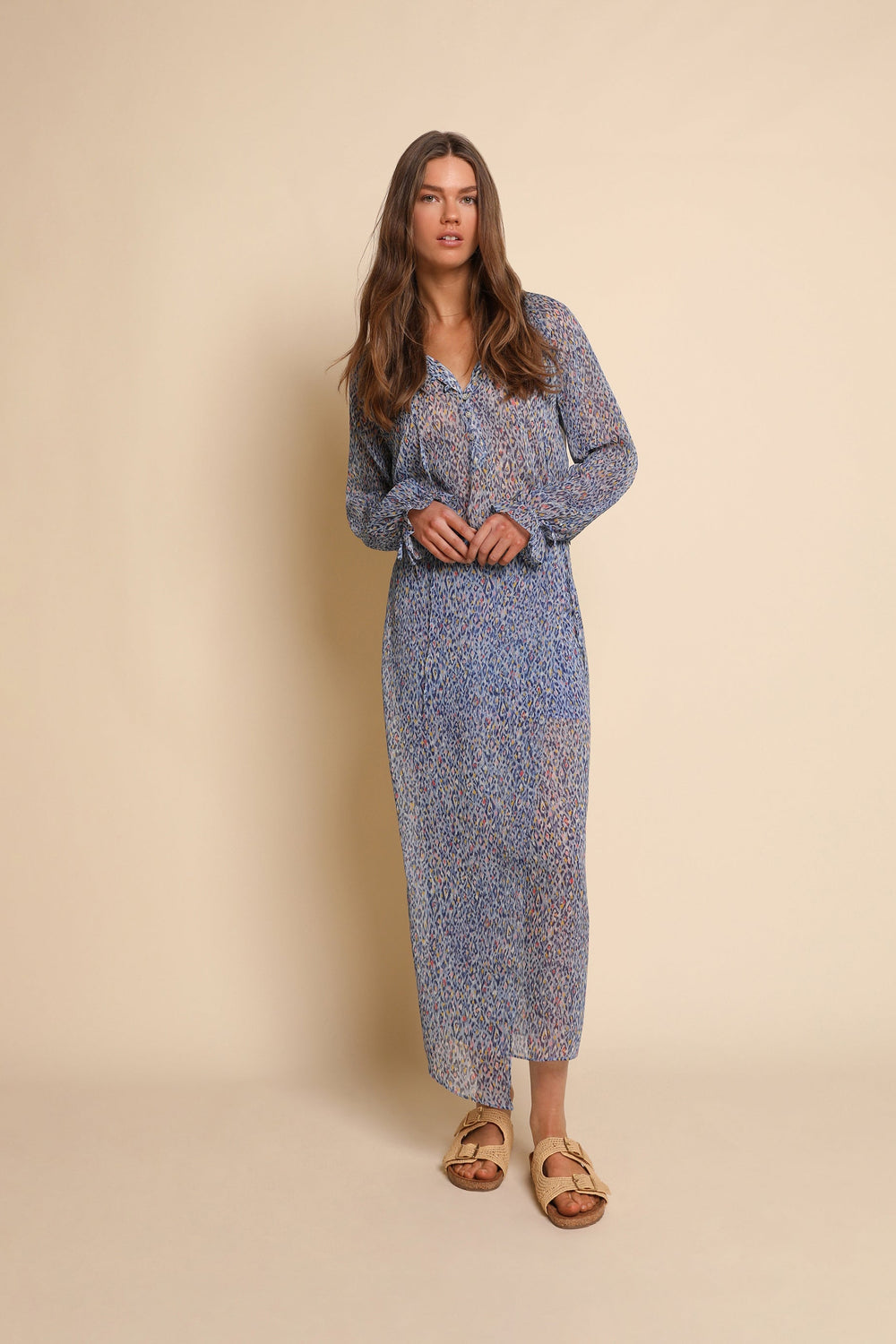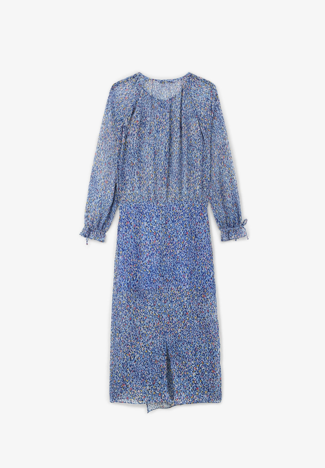 Vestido midi com animal print confecionado em tecido fluido com fio metálico. Corte Regular Fit, decote redondo e fecho com casas dos botões. Manga comprida terminada em punho com laçada. Saia tipo pareo e abertura atrás.