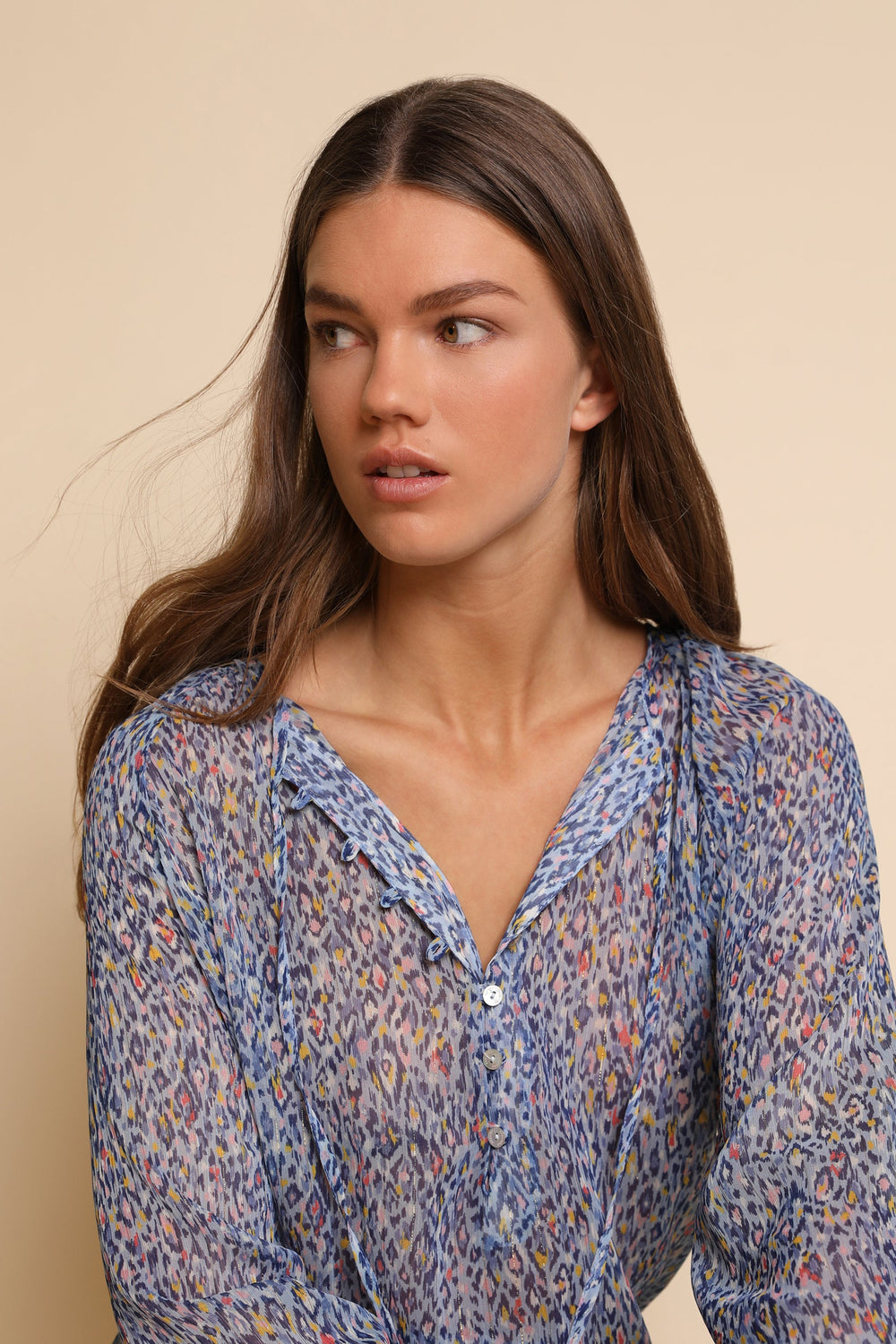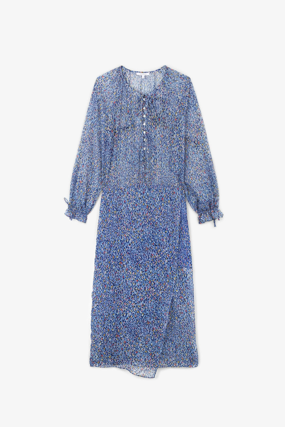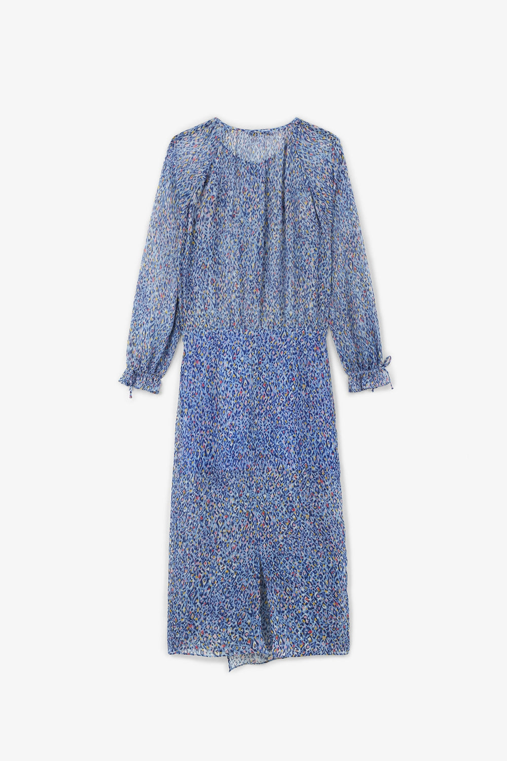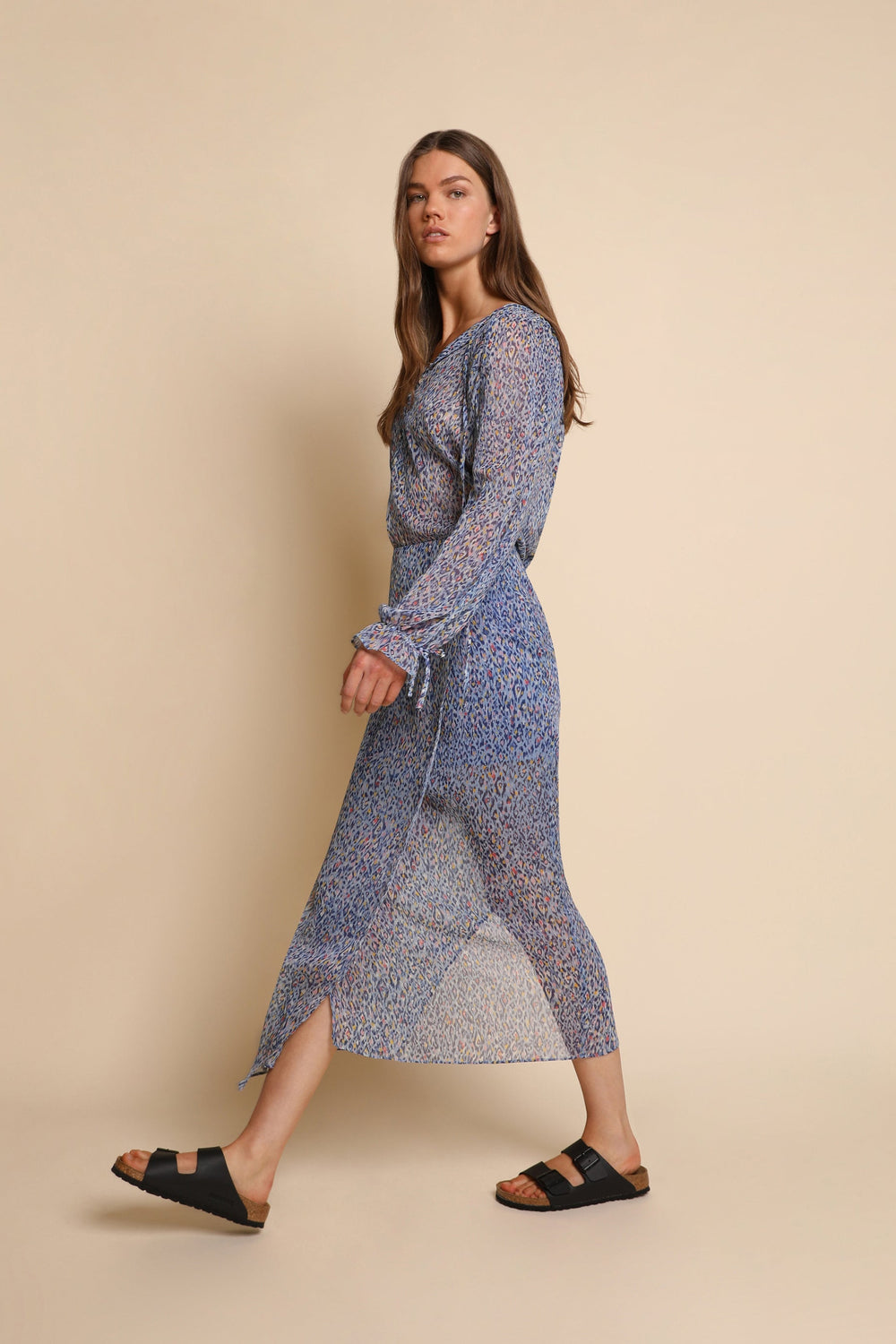 Vestido midi com animal print confecionado em tecido fluido com fio metálico. Corte Regular Fit, decote redondo e fecho com casas dos botões. Manga comprida terminada em punho com laçada. Saia tipo pareo e abertura atrás.