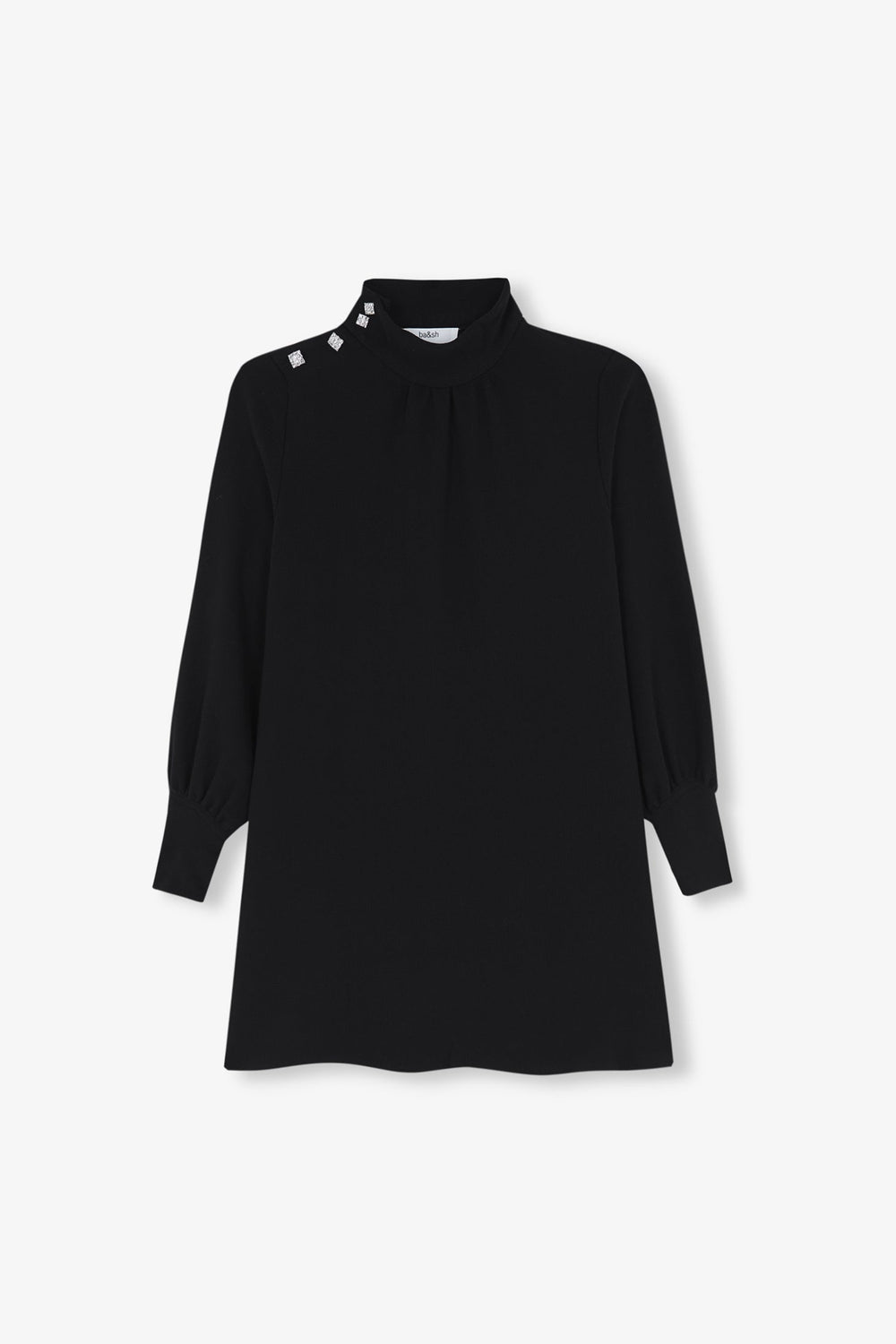 - Detalle de botones joya de dos tamaños en el cuello y en el hombro.