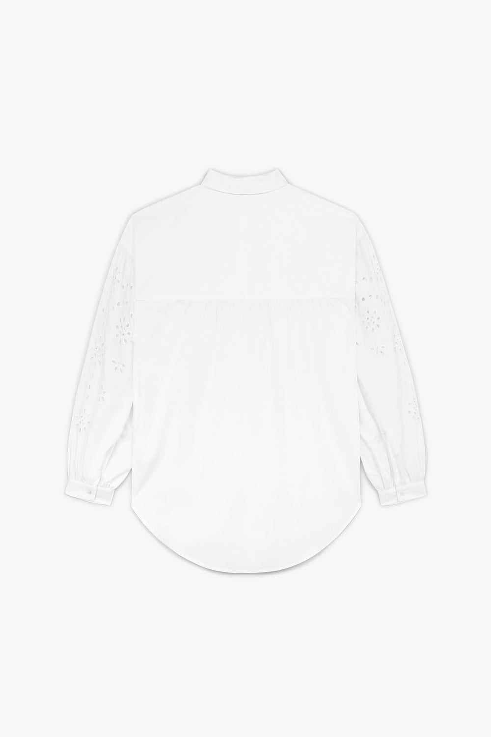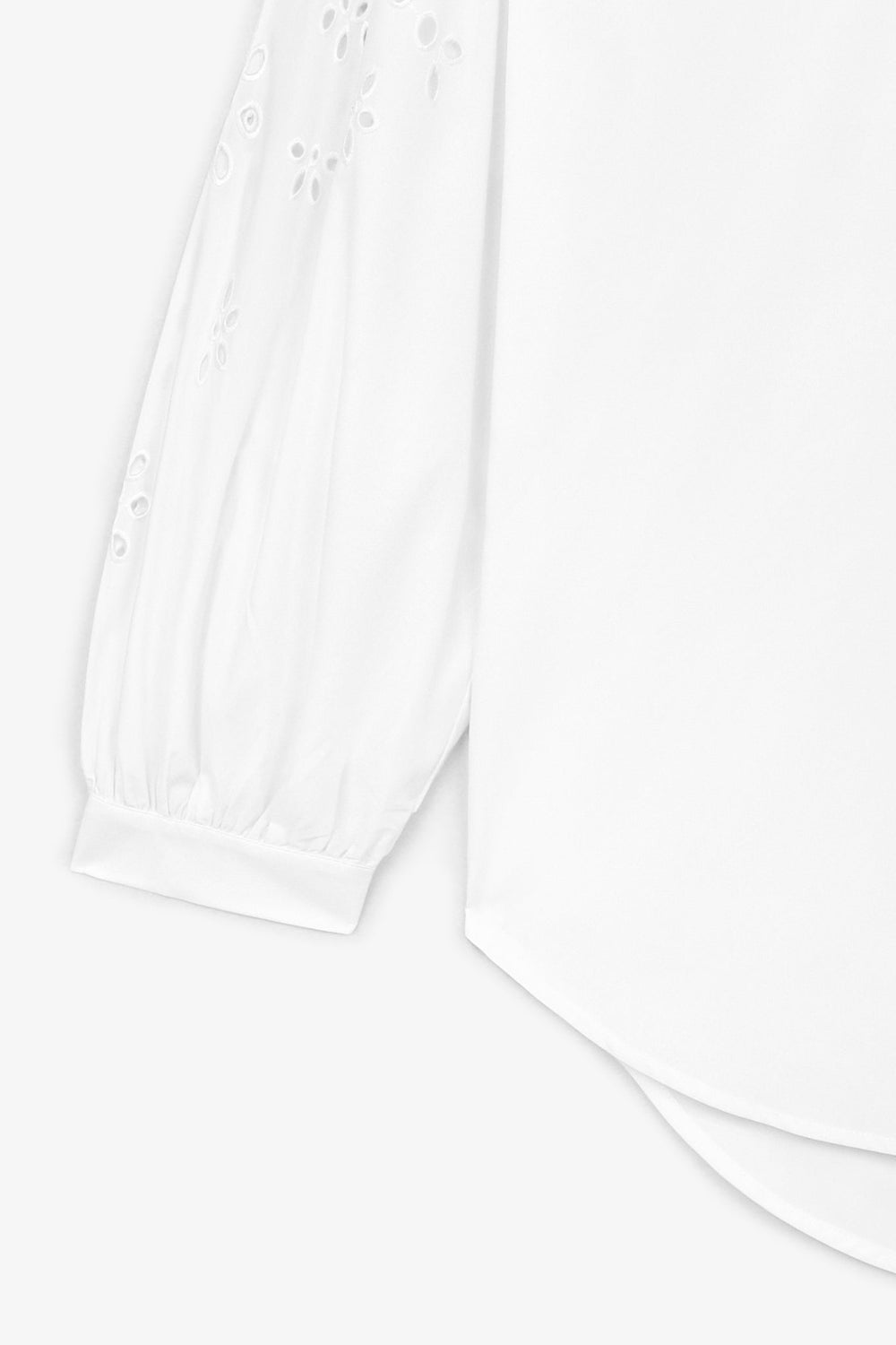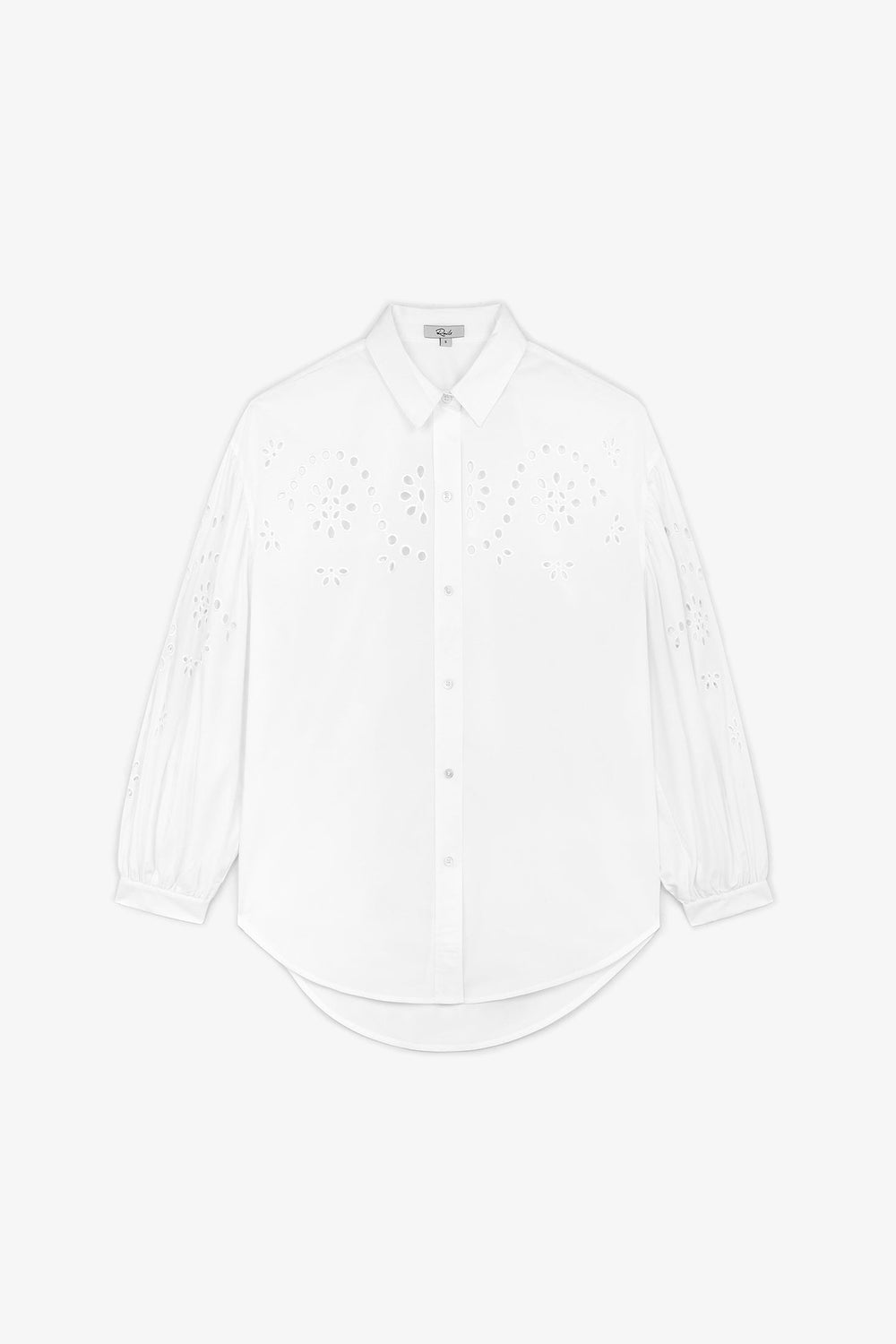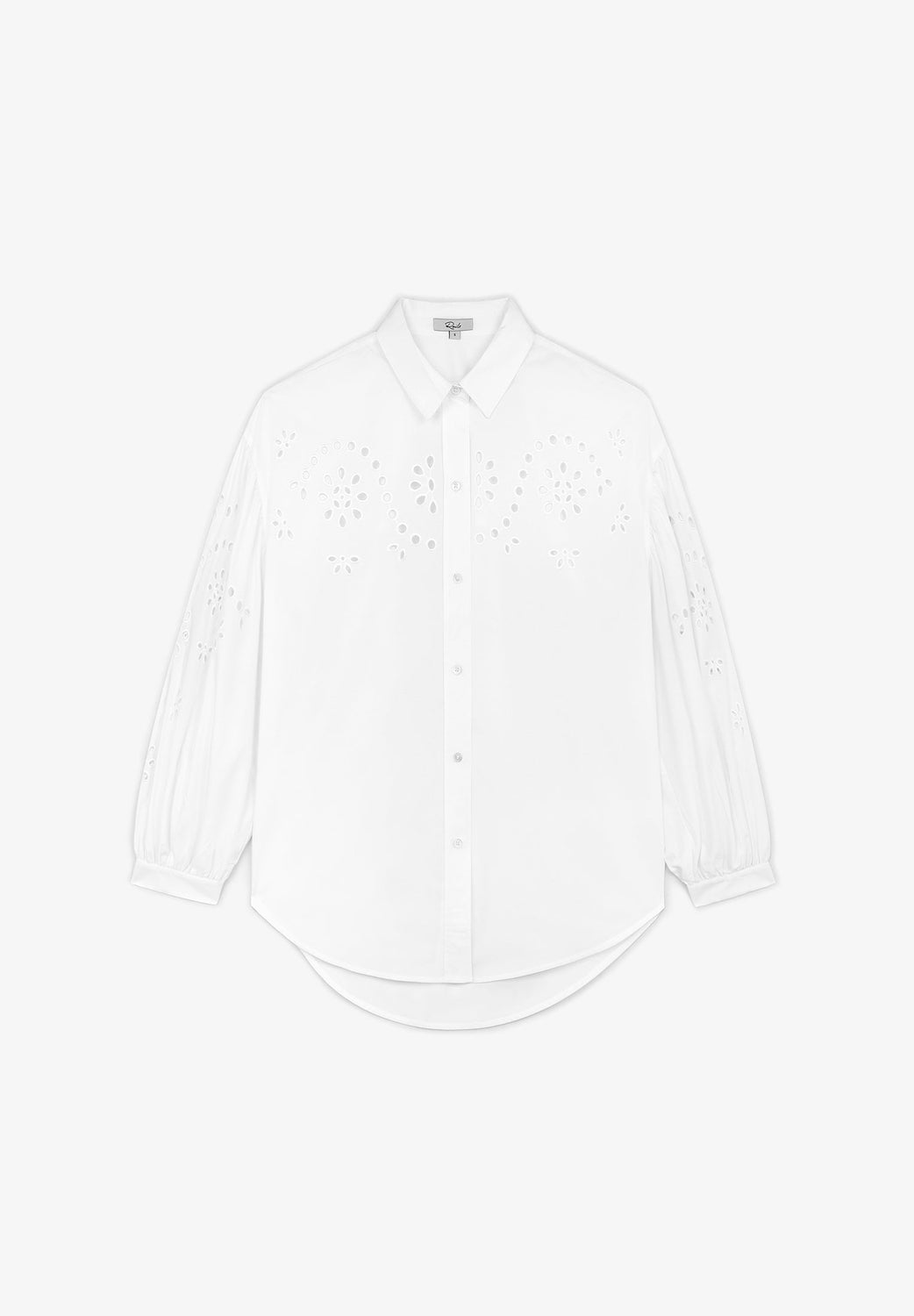 - Bordado de casas dos botões no decote dianteiro e nas mangas.