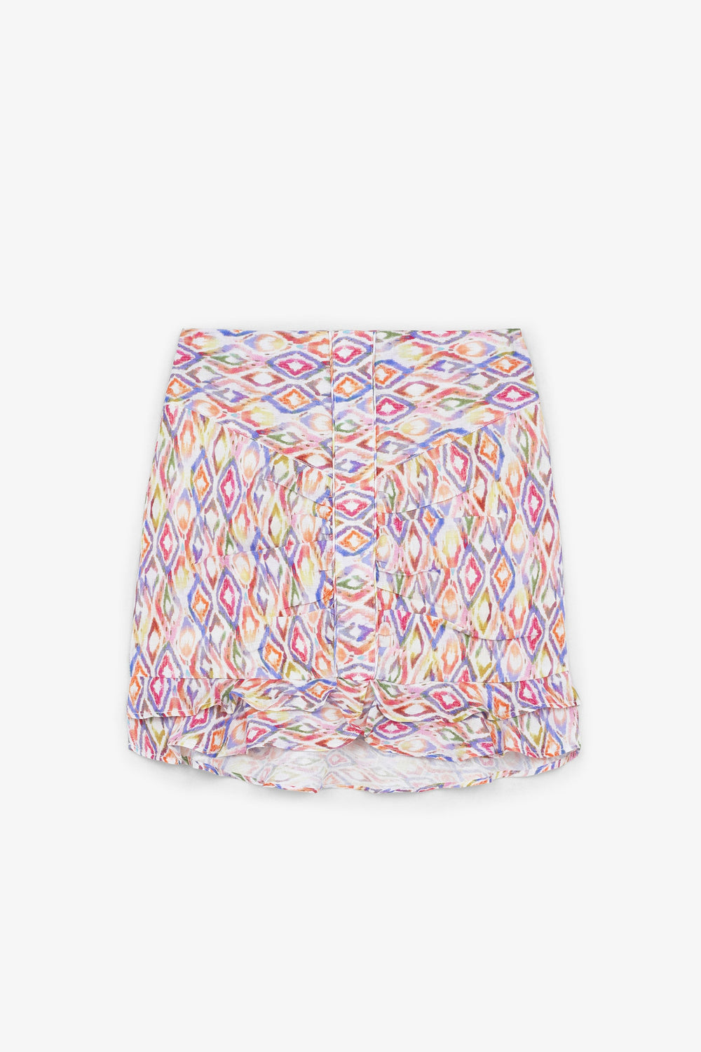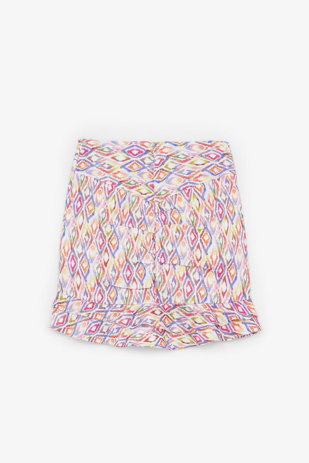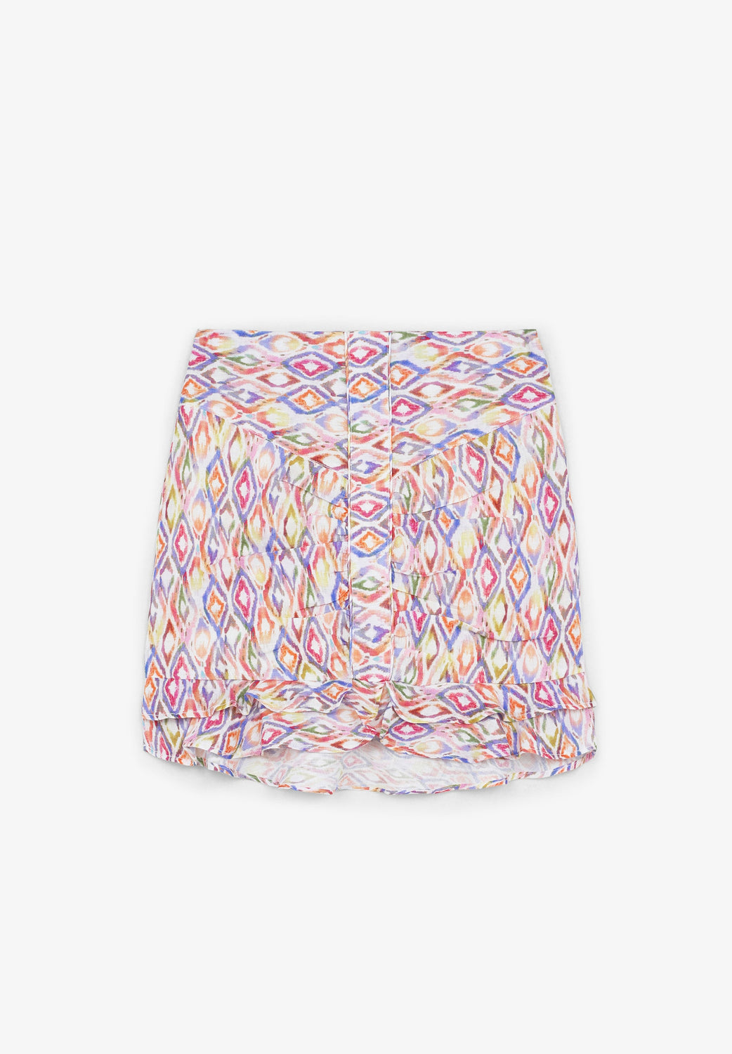 Saia com motivo étnico confecionada em tecido 100% linho. Corte Slim Fit, fecho com zip e bainha com folhos.
