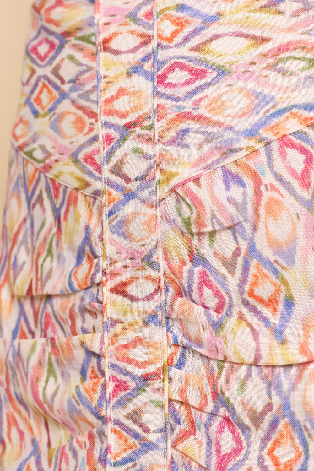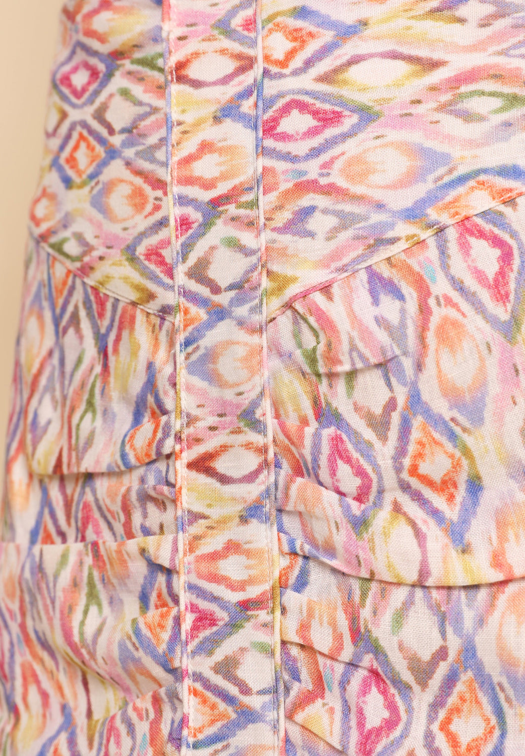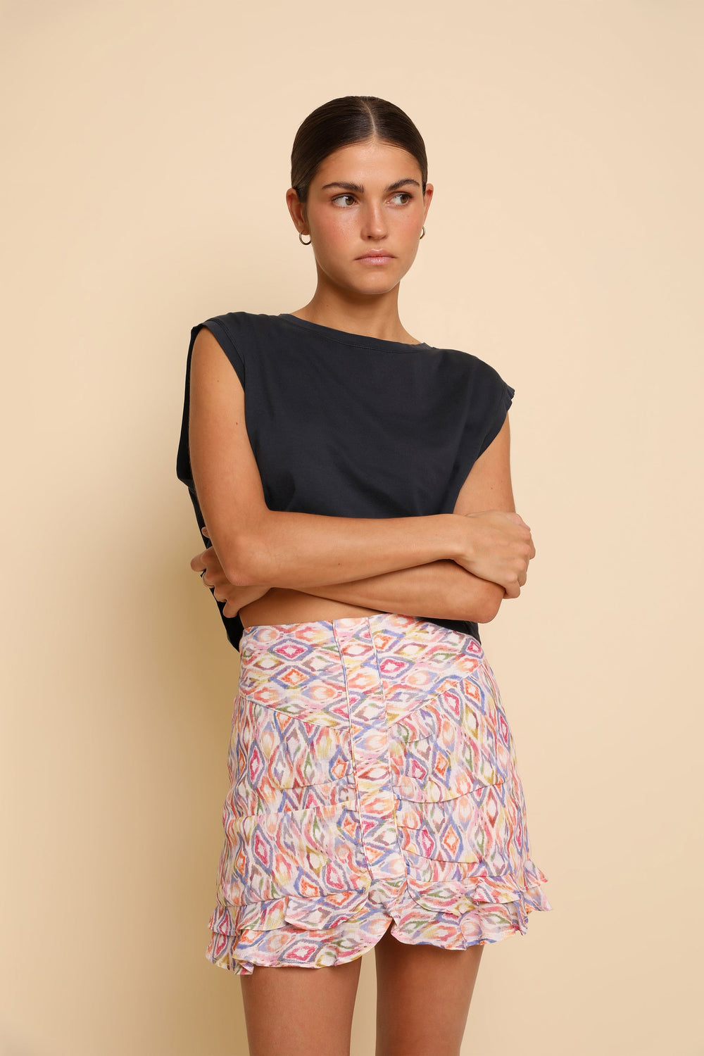 Saia com motivo étnico confecionada em tecido 100% linho. Corte Slim Fit, fecho com zip e bainha com folhos.