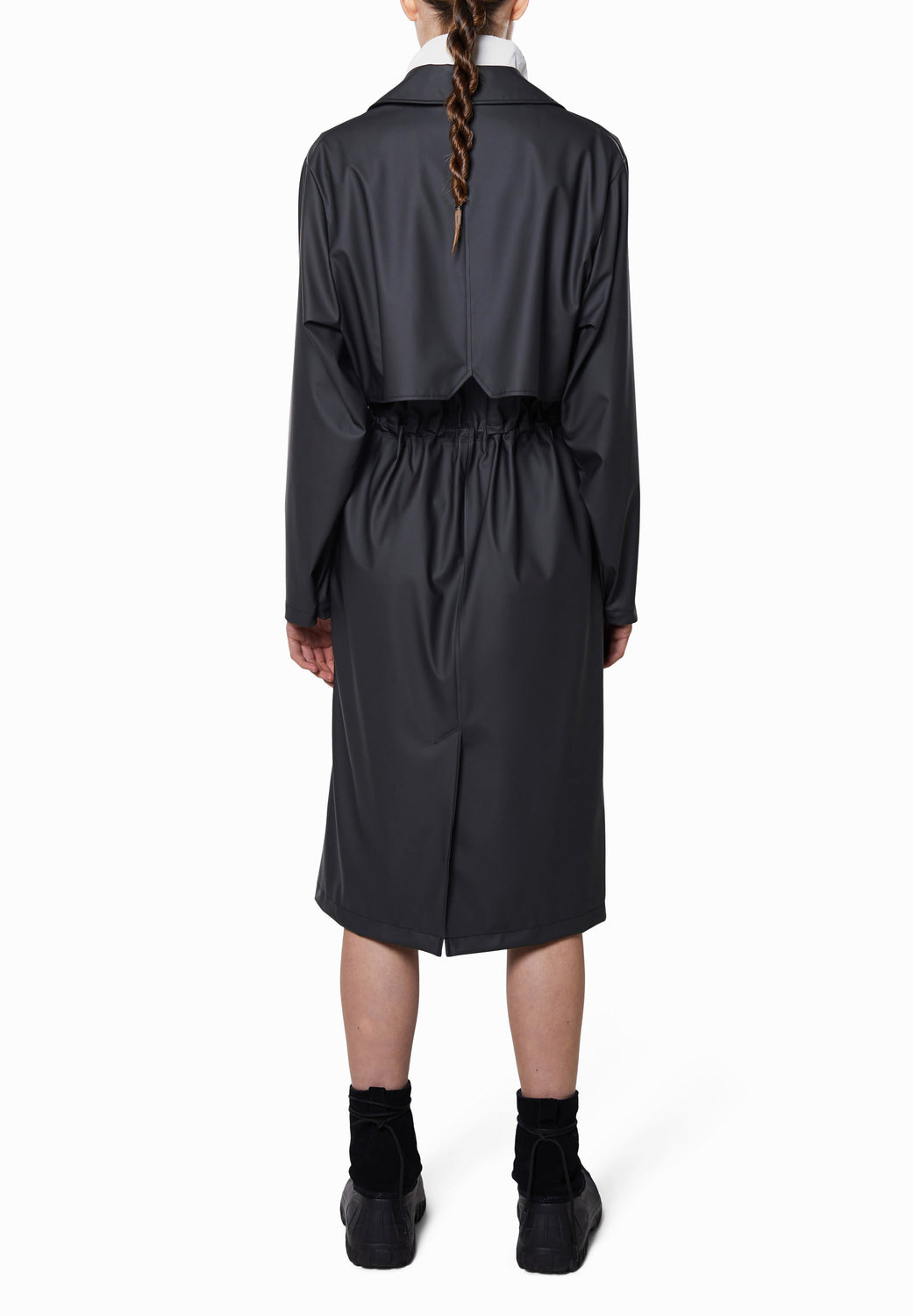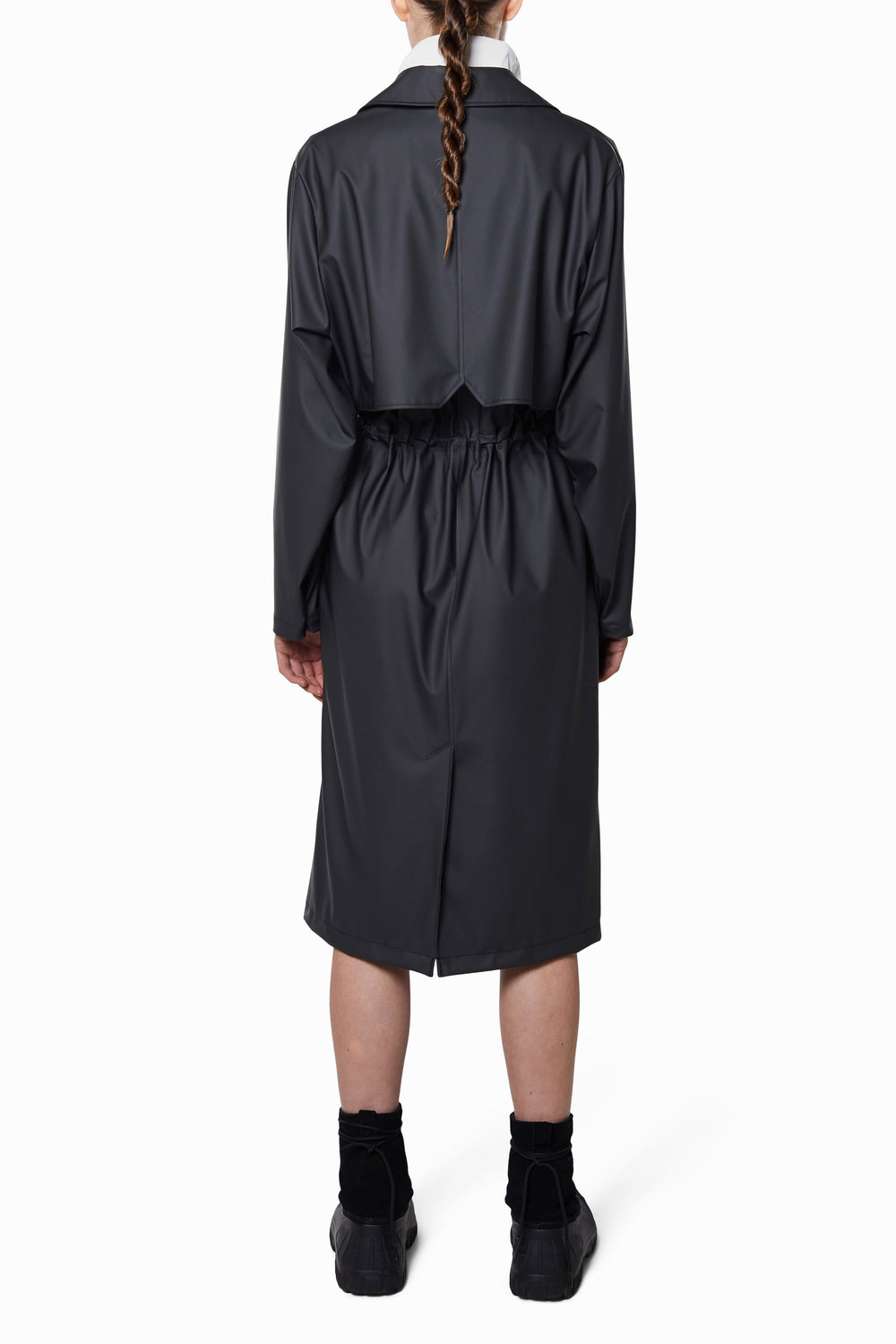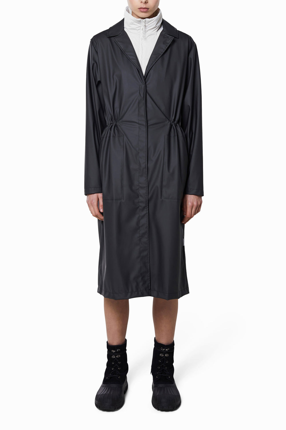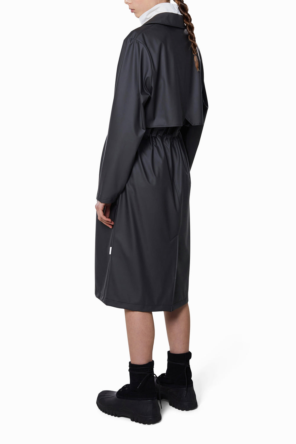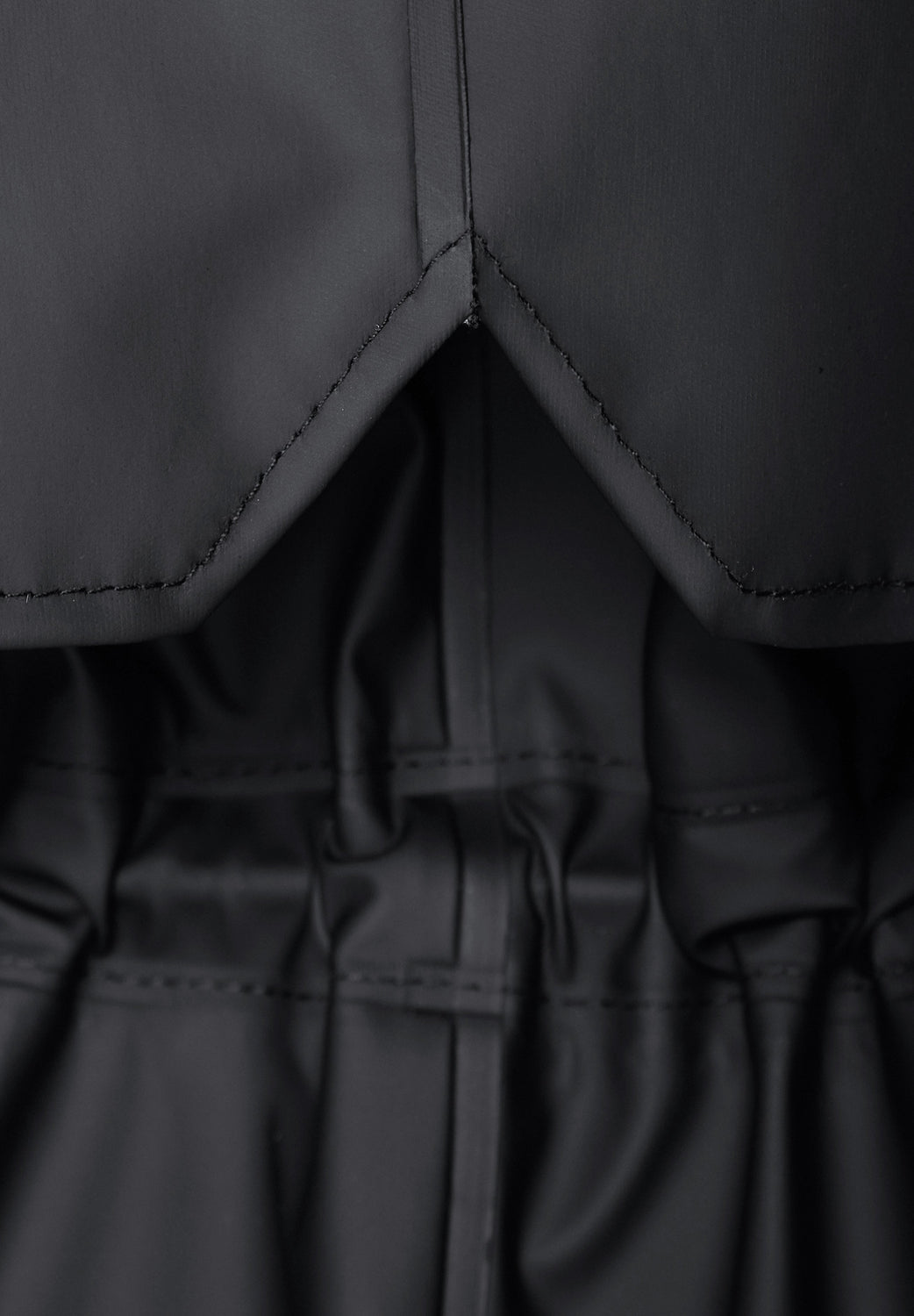 Casaco Rains confecionado em tecido impermeável com mistura de poliéster e poliuretano.
