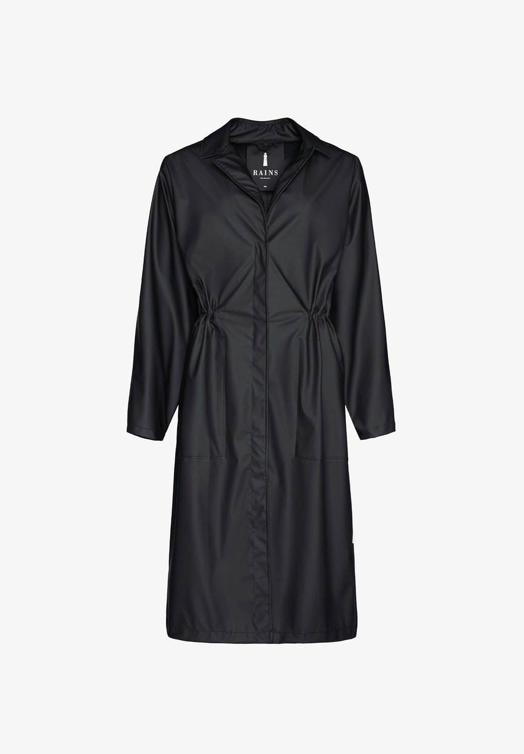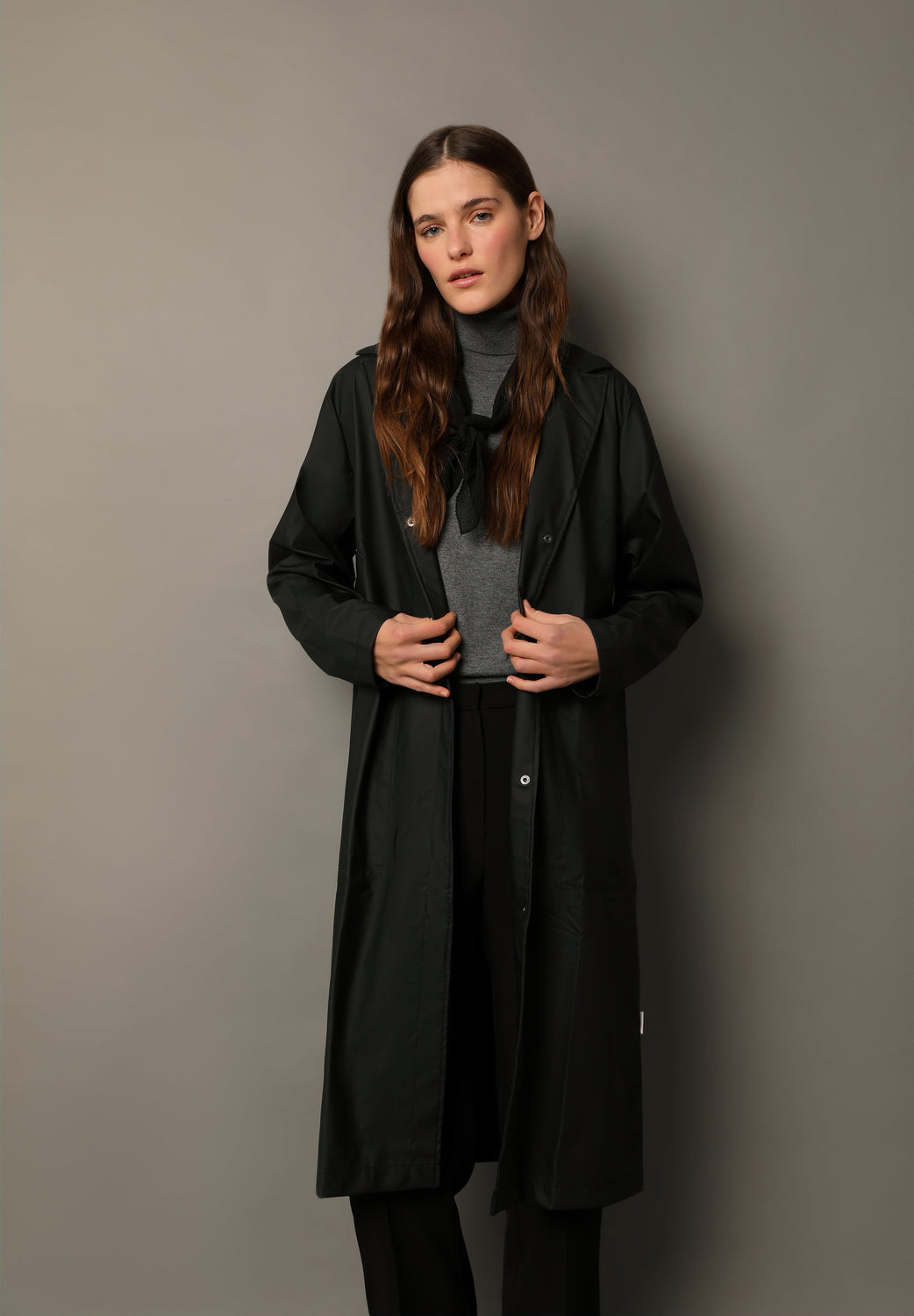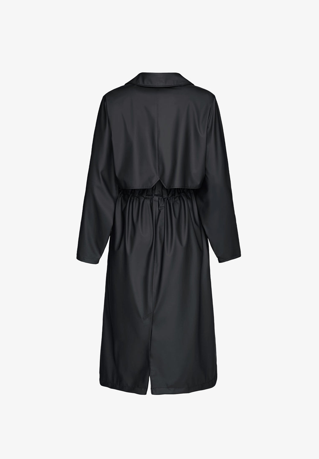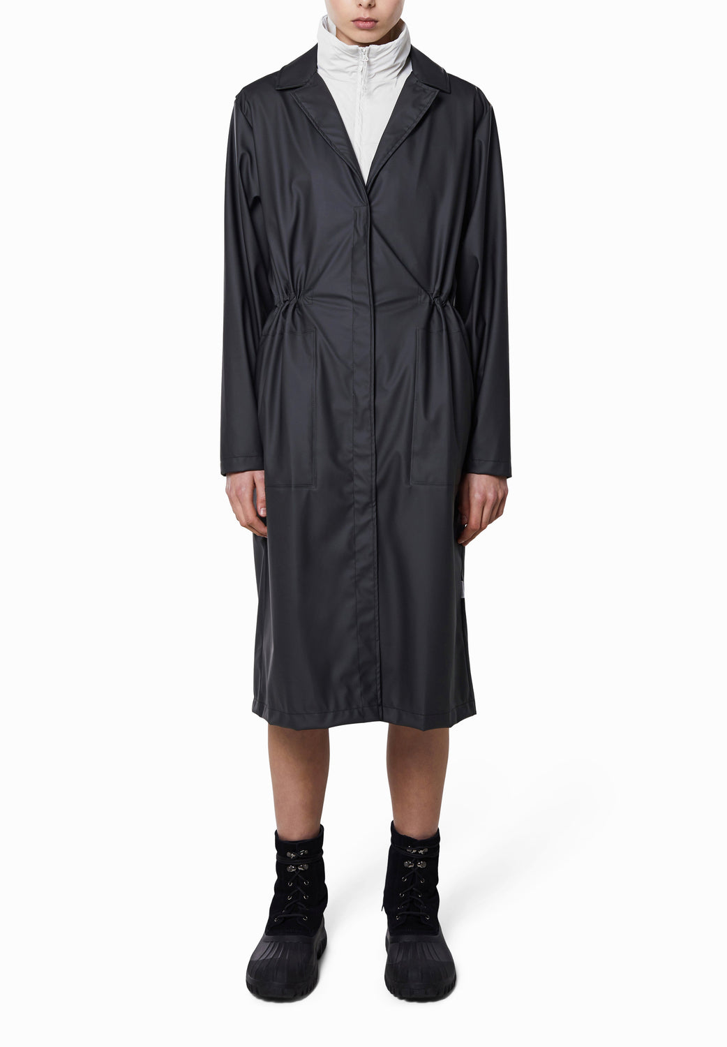 Casaco Rains confecionado em tecido impermeável com mistura de poliéster e poliuretano.