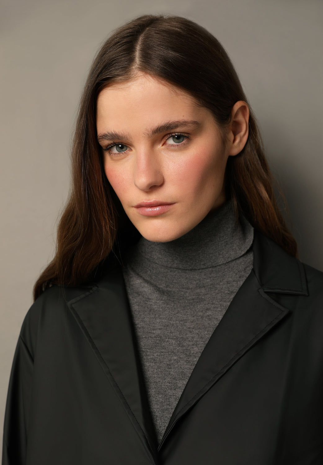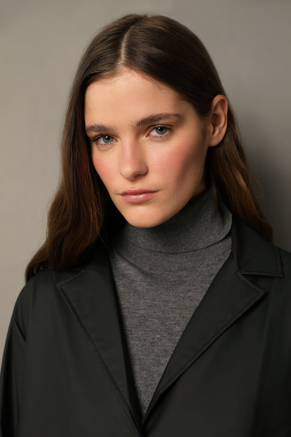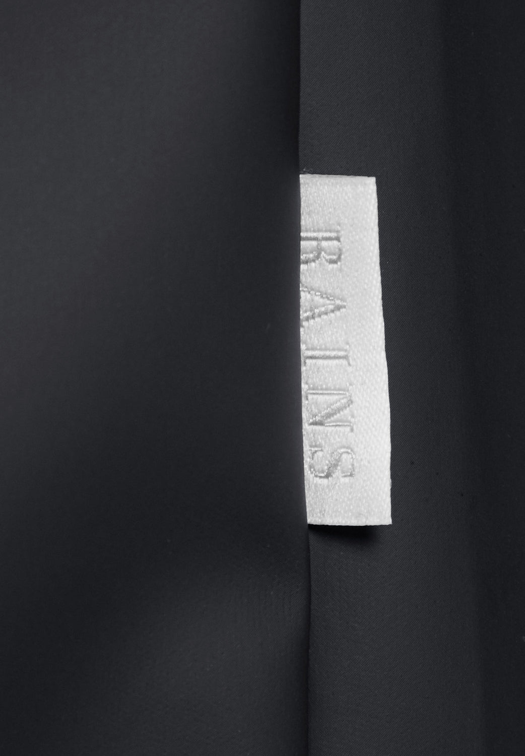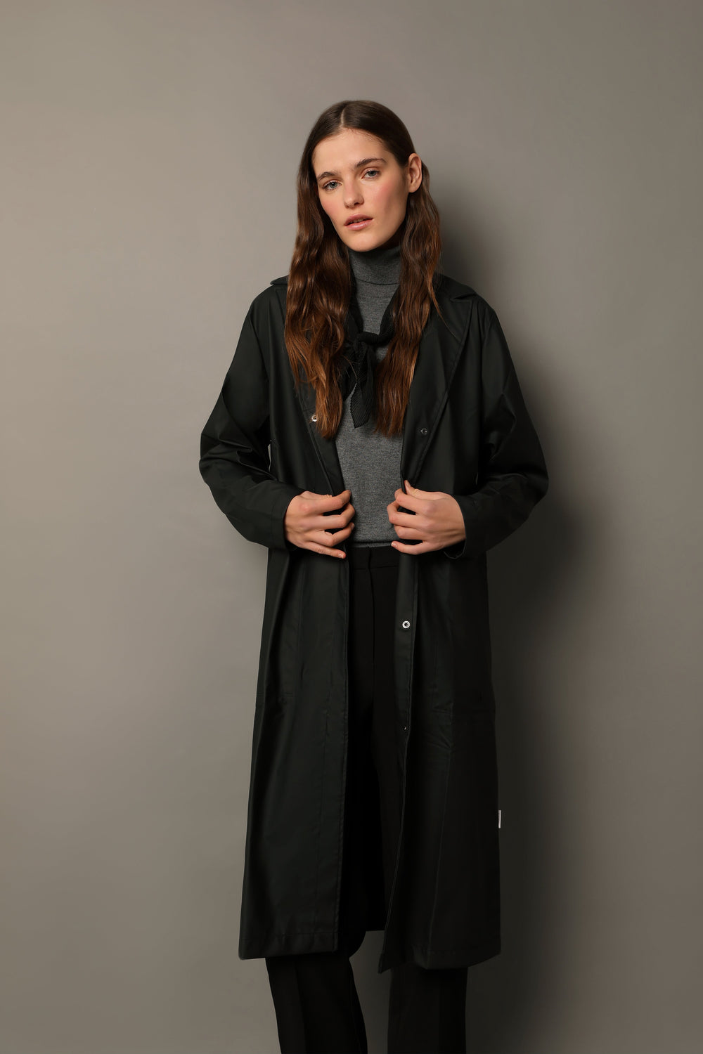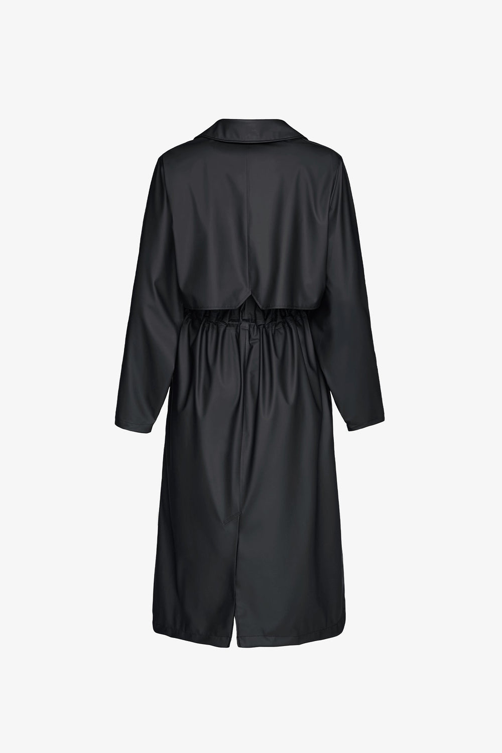 Casaco Rains confecionado em tecido impermeável com mistura de poliéster e poliuretano.