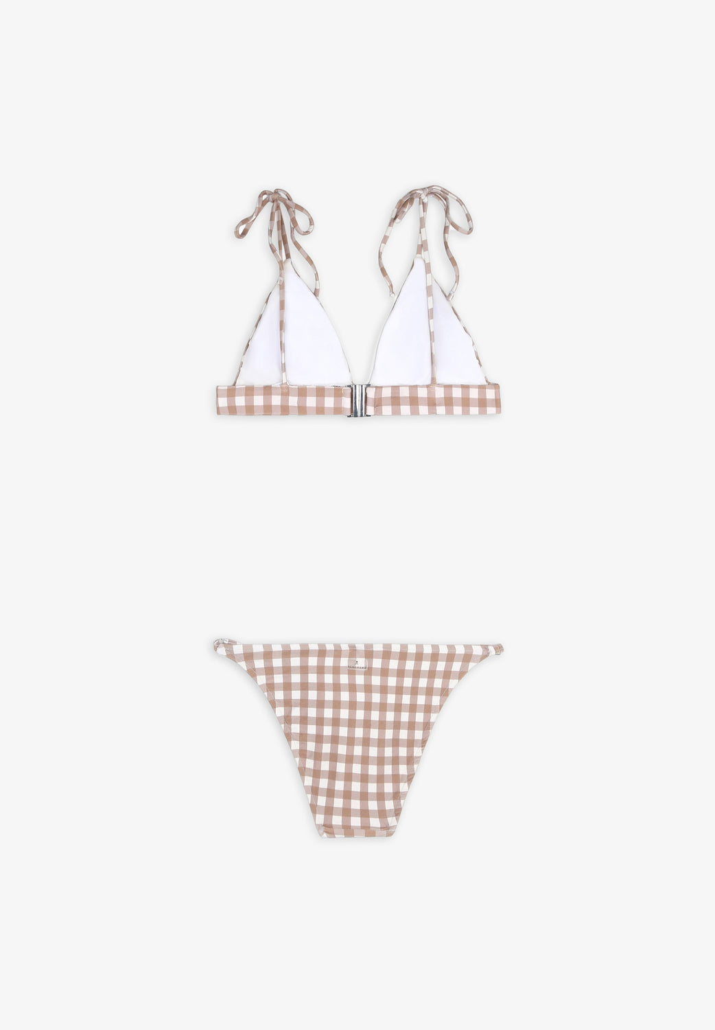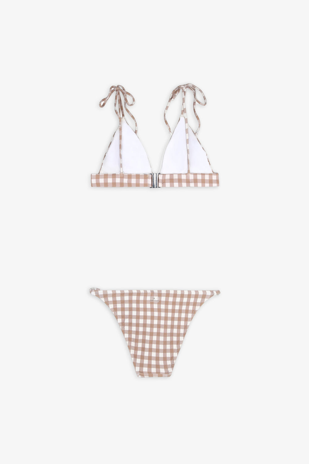 Biquíni com padrão vichy confecionado em tecido técnico. Parte de cima com alças de laçada e fecho traseiro e cuecas clássicas.