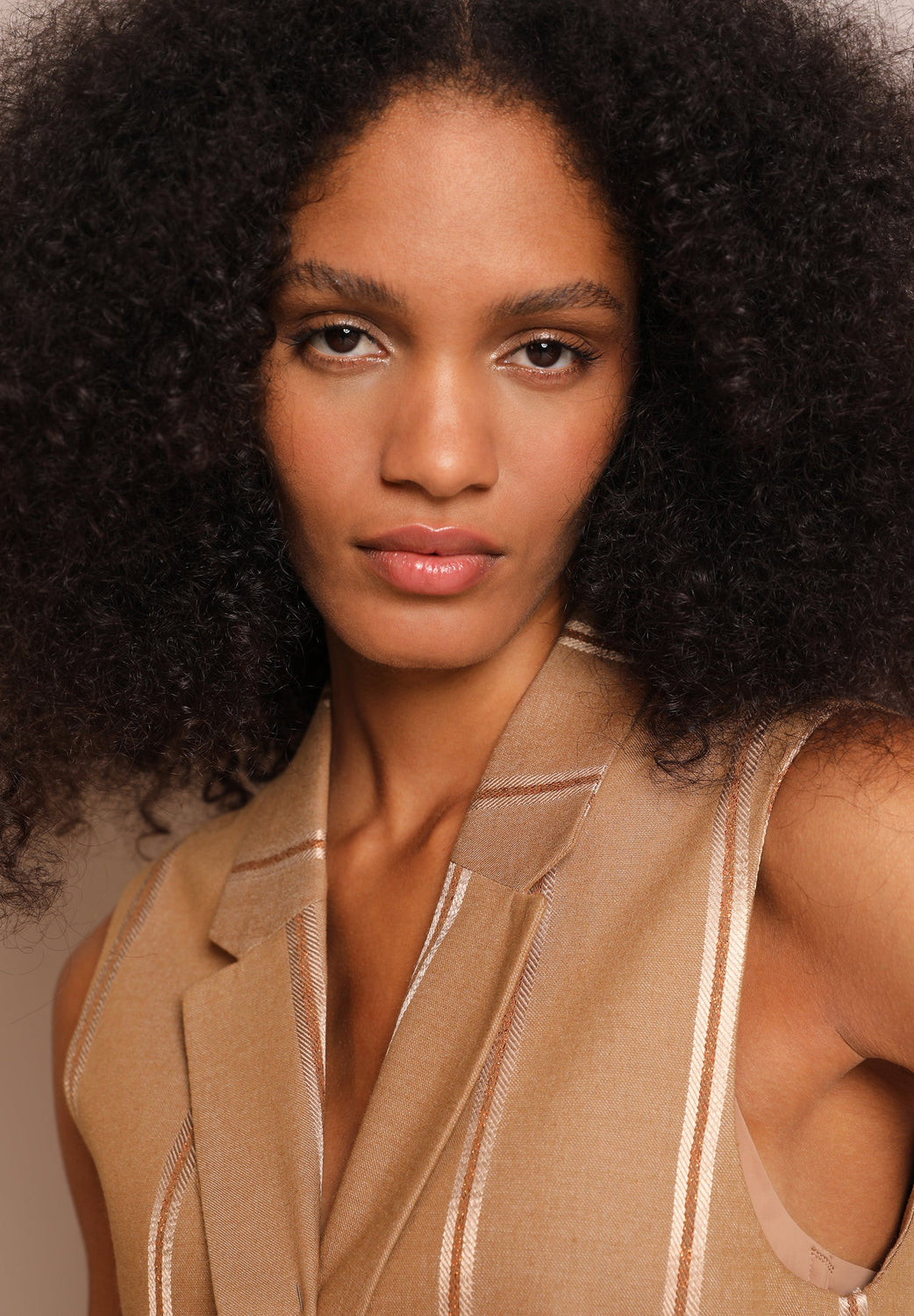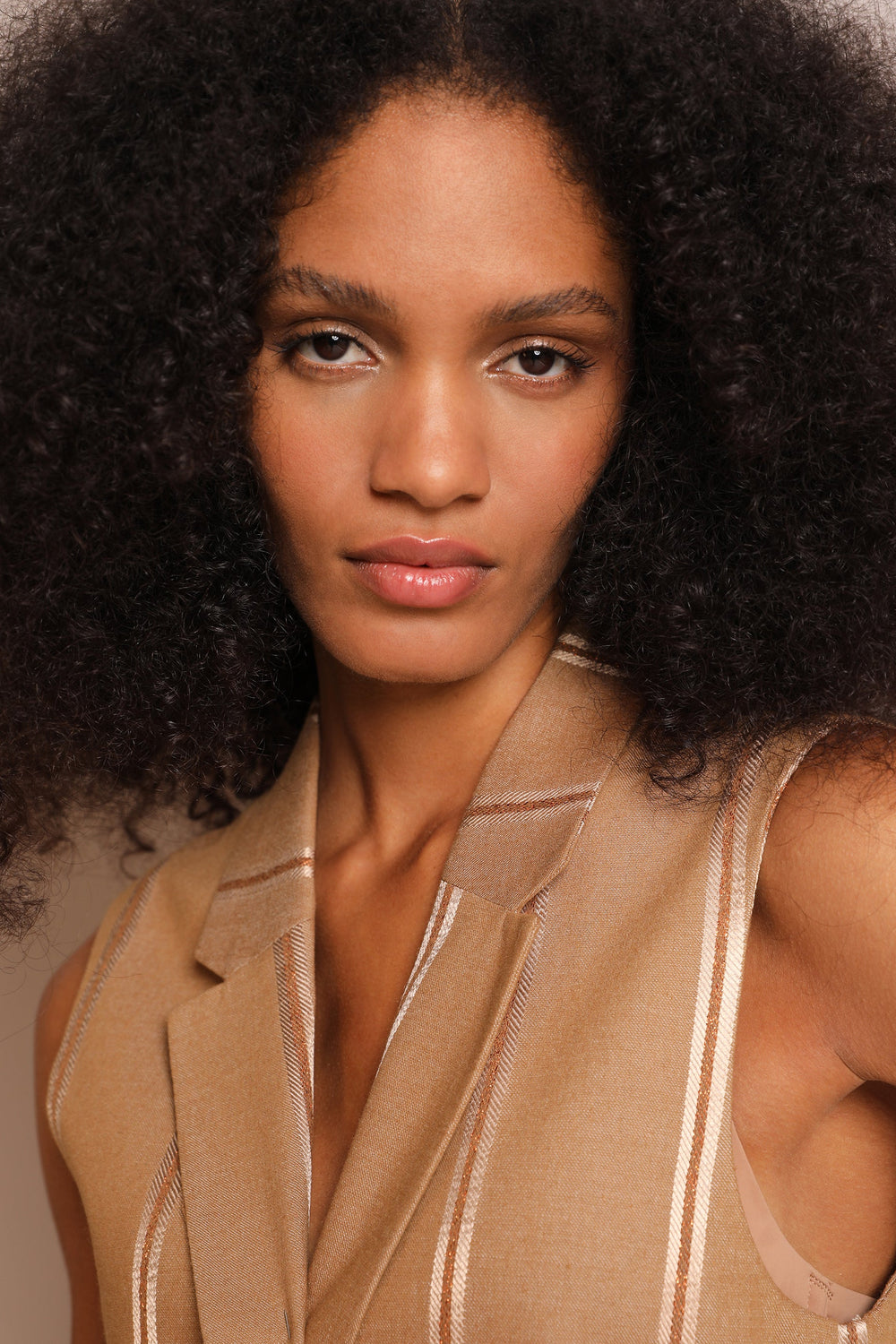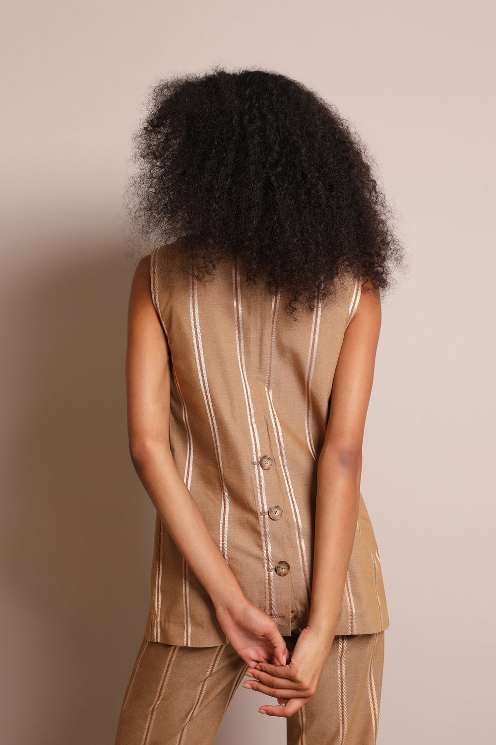 Colete com riscas metalizadas confecionado em tecido de mistura de algodão. Corte Regular Fit, gola com lapelas, decote em bico e fecho com botões. Manga cava e bolsos escondidos.