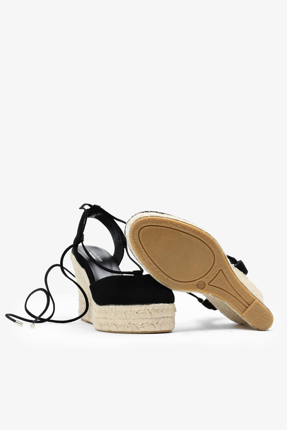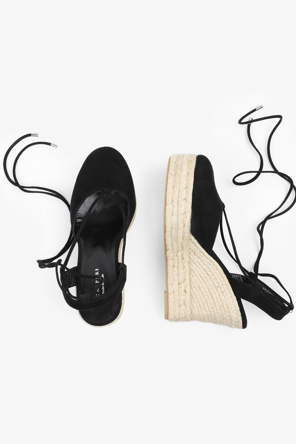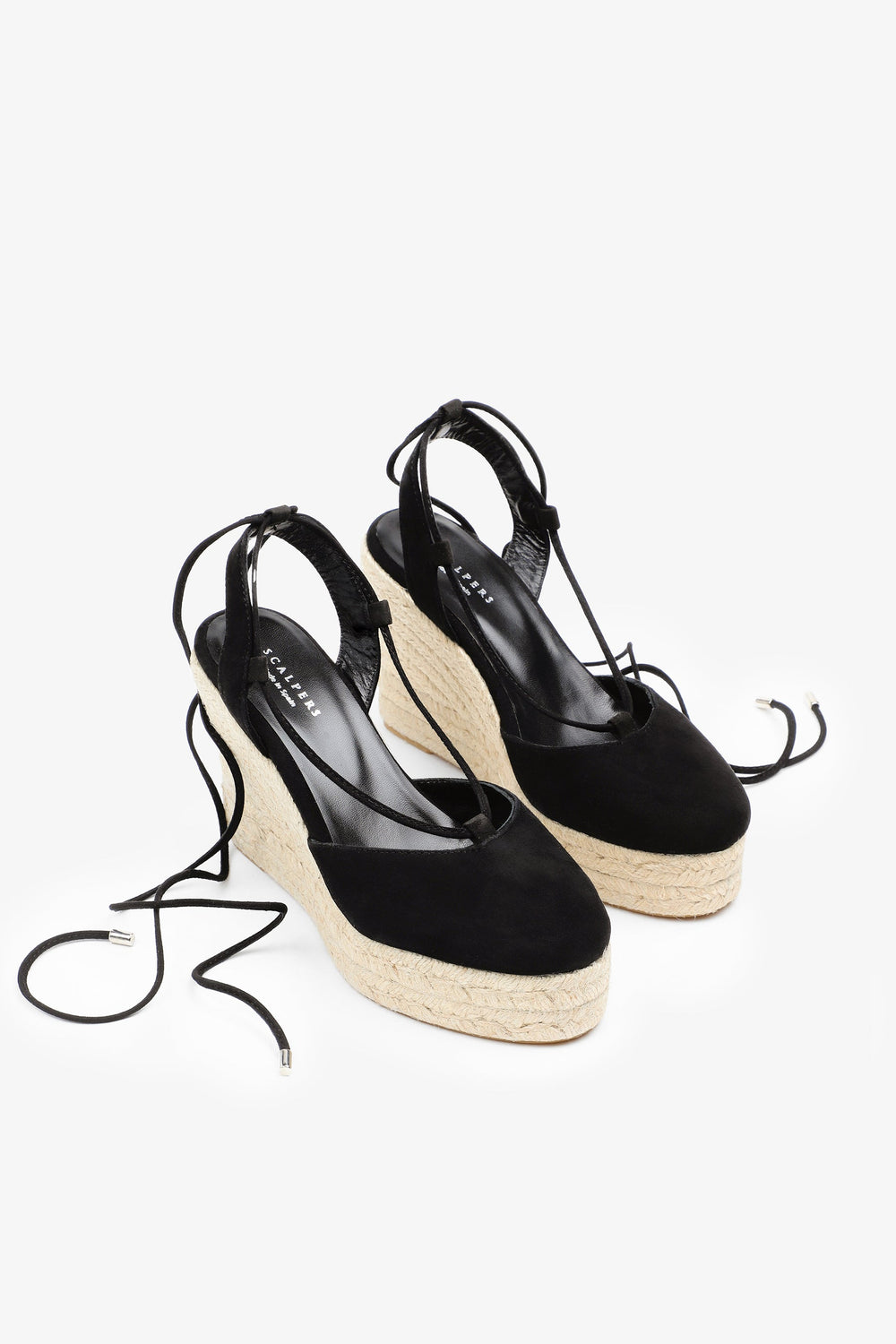 Sapatos tipo alpergata confecionada em camurça bovina. Fecho com cordões, sola de borracha e cunha de 100% juta. Altura do tacão: 10,5 cm / Plataforma: 2,5 cm.