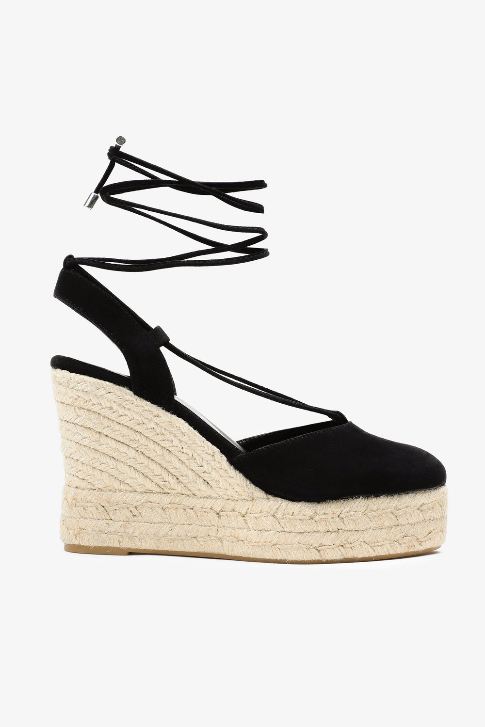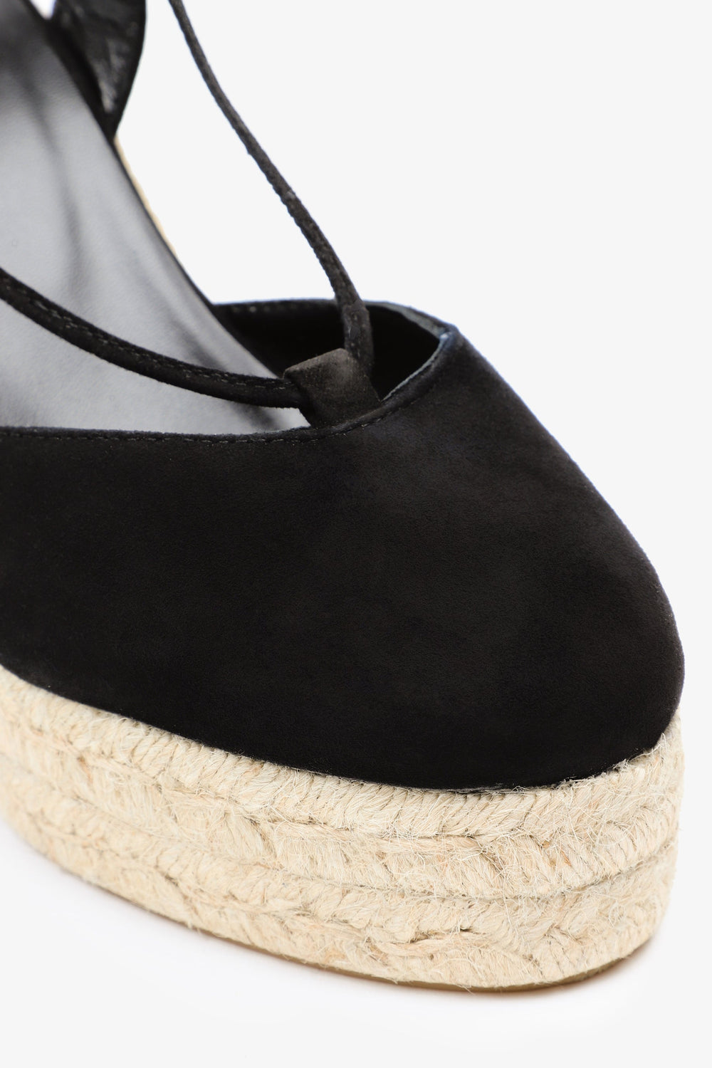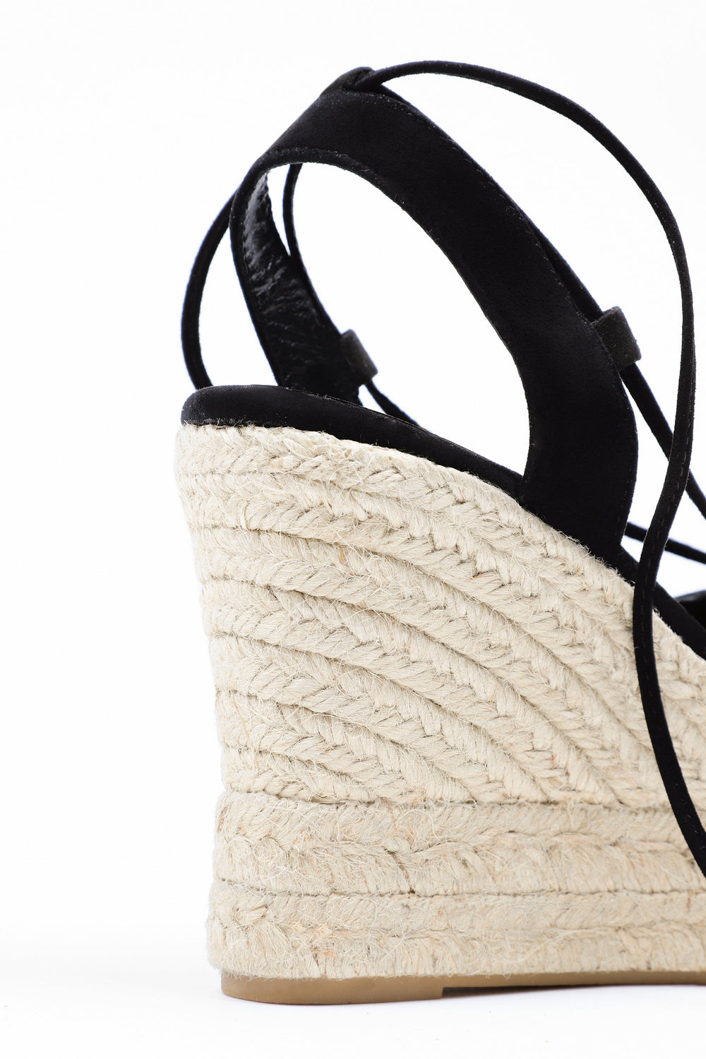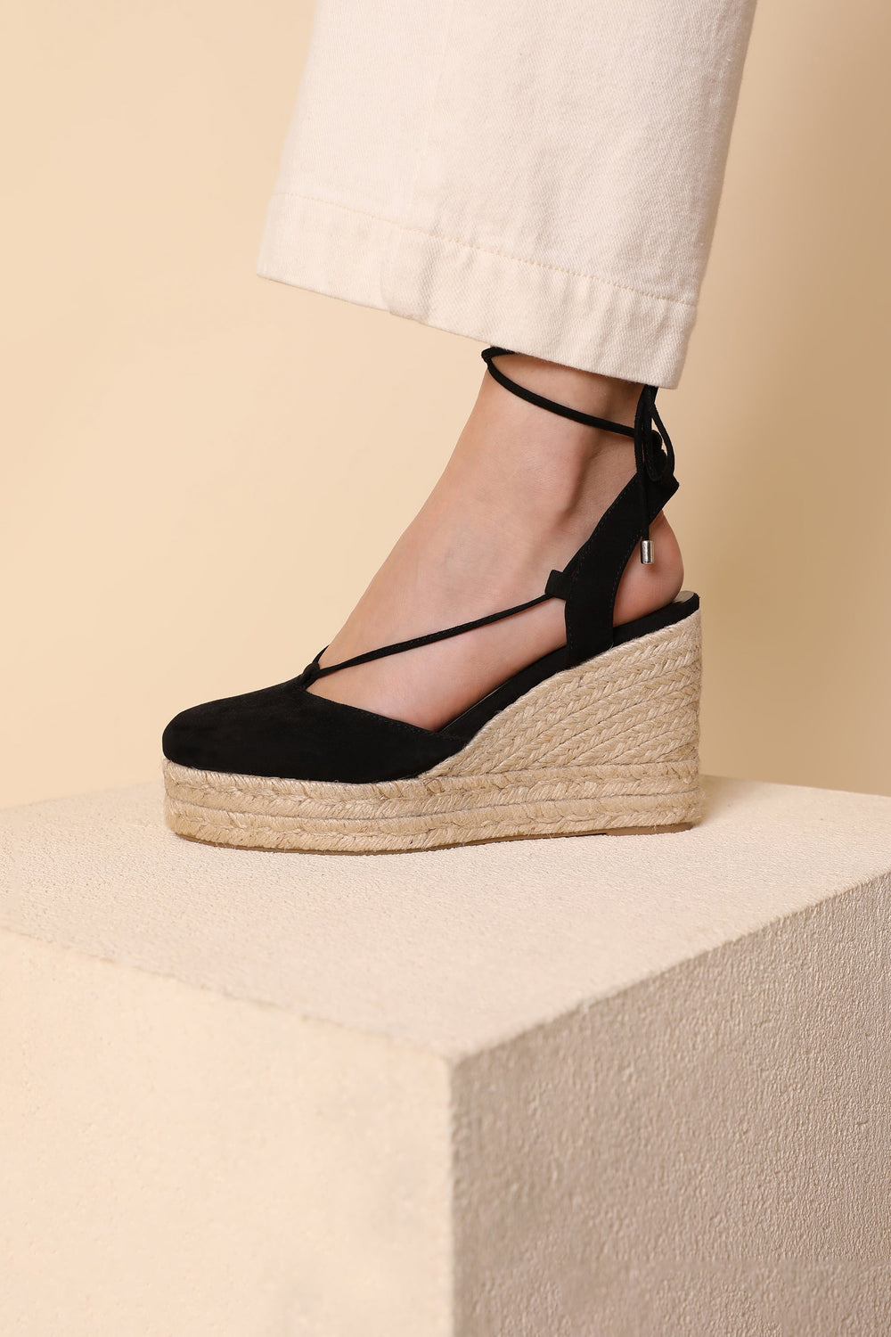 Sapatos tipo alpergata confecionada em camurça bovina. Fecho com cordões, sola de borracha e cunha de 100% juta. Altura do tacão: 10,5 cm / Plataforma: 2,5 cm.