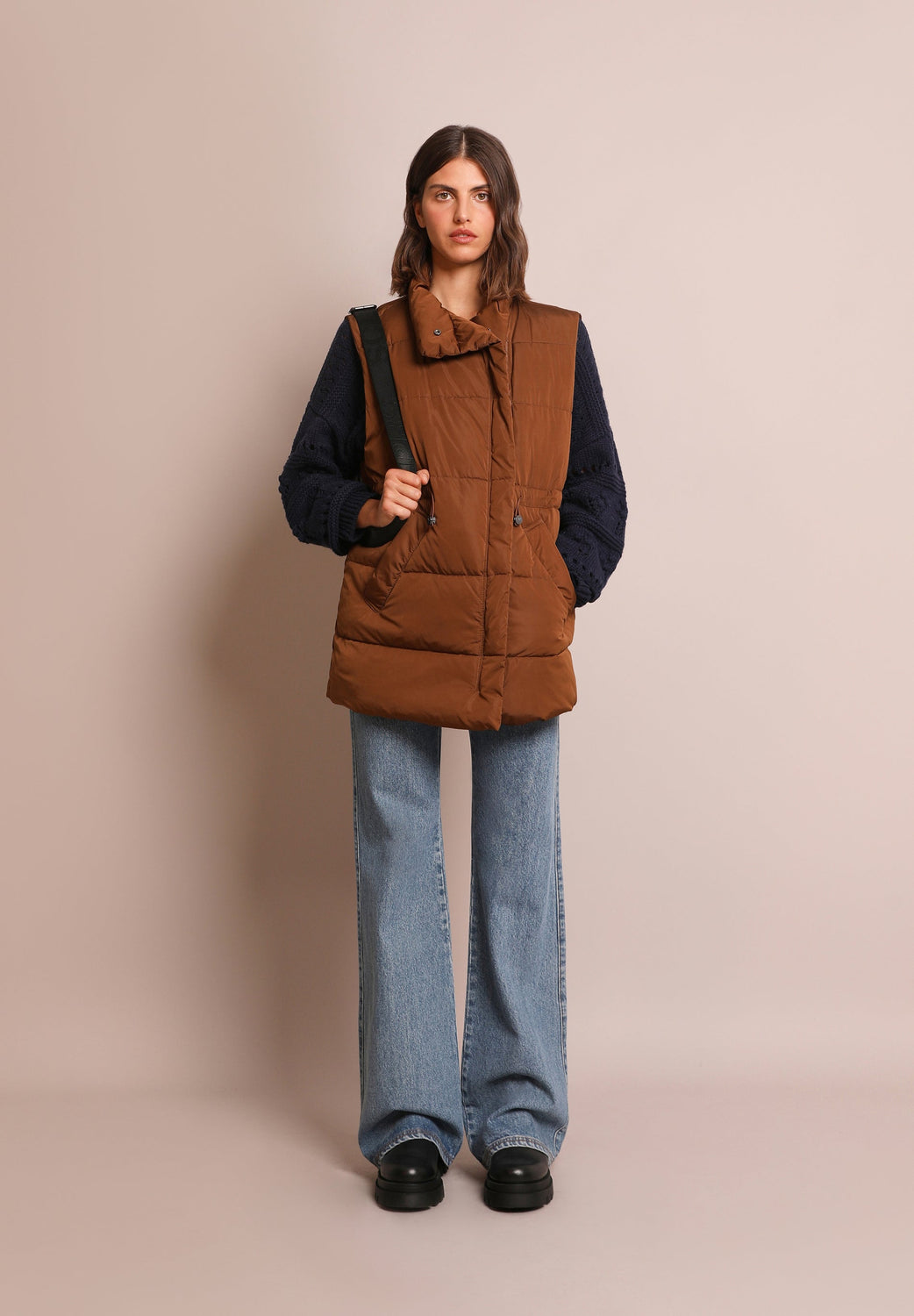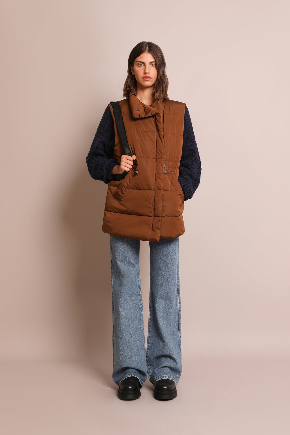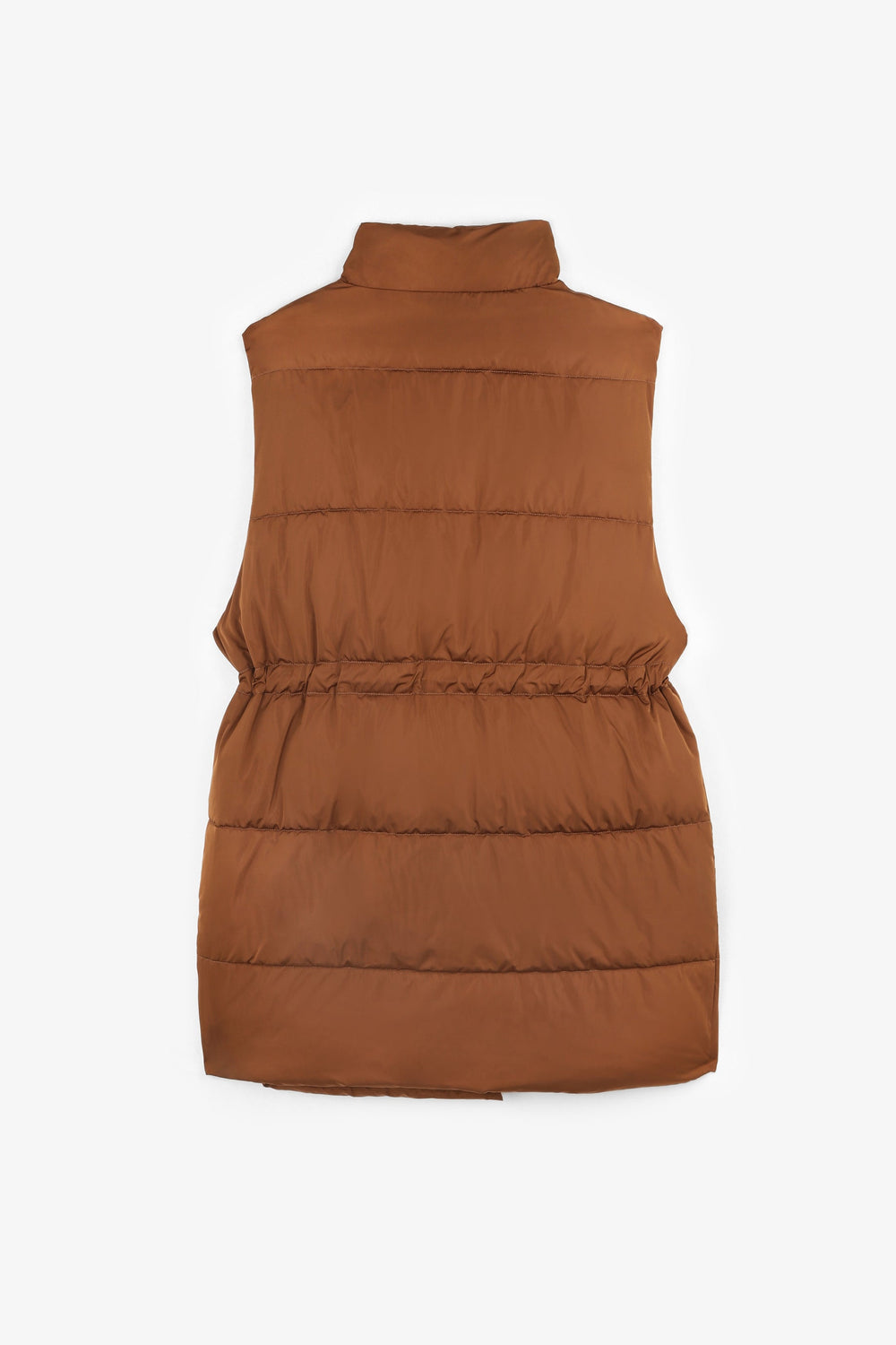 Colete acolchoado de comprimento midi confecionado em tecido técnico. Corte Regular Fit com ajustadores na cintura, fecho com fecho de correr e botões de pressão e gola subida. Bolsos laterais.