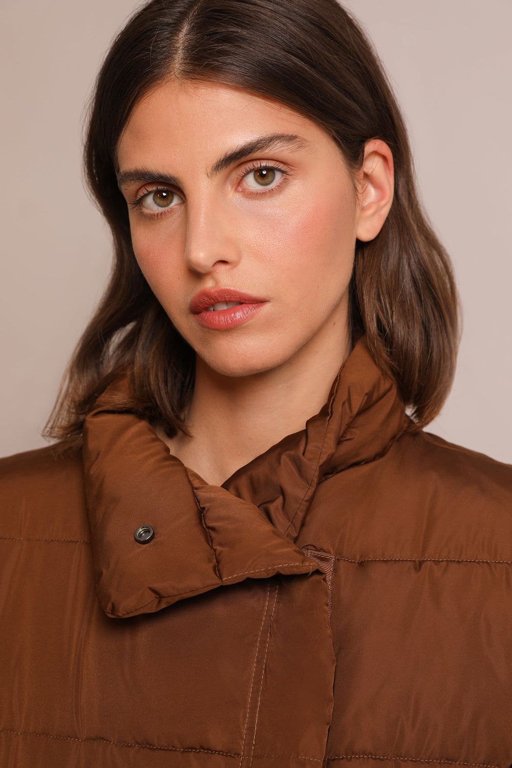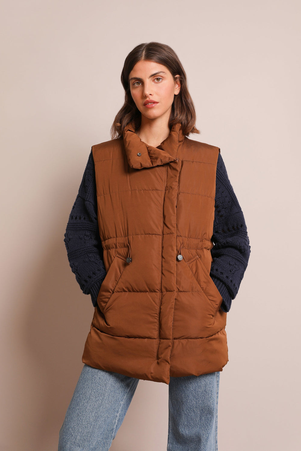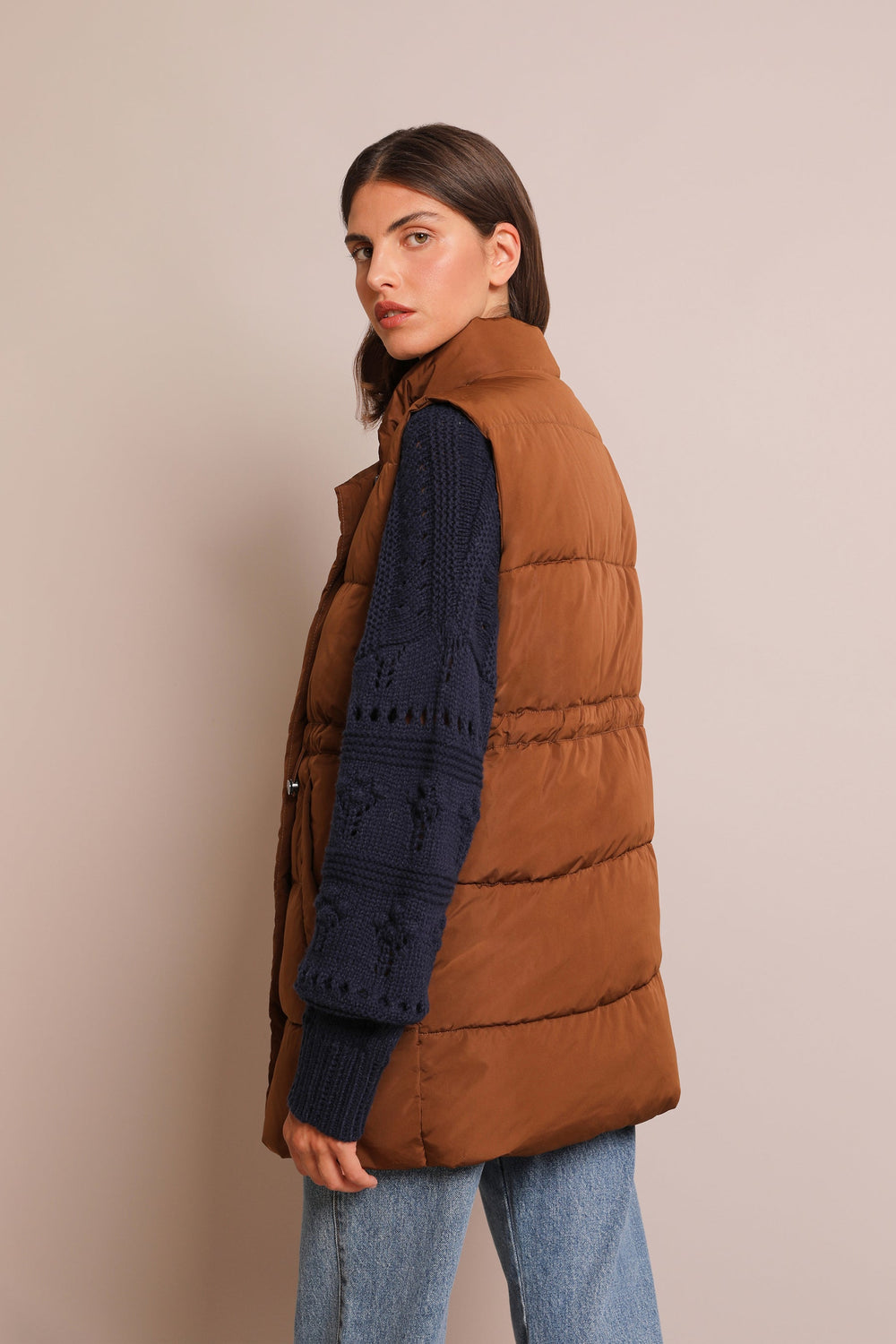 Colete acolchoado de comprimento midi confecionado em tecido técnico. Corte Regular Fit com ajustadores na cintura, fecho com fecho de correr e botões de pressão e gola subida. Bolsos laterais.