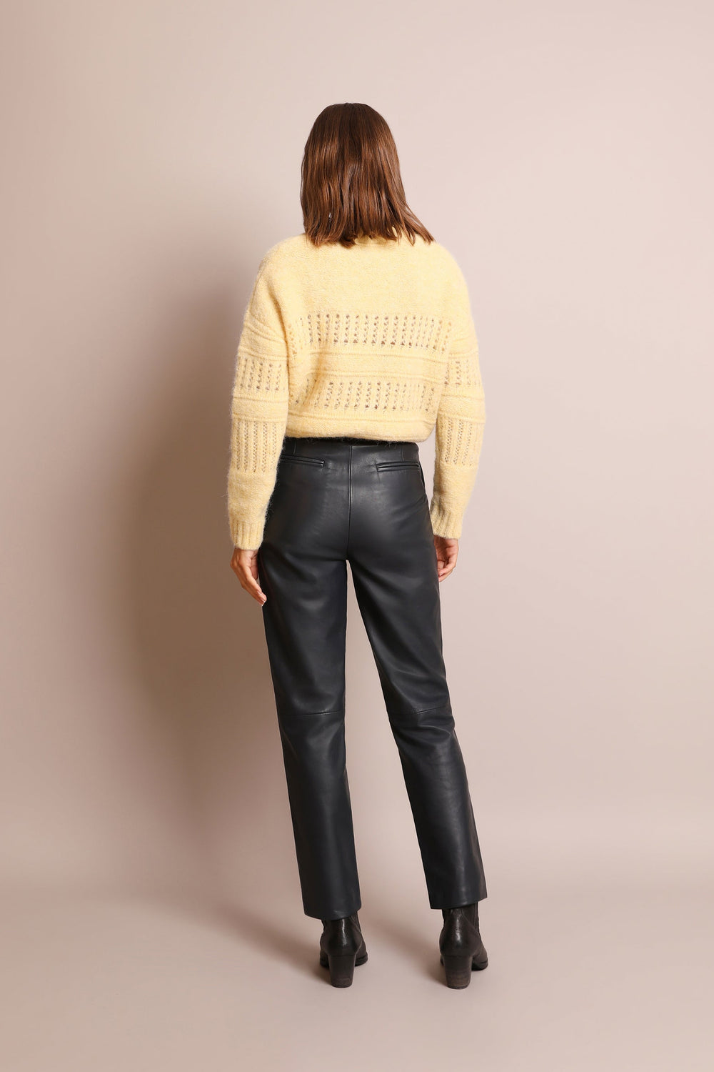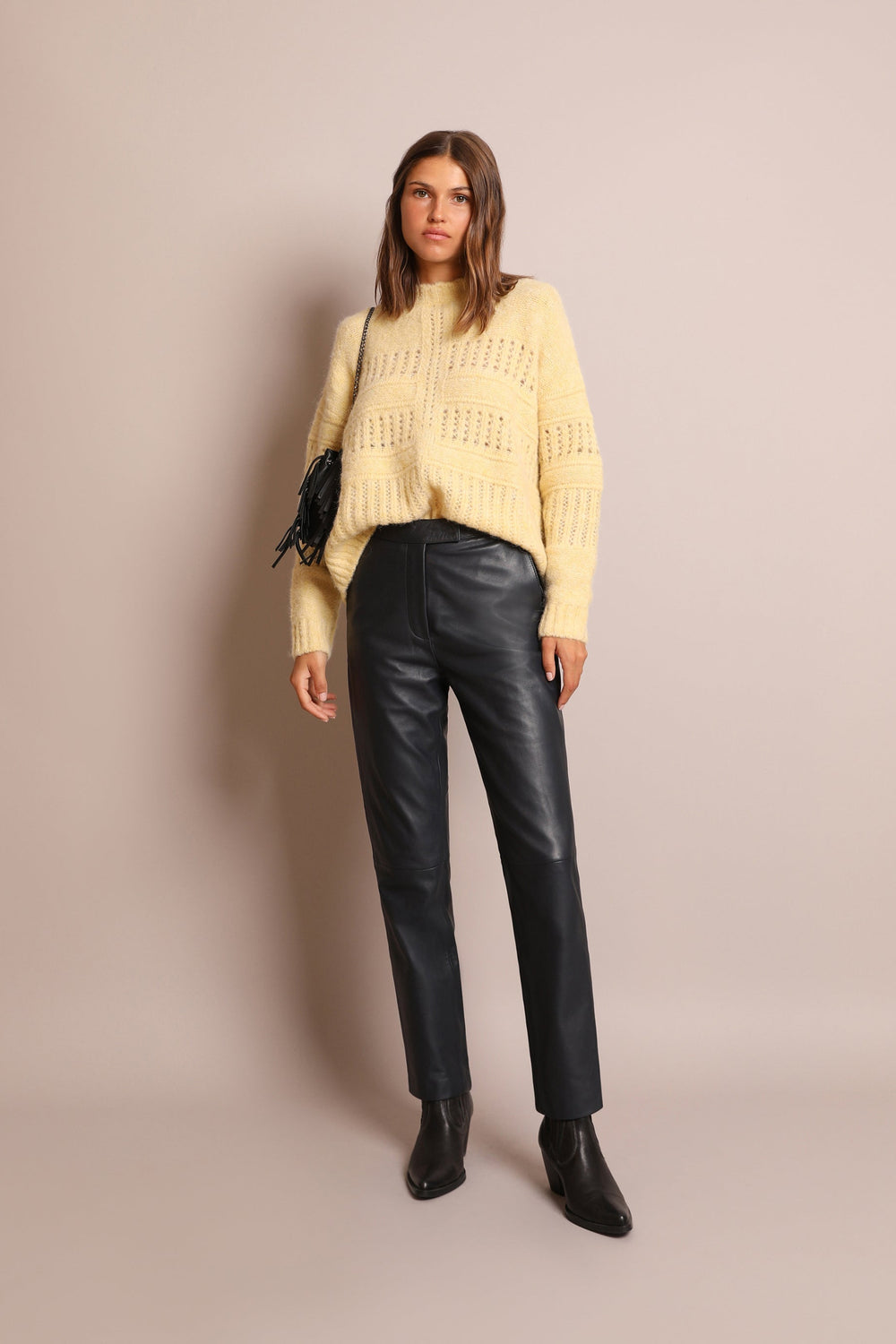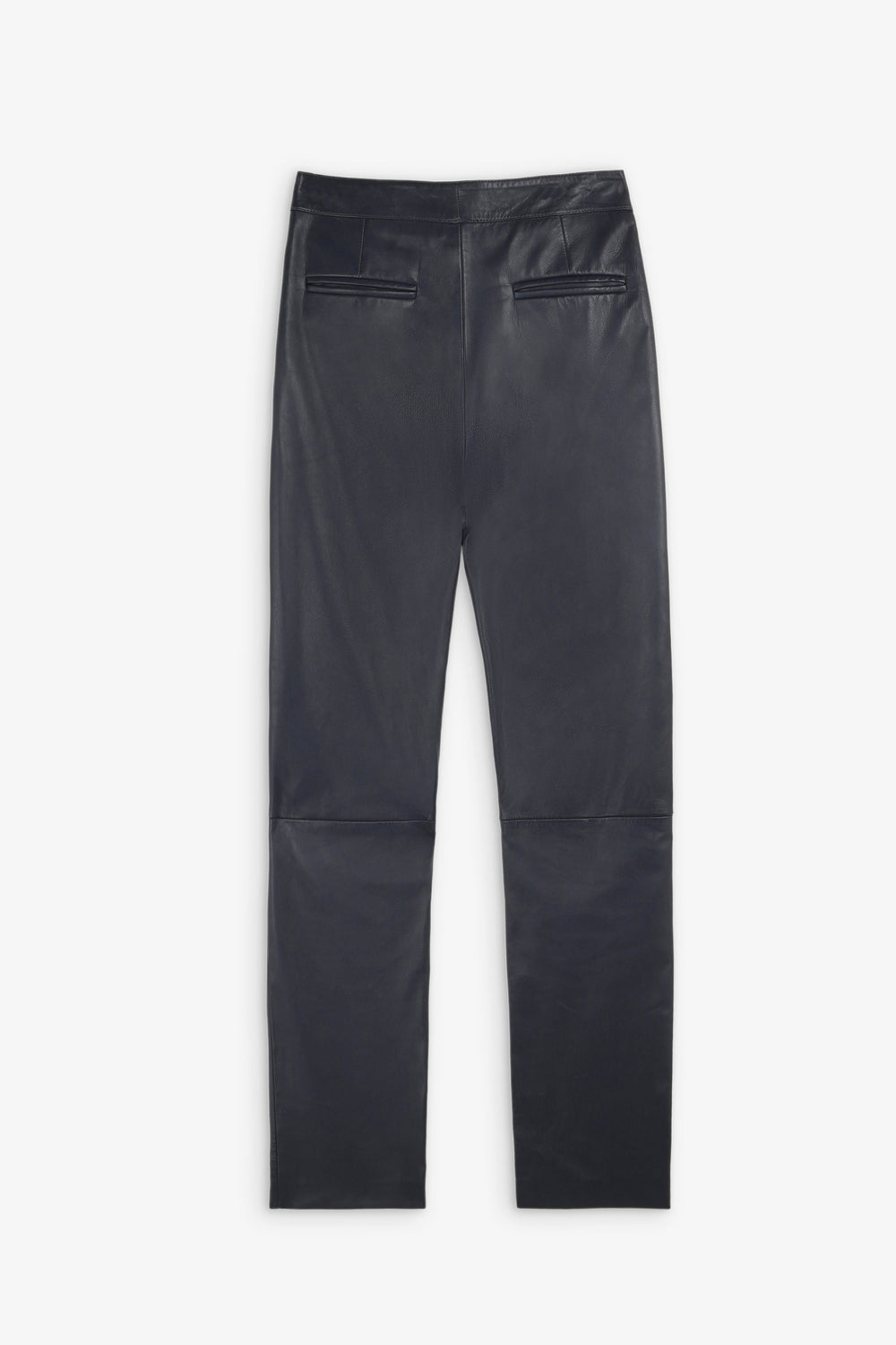 Calças com corte tipo chino confecionadas em 100% pele. Corte Regular Fit, fecho com colchete prolongado na cintura e fecho de correr e bolsos laterais e traseiros inseridos.