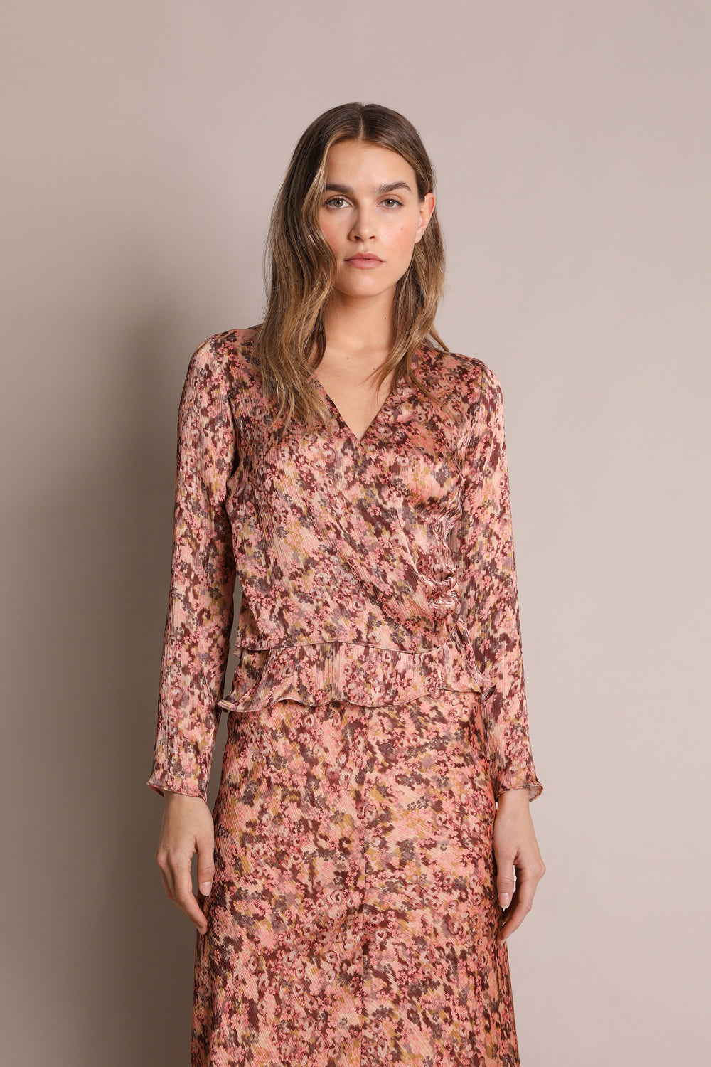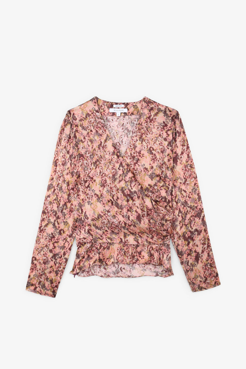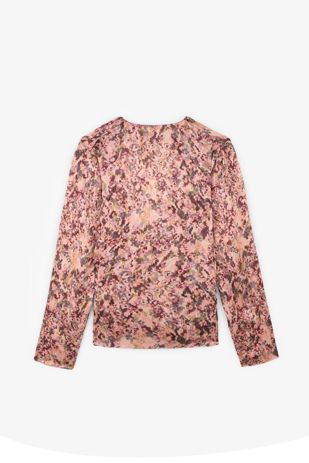 Camisa estampada. Confecionada em tecido fluido, decote em bico, manga comprida e cruzada