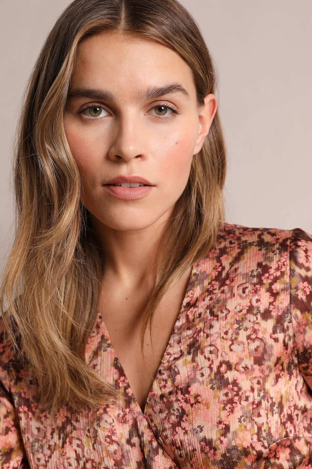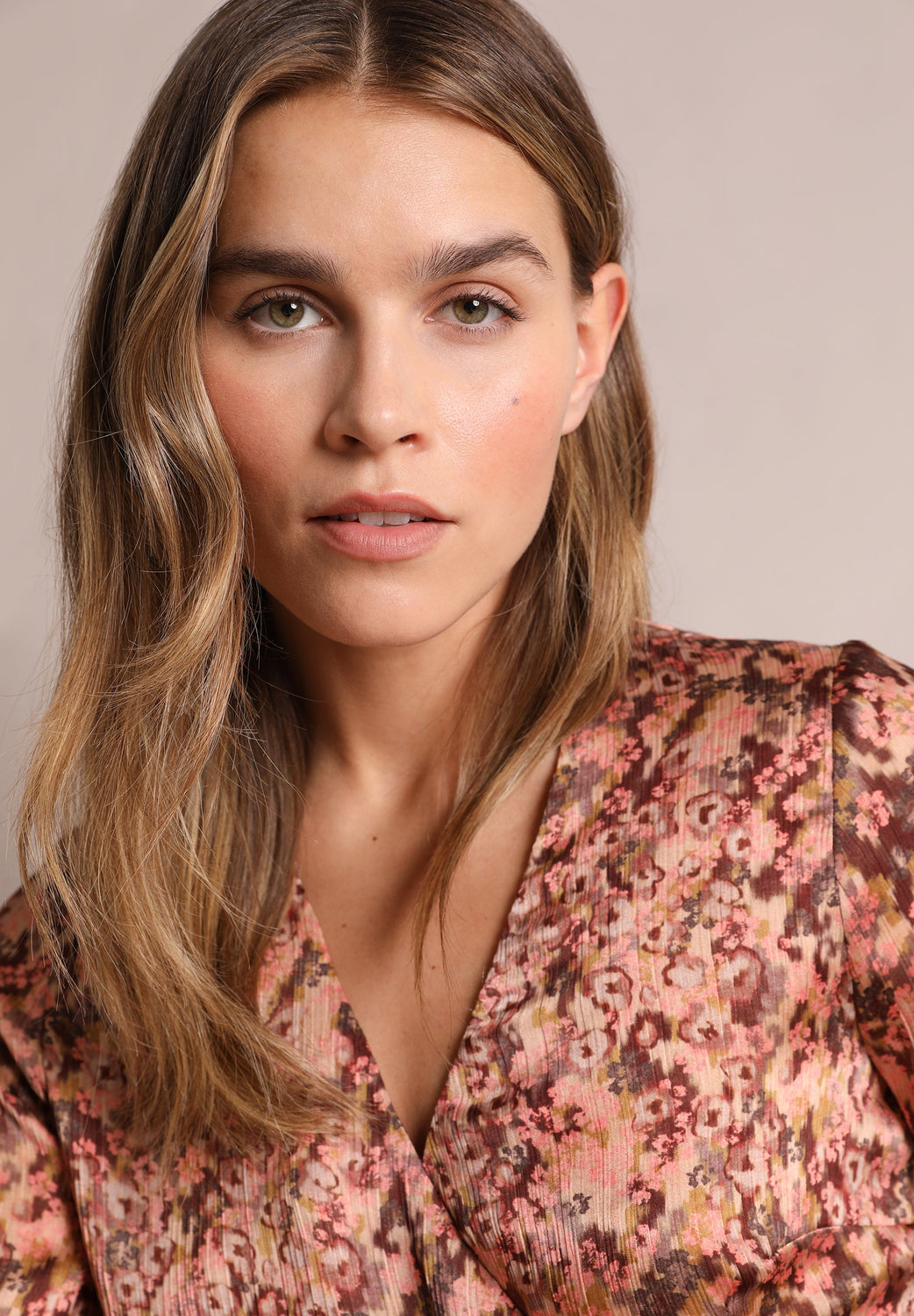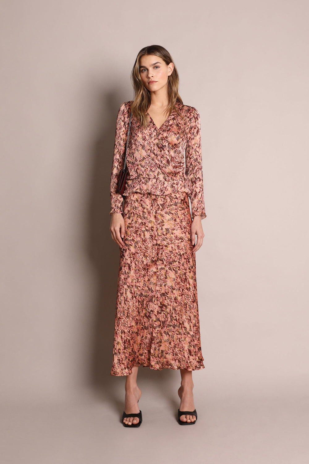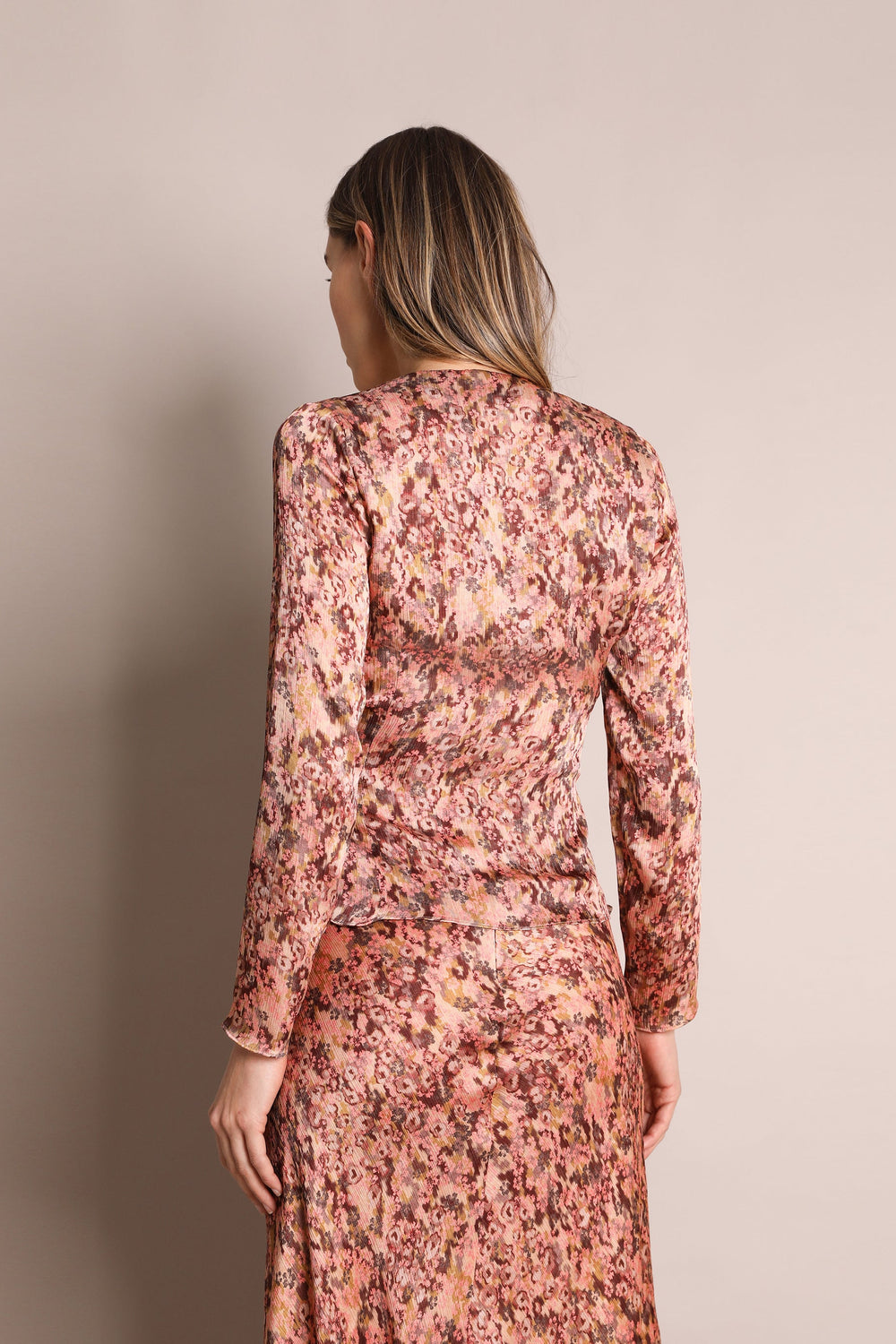 Camisa estampada. Confecionada em tecido fluido, decote em bico, manga comprida e cruzada