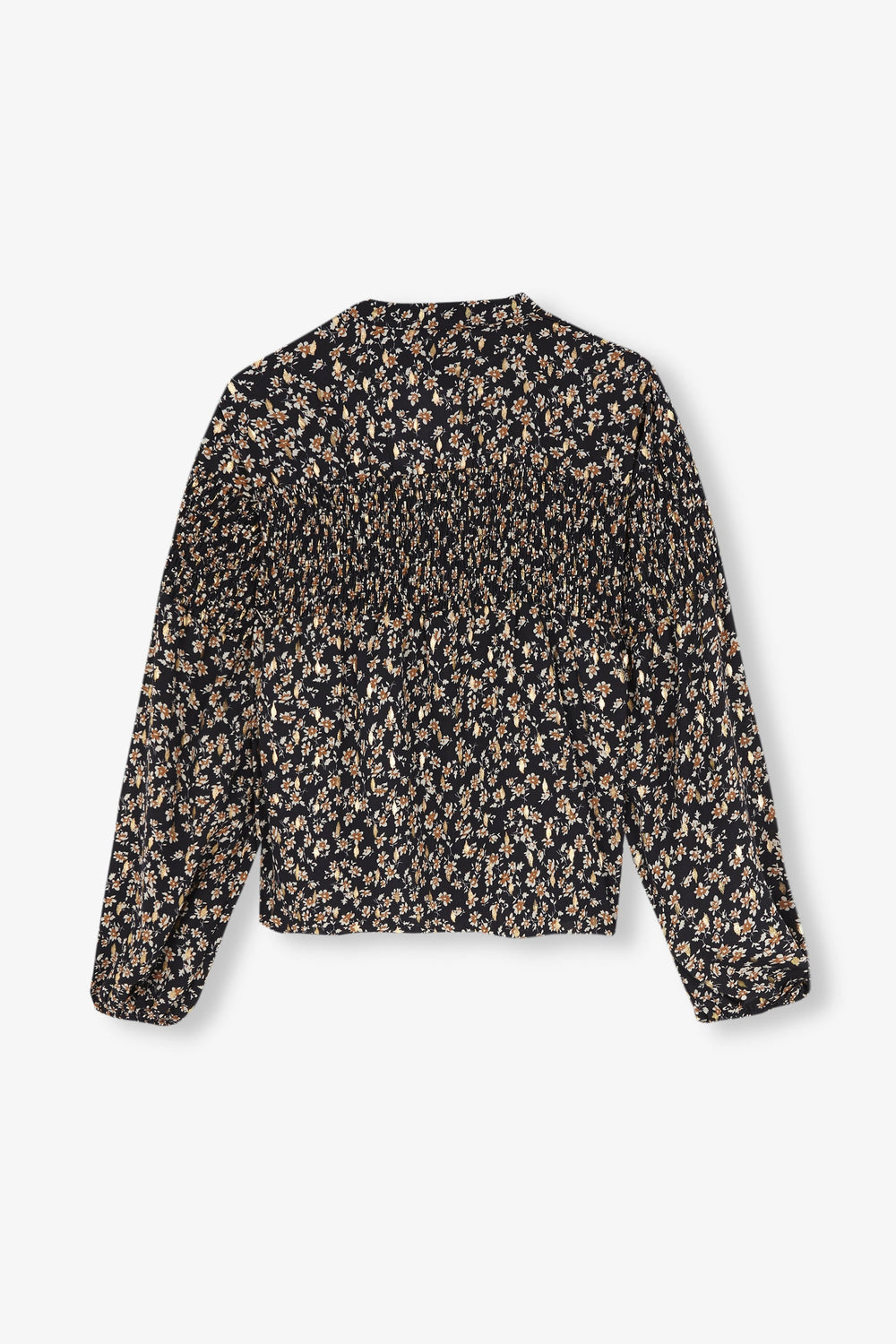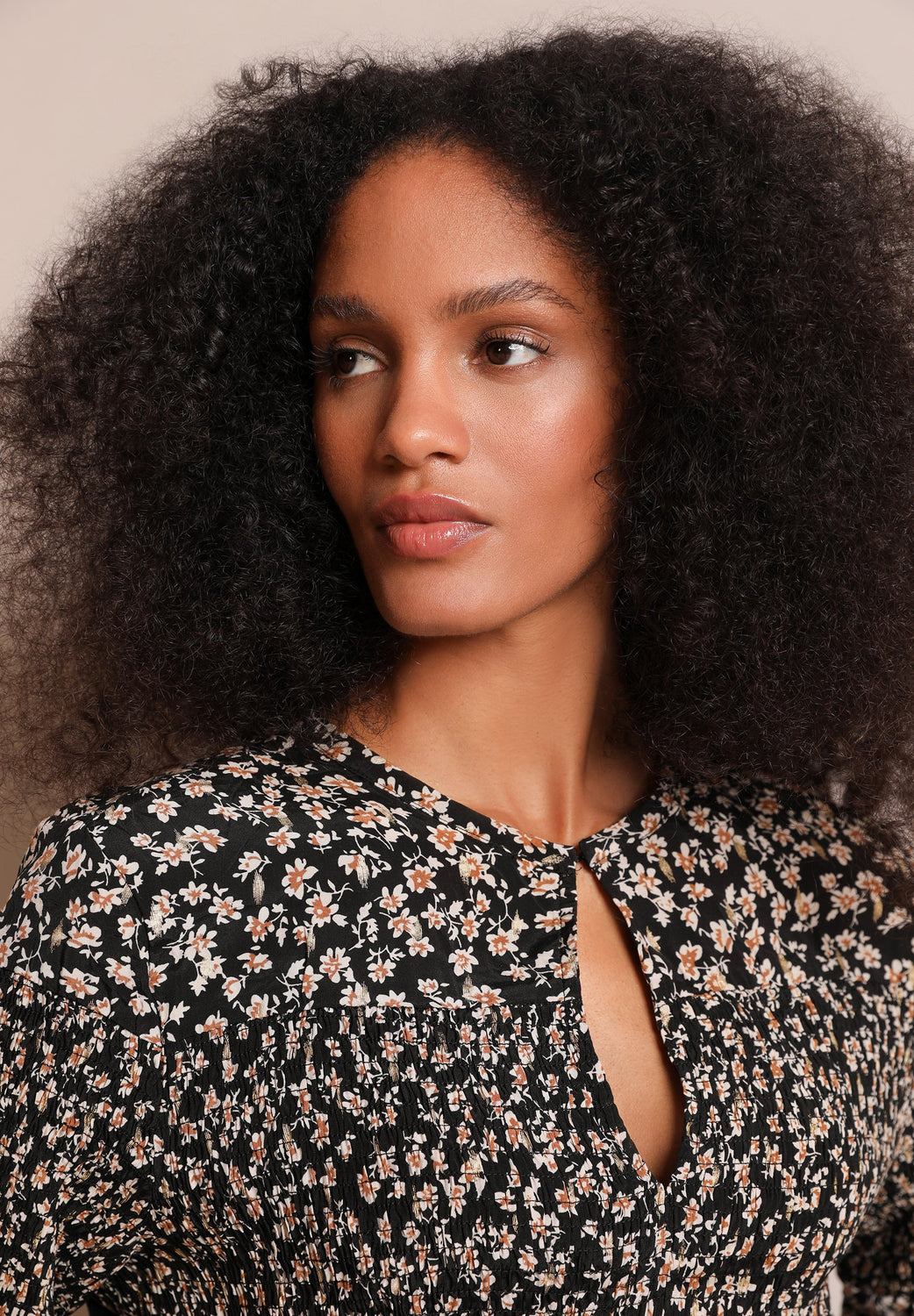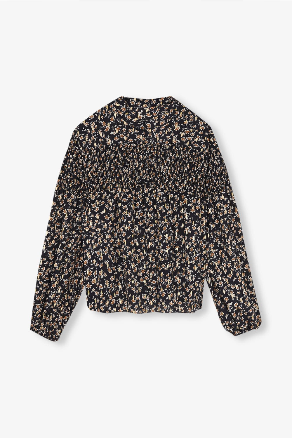 Blusa de flores confecionada em tecido fluido. Corte Slim Fit, decote redondo com abertura no decote e manga comprida. Pormenor de favo de mel no peito.