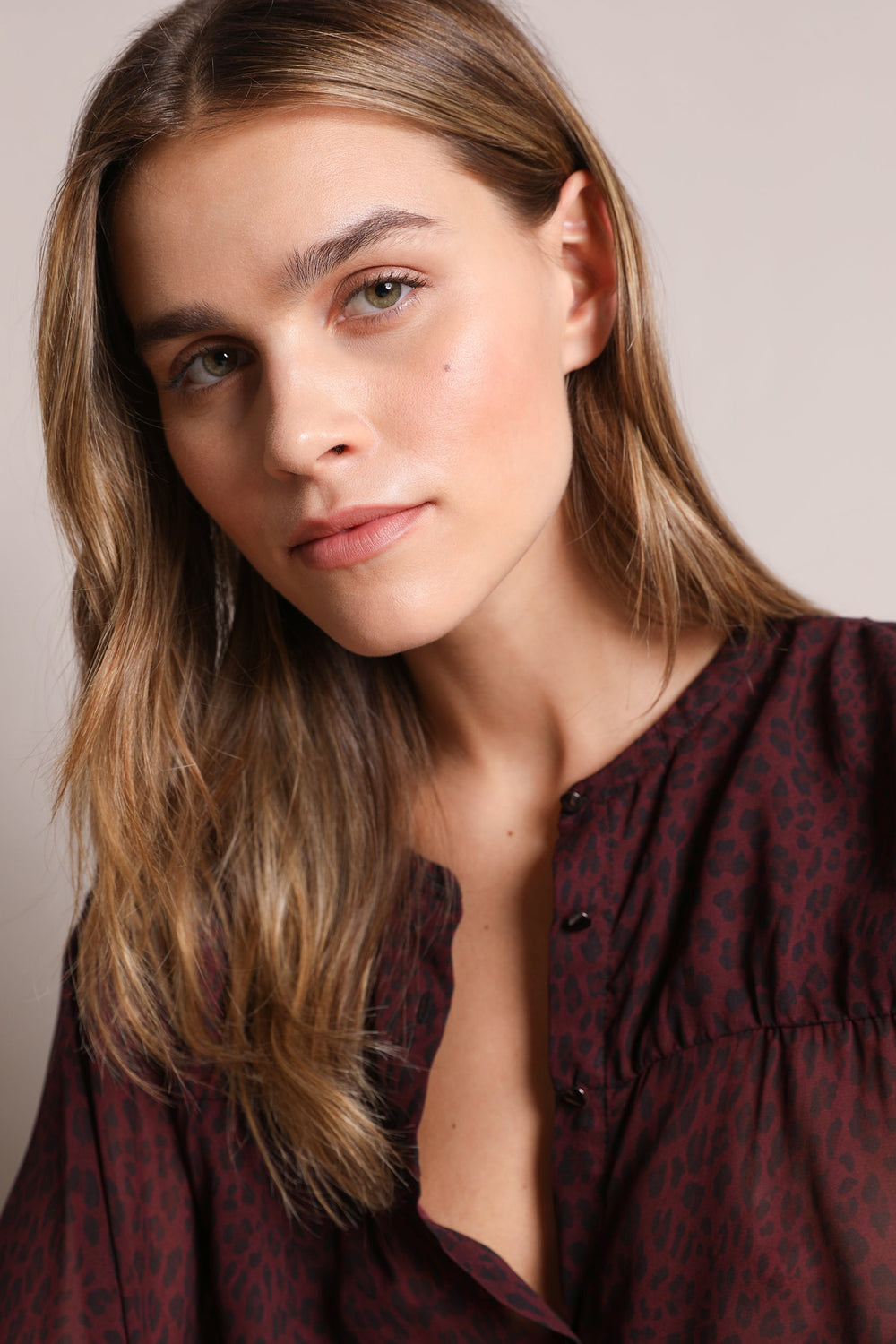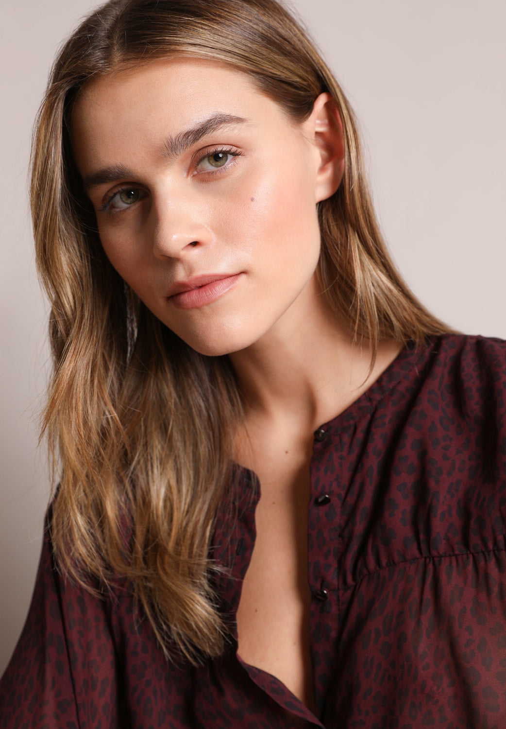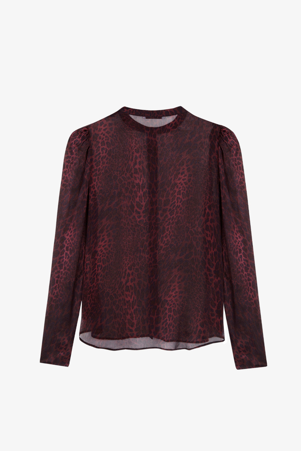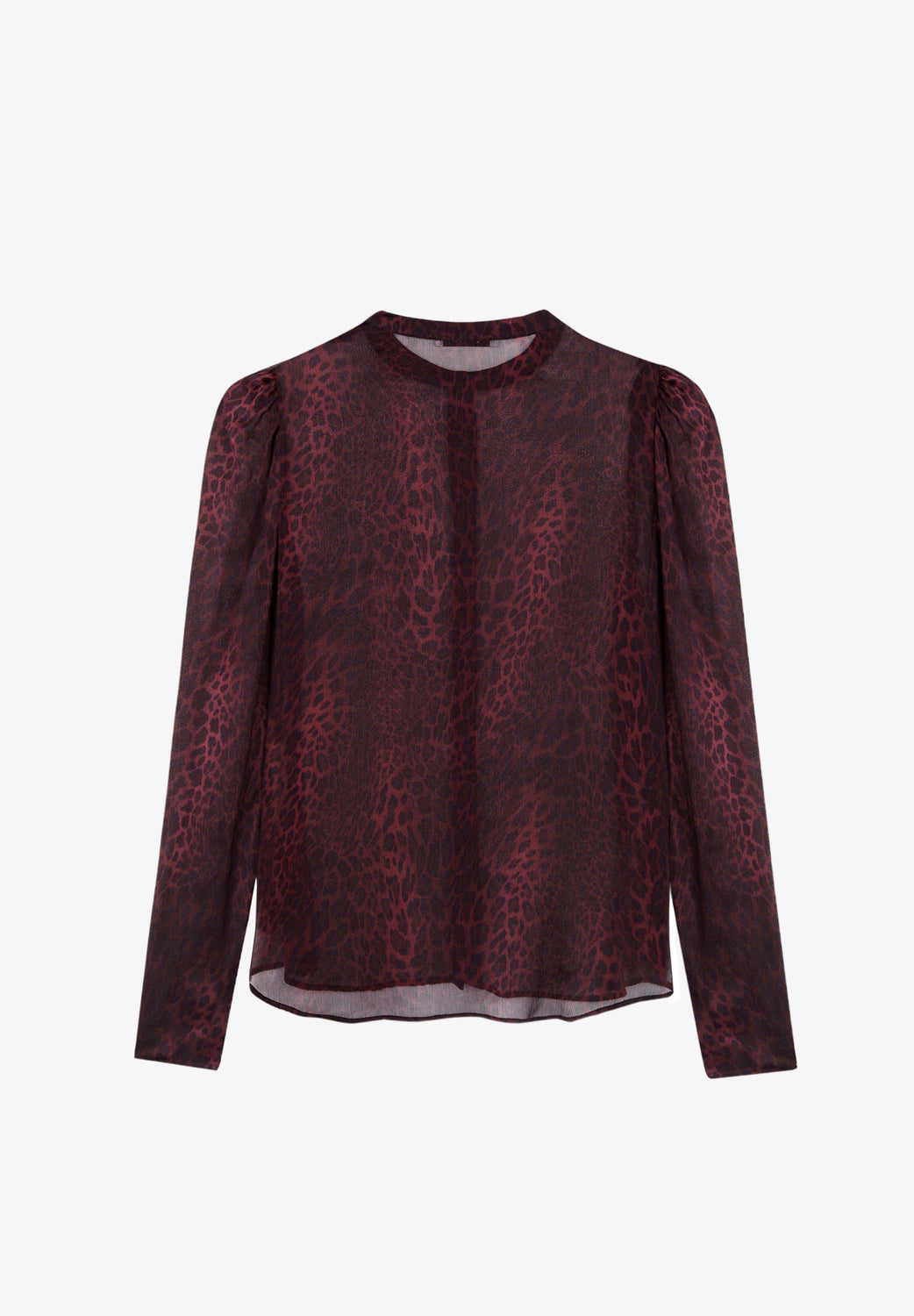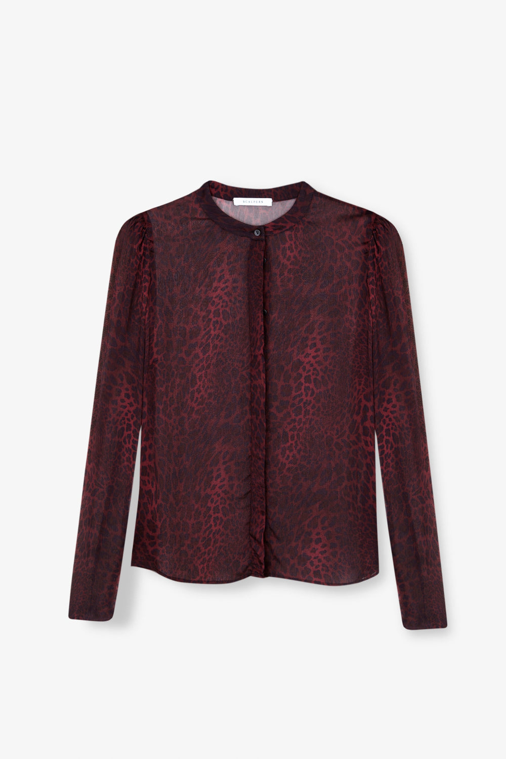 Blusa semitransparente com estampado animal confecionada em tecido fluido. Corte Regular Fit, gola com decote em bico e fecho com botões. Manga comprida com pormenor de franzido nos ombros.