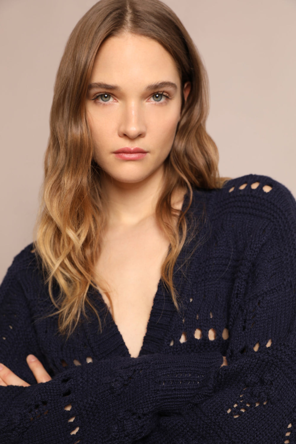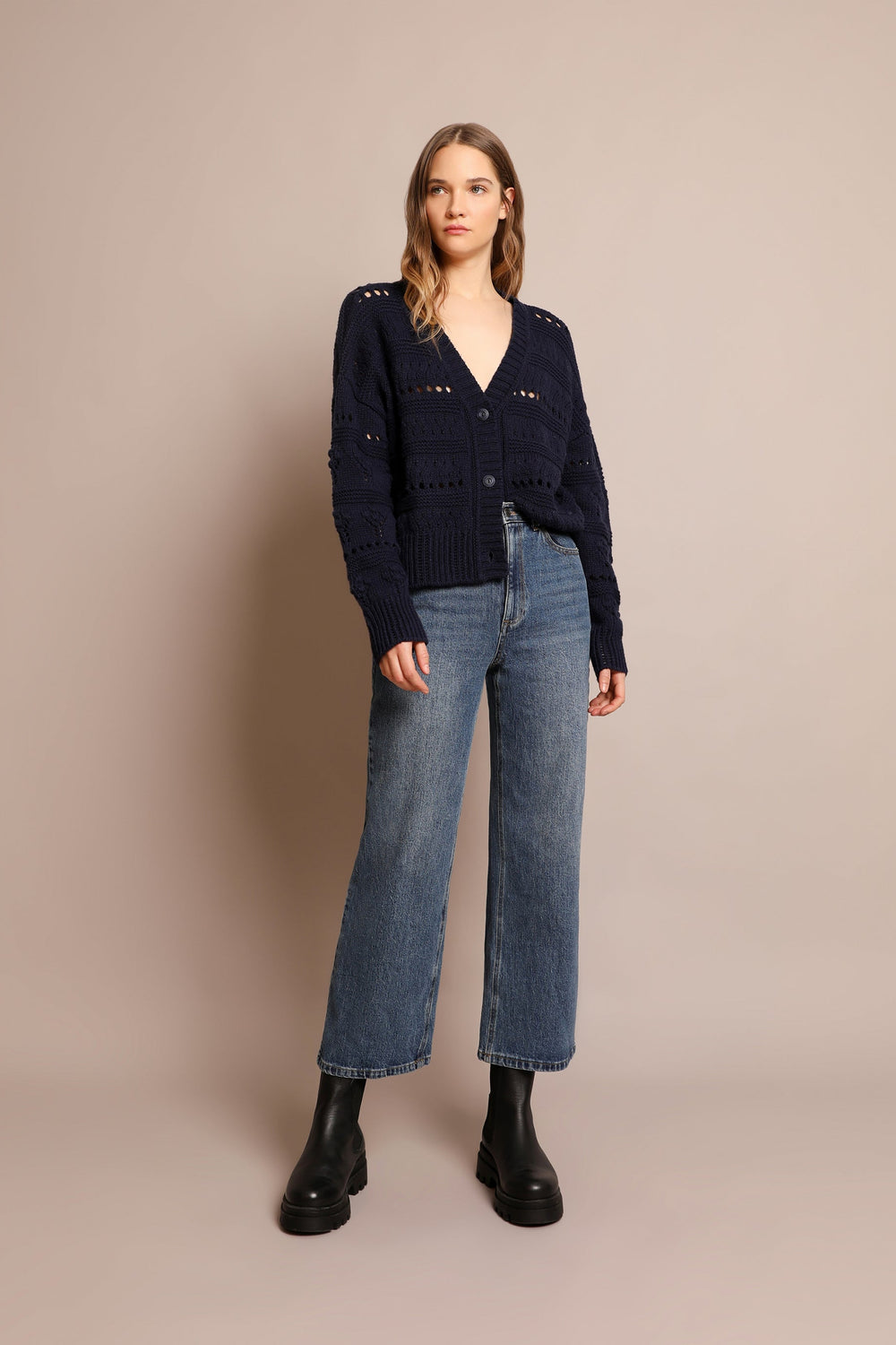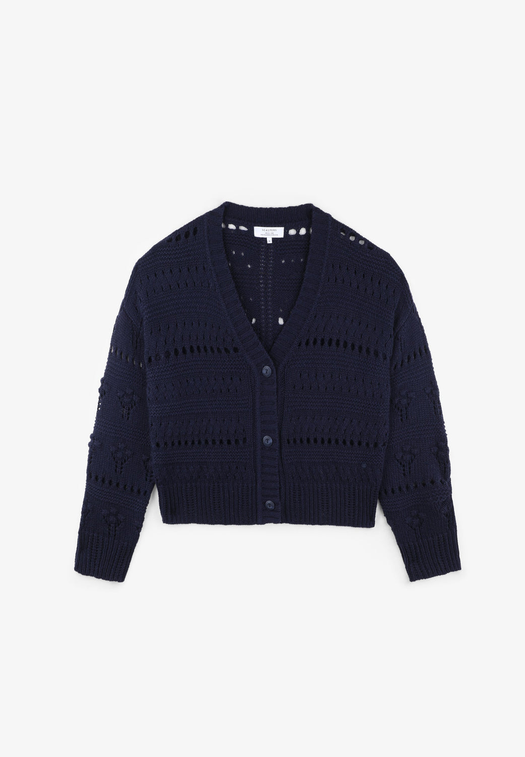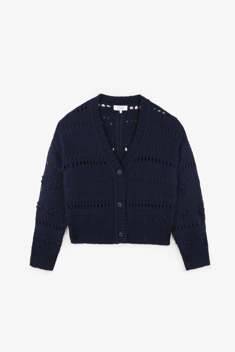 Cardigan de malha com rendilhado, confecionado em mistura de algodão e lã. Corte Regular Fit, gola com decote em V e fecho com botões. Manga comprida terminada em nervuras.