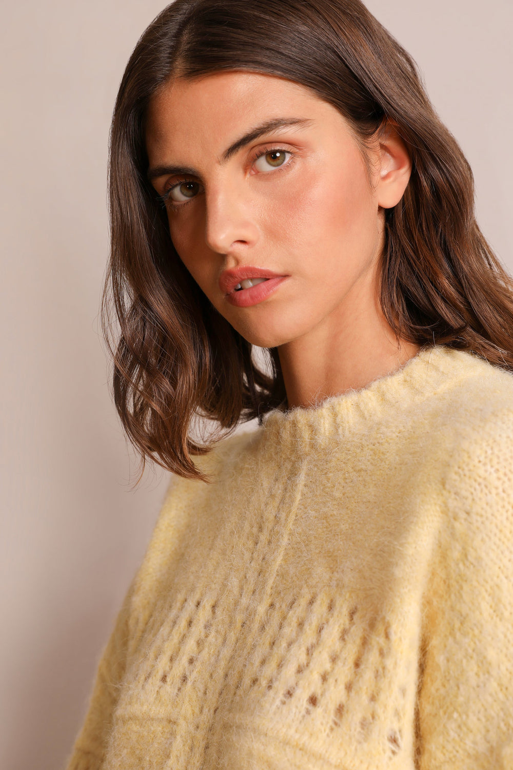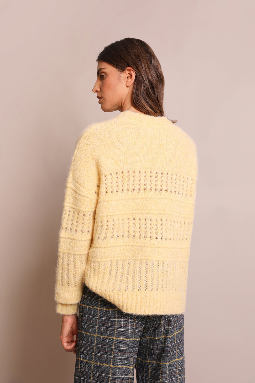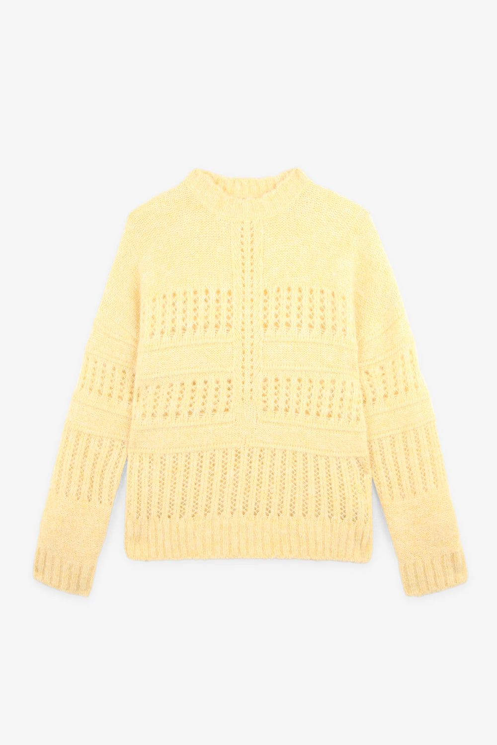 Sweater com pormenor de rendilhado confecionada em mistura de lã, alpaca e poliéster reciclado. Corte Regular Fit, decote redondo e manga comprida.