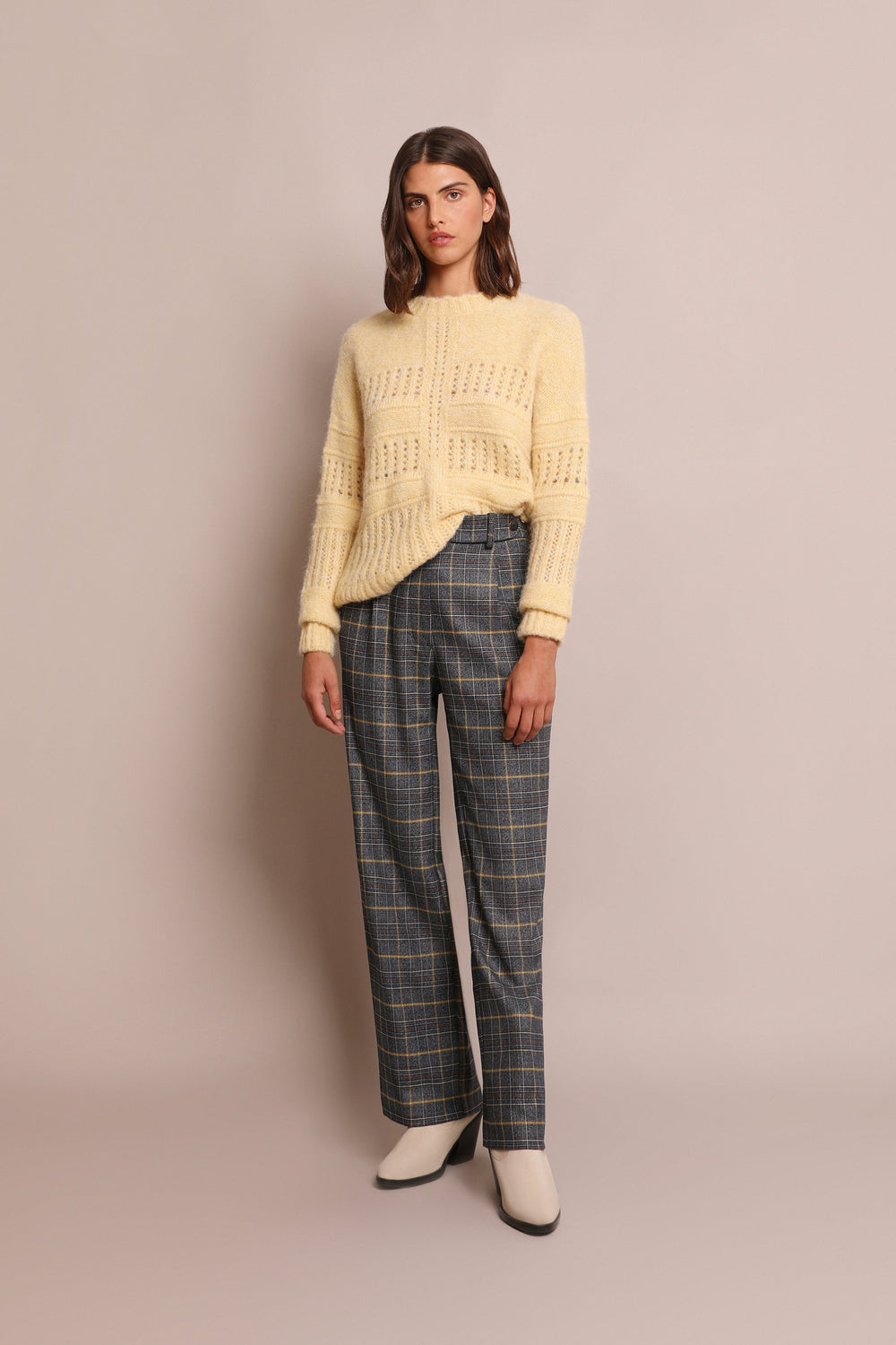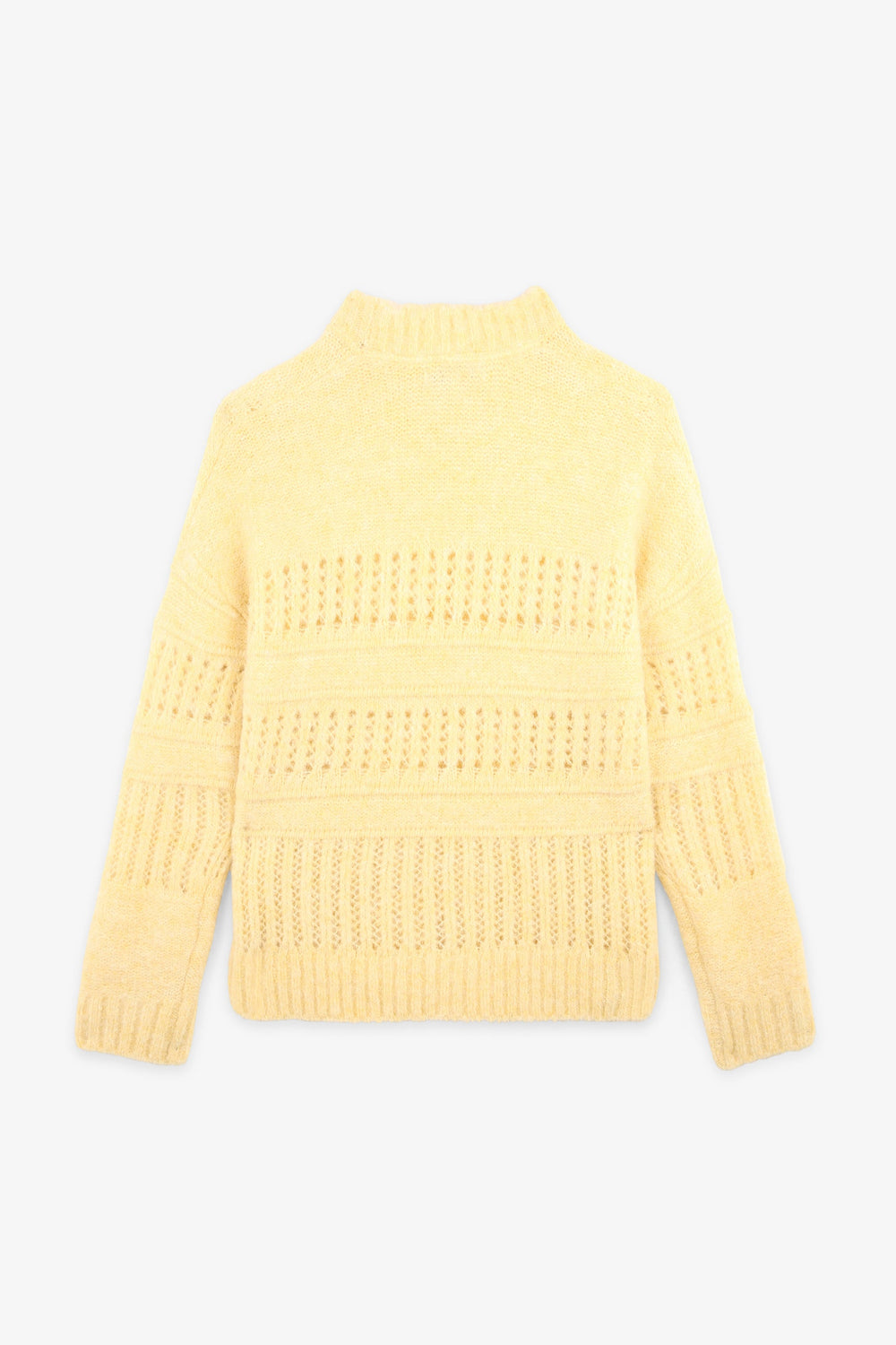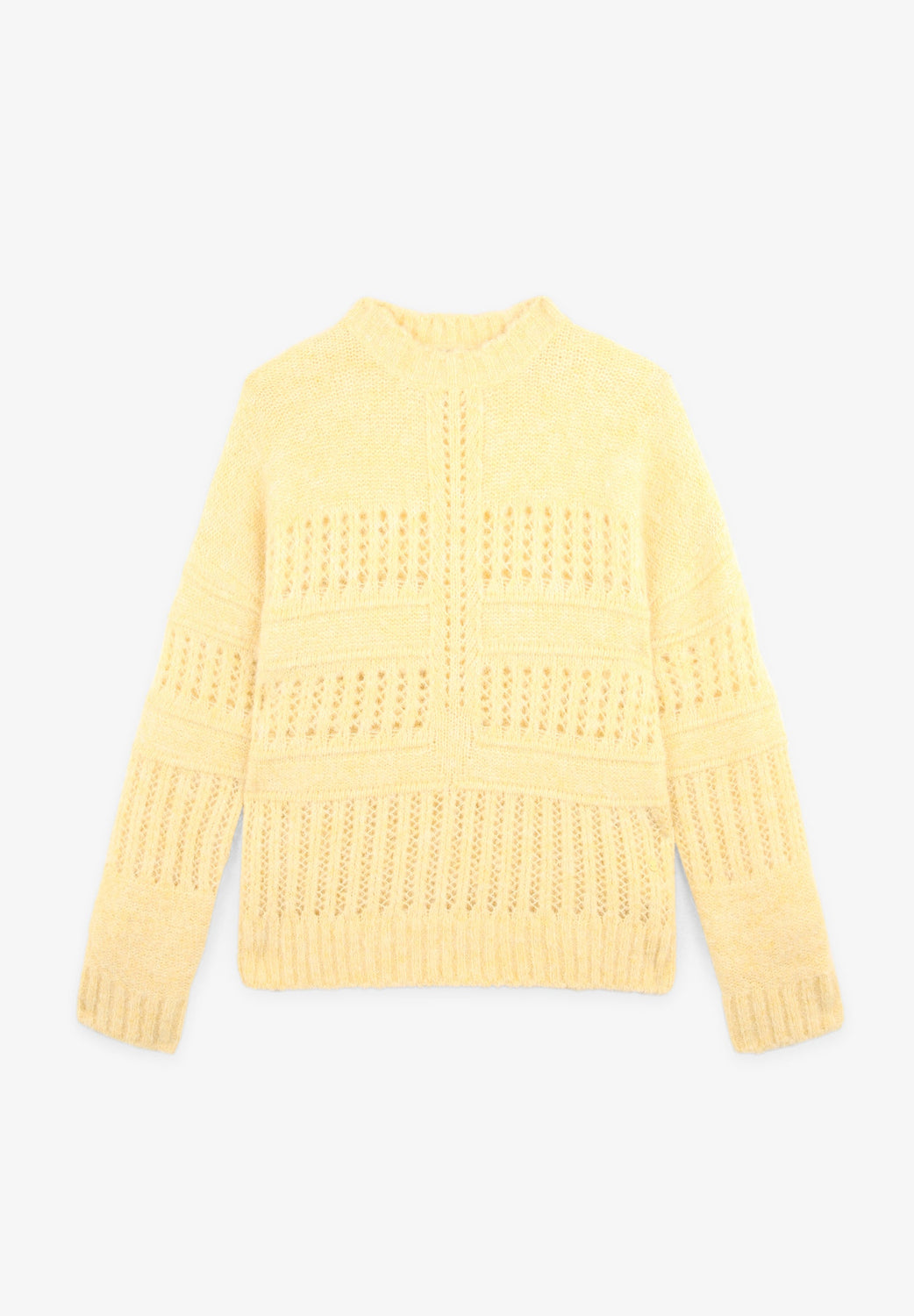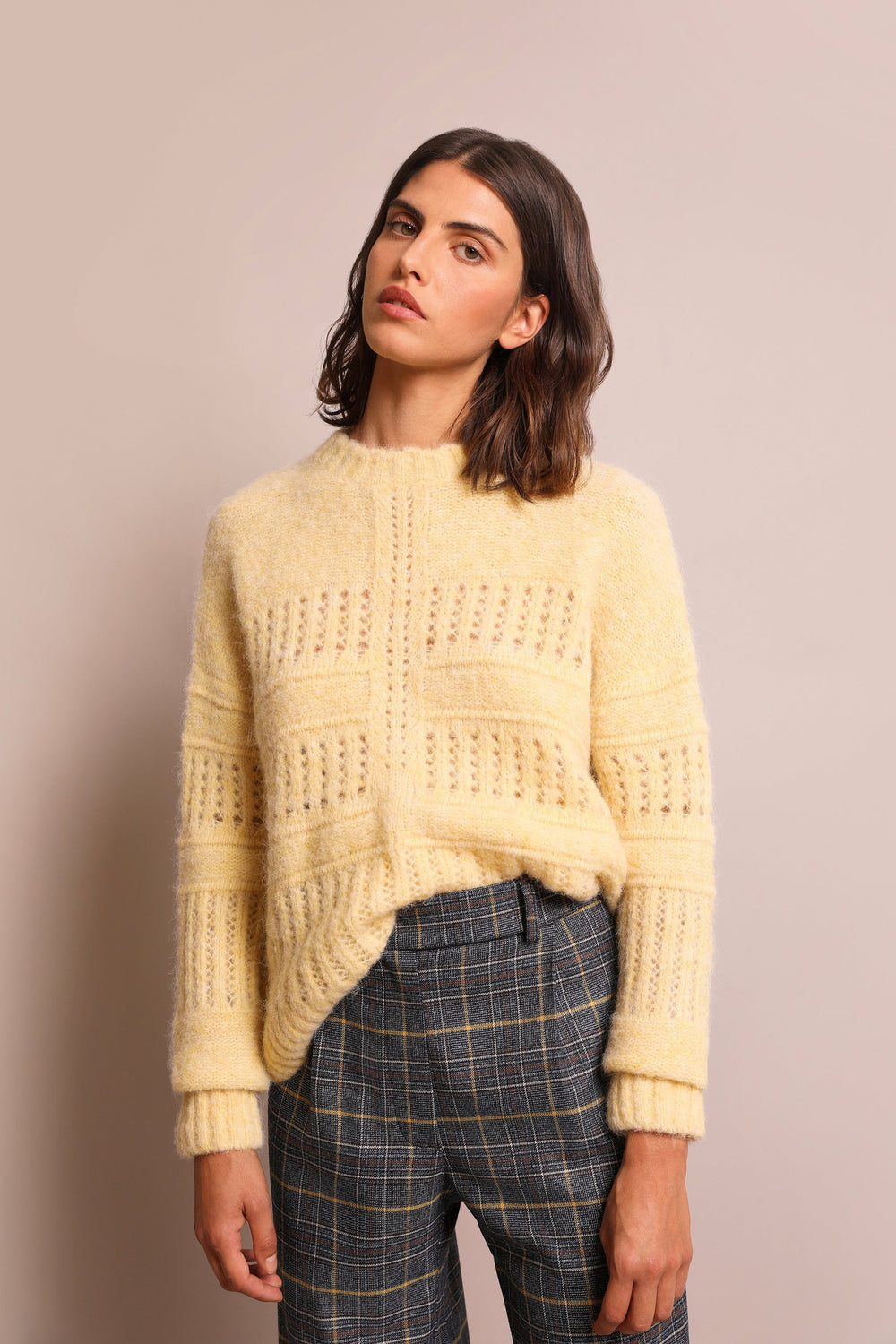 Sweater com pormenor de rendilhado confecionada em mistura de lã, alpaca e poliéster reciclado. Corte Regular Fit, decote redondo e manga comprida.