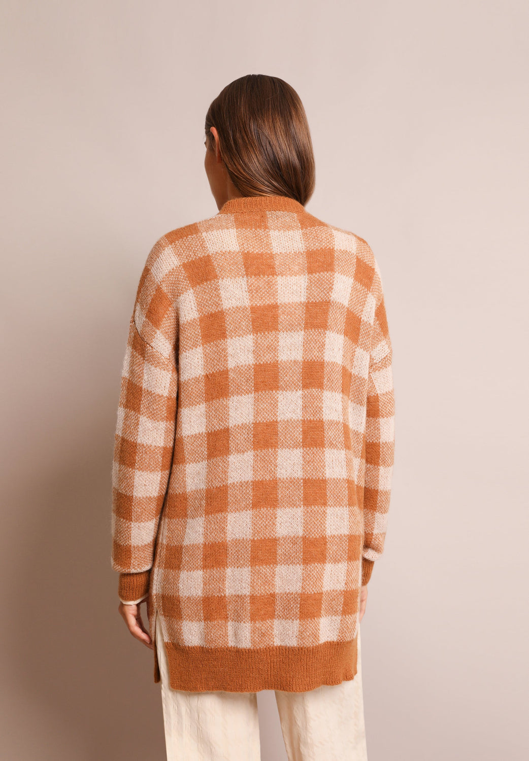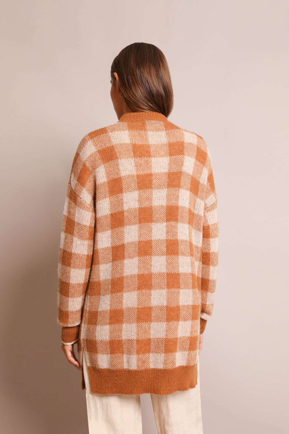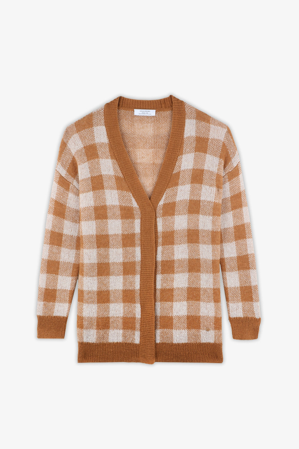 Cardigan de xadrez confecionado em mistura de lã e mohair. Corte Regular Fit, decote em V e fecho com botões. Manga comprida e aberturas laterais.